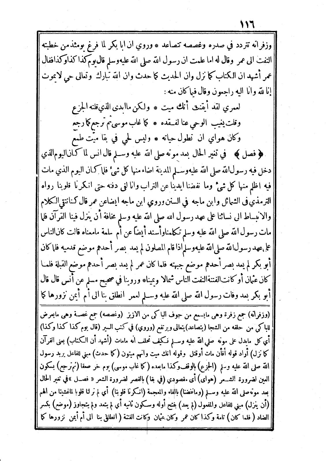 (فصل) في تغير الحال بعد موته صلى الله عليه وسلم قال انس لما كان اليوم الذي دخل فيه رسول الله صلى الله عليه وسلم المدينة اضاء منها كل شيء فلما كان اليوم الذي مات فيه اظلم منها كل شيء وما نفضنا ايدينا عن التراب وانا لفي دفنه حتى انكرنا قلوبنا رواه الترمذي في الشمائل وابن ماجه في السنن وروي ابن ماجه ايضا عن عمر قال كنا نتقي الكلام والانبساط الى نسائنا على عهد رسول الله صلى الله عليه وسلم مخافة أن ينزل فينا القرآن فلما مات رسول الله صلى الله عليه وسلم تكلمنا وأسند أيضا عن أم سلمة ما معناه قالت كان الناس على عهد رسول الله صلى الله عليه وسلم اذا قام المصلون لم يعد بصر أحدهم موضع قدميه فلما كان أبو بكر لم يعد بصر أحدهم موضع جبهته فلما كان عمر لم يعد بصر أحدهم موضع القبلة فلما كان عثمان أو كانت الفتنة التفت الناس شمالا ويمينا* وروينا في صحيح مسلم عن أنس قال قال أبو بكر بعد وفات رسول الله صلى الله عليه وسلم لعمر انطلق بنا الى أم أيمن نزورها كما (وزفراته) جمع زفرة وهى ما يسمع من جوف الباكى من الازيز (وغصصه) جمع غصة وهى ما يعرض للباكى من حلقه من الشجا (يتصاعد) يتعالى ويرتفع (وروي) في كتب السير (قال يوم كذا كذا وكذا) أي كل ما يدل على موته صلى الله عليه وسلم فكيف تحلف انه ما مات (أشهد أن الكتاب) يعنى القرآن (كما نزل) أراد قوله أَفَإِنْ ماتَ أَوْ قُتِلَ وقوله إِنَّكَ مَيِّتٌ وَإِنَّهُمْ مَيِّتُونَ (كما حدث) مبني للفاعل يريد رسول الله صلى الله عليه وسلم (الجزع) بالوقف وكذا ما بعده (كما غاب موسى) يوم خر صعقا (ثم ترجع) بسكون العين لضرورة الشعر (هواى) أى مقصودي (في بقا) بالقصر لضرورة الشعر «فصل» في تغير الحال بعد موته صلى الله عليه وسلم (وما نفضنا) بالفاء والمعجمة (انكرنا قلوبنا) أي لم نرلنا قلوبا لما غشينا من الهم (أن ينزل) مبني للفاعل والمفعول (لم يعد) بفتح أوله وسكون ثانيه أي لم يتعد ولم يتجاوز (موضع) بكسر الضاد (فلما كان) تامة وكذا كان عمر وكان عثمان وكانت الفتنة (انطلق بنا الى أم أيمن نزورها كما