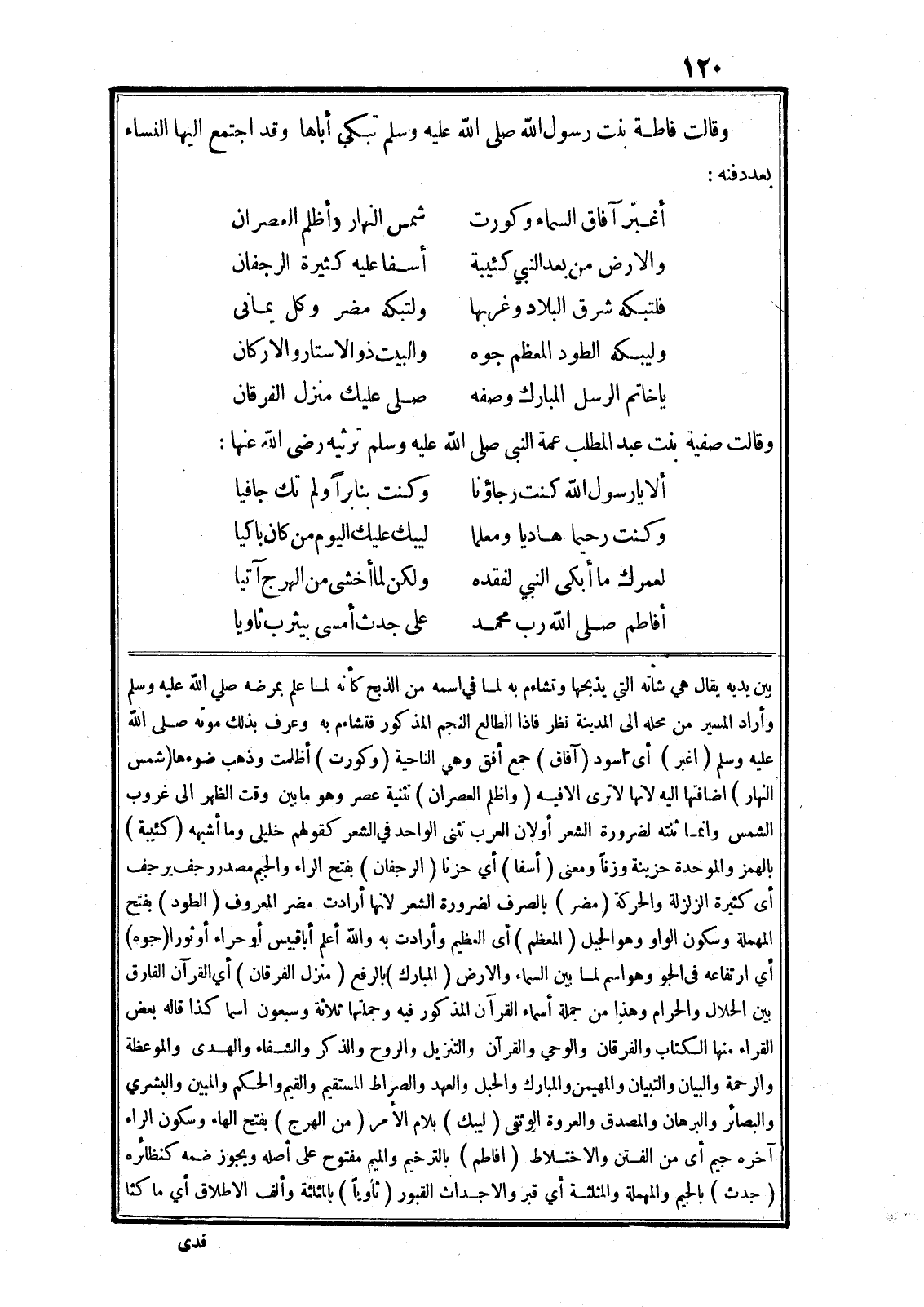 بين يديه يقال هي شاته التي يذبحها وتشاءم به لما في اسمه من الذبح كأنه لما علم بمرضه صلى الله عليه وسلم وأراد المسير من محله الى المدينة نظر فاذا الطالع النجم المذكور فتشاءم به وعرف بذلك موته صلى الله عليه وسلم (اغبر) أى اسود (آفاق) جمع أفق وهي الناحية (وكورت) أظلمت وذهب ضوءها (شمس النهار) اضافتها اليه لانها لا ترى الا فيه (واظلم العصران) تثنية عصر وهو ما بين وقت الظهر الى غروب الشمس وانما ثنته لضرورة الشعر أو لان العرب تثنى الواحد في الشعر كقولهم خليلى وما أشبهه (كئيبة) بالهمز والموحدة حزينة وزنا ومعنى (أسفا) أي حزنا (الرجفان) بفتح الراء والجيم مصدر رجف يرجف أى كثيرة الزلزلة والحركة (مضر) بالصرف لضرورة الشعر لانها أرادت مضر المعروف (الطود) بفتح المهملة وسكون الواو وهو الجبل (المعظم) أى العظيم وأرادت به والله أعلم أبا قبيس أو حراء أو ثورا (جوه) أي ارتفاعه في الجو وهو اسم لما بين السماء والارض (المبارك) بالرفع (منزل الفرقان) أي القرآن الفارق بين الحلال والحرام وهذا من جملة أسماء القرآن المذكور فيه وجملتها ثلاثة وسبعون اسما كذا قاله بعض القراء منها الكتاب والفرقان والوحي والقرآن والتنزيل والروح والذكر والشفاء والهدى والموعظة والرحمة والبيان والتبيان والمهيمن والمبارك والحبل والعهد والصراط المستقيم والقيم والحكم والمبين والبشري والبصائر والبرهان والمصدق والعروة الوثقى (ليبك) بلام الأمر (من الهرج) بفتح الهاء وسكون الراء آخره جيم أى من الفتن والاختلاط (افاطم) بالترخيم والميم مفتوح على أصله ويجوز ضمه كنظائره (جدث) بالجيم والمهملة والمثلثة أي قبر والاجداث القبور (ثاويا) بالمثلثة وألف الاطلاق أي ماكثا