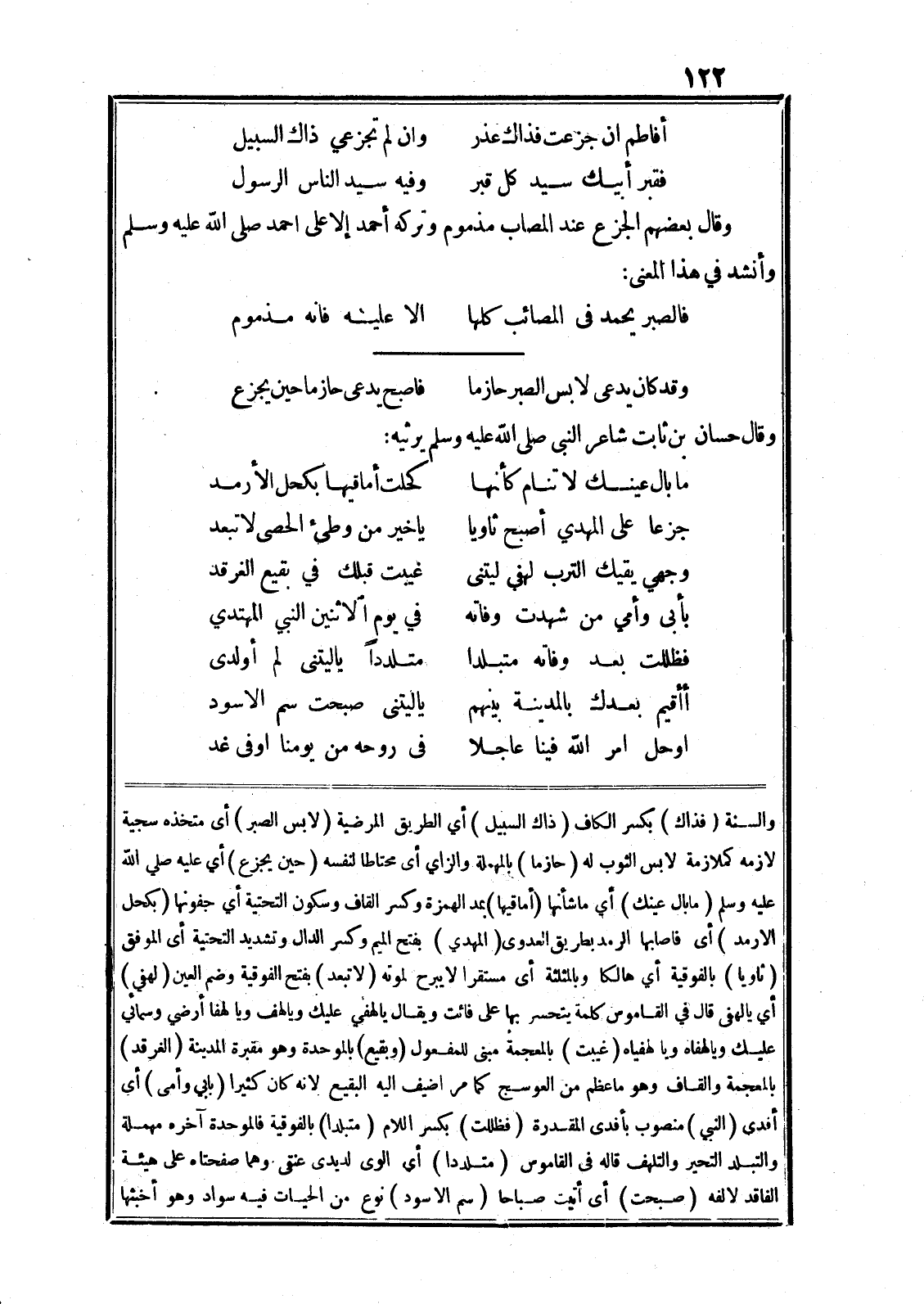 والسنة (فذاك) بكسر الكاف (ذاك السبيل) أي الطريق المرضية (لابس الصبر) أى متخذه سجية لازمه كملازمة لابس الثوب له (حازما) بالمهملة والزاي أى محتاطا لنفسه (حين يجزع) أي عليه صلى الله عليه وسلم (ما بال عينك) أي ما شأنها (أماقيها) بمد الهمزة وكسر القاف وسكون التحتية أي جفونها (بكحل الارمد) أى فاصابها الرمد بطريق العدوى (المهدي) بفتح الميم وكسر الدال وتشديد التحتية أى الموفق (ثاويا) بالفوقية أي هالكا وبالمثلثة أى مستقرا لا يبرح لموته (لا تبعد) بفتح الفوقية وضم العين (لهفي) أي يا لهفي قال في القاموس كلمة يتحسر بها على فائت ويقال يا لهفي عليك ويا لهف ويا لهفا أرضي وسمائي عليك ويا لهفاه ويا لهفياه (غيبت) بالمعجمة مبنى للمفعول (وبقيع) بالموحدة وهو مقبرة المدينة (الغرقد) بالمعجمة والقاف وهو ما عظم من العوسج كما مر اضيف اليه البقيع لانه كان كثيرا (بابي وأمى) أى أفدى (النبي) منصوب بأفدى المقدرة (فظللت) بكسر اللام (متبلدا) بالفوقية فالموحدة آخره مهملة والتبلد التحير والتلهف قاله في القاموس (متلددا) أي الوى لديدى عنقى وهما صفحتاه على هيئة الفاقد لالفه (صبحت) أى أتيت صباحا (سم الاسود) نوع من الحيات فيه سواد وهو أخبثها
