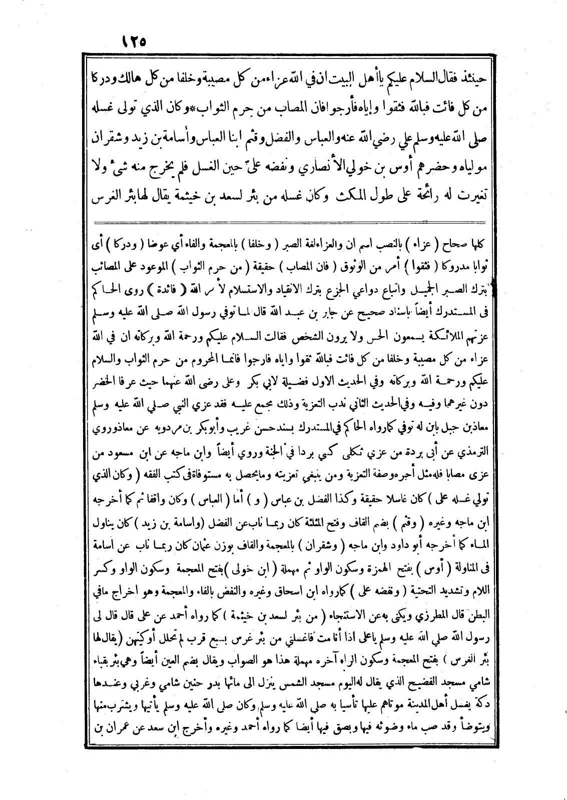 وكان الذي تولى غسله صلى الله عليه وسلم علي رضي الله عنه والعباس والفضل وقثم ابنا العباس وأسامة بن زيد وشقران مولياه وحضرهم أوس بن خولي الأنصاري ونفضه علىّ حين الغسل فلم يخرج منه شيء ولا تغيرت له رائحة على طول المكث وكان غسله من بئر لسعد بن خيثمة يقال لها بئر الغرس كلها صحاح (عزاء) بالنصب اسم ان والعزاء لغة الصبر (وخلفا) بالمعجمة والفاء أي عوضا (ودركا) أى ثوابا مدروكا (فثقوا) أمر من الوثوق (فان المصاب) حقيقة (من حرم الثواب) الموعود على المصائب بترك الصبر الجميل واتباع دواعي الجزع بترك الانقياد والاستسلام لأمر الله (فائدة) روى الحاكم في المستدرك أيضا باسناد صحيح عن جابر بن عبد الله قال لما توفي رسول الله صلى الله عليه وسلم عزتهم الملائكة يسمعون الحس ولا يرون الشخص فقالت السلام عليكم ورحمة الله وبركاته ان في الله عزاء من كل مصيبة وخلفا من كل فائت فبالله ثقوا واياه فارجوا فانما المحروم من حرم الثواب والسلام عليكم ورحمة الله وبركاته وفي الحديث الاول فضيلة لابي بكر وعلى رضى الله عنهما حيث عرفا الخضر دون غيرهما وفيه وفي الحديث الثاني ندب التعزية وذلك مجمع عليه فقد عزي النبي صلى الله عليه وسلم معاذ بن جبل بابن له توفي كما رواه الحاكم في المستدرك بسند حسن غريب وأبو بكر بن مردويه عن معاذ وروي الترمذي عن أبى بردة من عزي ثكلى كسي بردا في الجنة وروي أيضا وابن ماجه عن ابن مسعود من عزى مصابا فله مثل أجره وصفة التعزية ومن ينبغي تعزيته وما يحصل به مستوفاة في كتب الفقه (وكان الذي تولي غسله على) كان غاسلا حقيقة وكذا الفضل بن عباس (و) أما (العباس) وكان واقفا ثم كما أخرجه ابن ماجه وغيره (وقثم) بضم القاف وفتح المثلثة كان ربما ناب عن الفضل (واسامة بن زيد) كان يناول الماء كما أخرجه أبو داود وابن ماجه (وشقران) بالمعجمة والقاف بوزن عثمان كان ربما ناب عن اسامة في المناولة (أوس) بفتح الهمزة وسكون الواو ثم مهملة (ابن خولى) بفتح المعجمة وسكون الواو وكسر اللام وتشديد التحتية (ونفضه على) كما رواه ابن اسحاق وغيره والنفض بالفاء والمعجمة وهو اخراج ما في البطن قال المطرزي ويكنى به عن الاستنجاء (من بئر لسعد بن خيثمة) كما رواه أحمد عن على قال قال لى رسول الله صلى الله عليه وسلم يا على اذا أنامت فاغسلني من بئر غرس بسبع قرب لم تحلل أو كيتهن (يقال لها بئر الغرس) بفتح المعجمة وسكون الراء آخره مهملة هذا هو الصواب ويقال بضم العين أيضا وهي بئر بقباء شامي مسجد الفضيح الذي يقال له اليوم مسجد الشمس ينزل الى مائها بدر حنين شامي وغربي وعندها دكة يغسل أهل المدينة موتاهم عليها تأسيا به صلى الله عليه وسلم وكان صلى الله عليه وسلم يأتيها ويشرب منها ويتوضأ وقد صب ماء وضوئه فيها وبصق فيها أيضا كما رواه أحمد وغيره وأخرج ابن سعد عن عمران بن