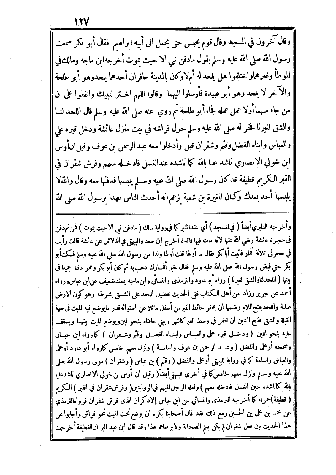 وقال آخرون في المسجد وقال قوم يحبس حتى يحمل الى أبيه ابراهيم فقال أبو بكر سمعت رسول الله صلى الله عليه وسلم يقول ما دفن نبي الا حيث يموت أخرجه ابن ماجه ومالك في الموطأ وغيرهما واختلفوا هل يلحد له أم لا وكان بالمدينة حافران أحدهما يلحد وهو أبو طلحة والآخر لا يلحد وهو أبو عبيدة فأرسلوا اليهما وقالوا اللهم اختر لنبيك واتفقوا على ان من جاء منهما أولا عمل عمله فجاء أبو طلحة ثم روي عنه صلى الله عليه وسلم قال اللحد لنا والشق لغيرنا فحفر له صلى الله عليه وسلم حول فراشه في بيت منزل عائشة ودخل قبره علي والعباس وابناه الفضل وقثم وشقران قيل وأدخلوا معه عبد الرحمن بن عوف وقيل ان أوس ابن خولي الانصاري ناشد عليا بالله كما ناشده عند الغسل فادخله معهم وفرش شقران في القبر الكريم قطيفة قد كان رسول الله صلى الله عليه وسلم يلبسها فدفنها معه وقال والله لا يلبسها أحد بعدك وكان المغيرة بن شعبة يزعم انه أحدث الناس عهدا برسول الله صلى الله وأخرجه الطبري أيضا (في المسجد) أي عند المنبر كما في رواية مالك (ما دفن نبى الا حيث يموت) فمن ثم دفن في حجرة عائشة رضي الله عنها لانه مات فيها فائدة أخرج ابن سعد والبيهقى في الدلائل عن عائشة قالت رأيت في حجرتى ثلاثة أقمار فاتيت أبا بكر فقال ما أولها قلت أولها ولدا من رسول الله صلى الله عليه وسلم فسكت أبو بكر حتى قبض رسول الله صلى الله عليه وسلم فقال خير أقمارك ذهب به ثم كان أبو بكر وعمر دفنا جميعا في بيتها (اللحد لنا والشق لغيرنا) رواه أبو داود والترمذى والنسائي وابن ماجه بسند ضعيف عن ابن عباس ورواه أحمد عن جرير وزاد من أهل الكتاب ففي الحديث تفضيل اللحد على الشق بشرطه وهو كون الارض صلبة واللحد بفتح اللام وضمها ان يحفر حائط القبر من أسفل مائلا عن استوائه قدر ما يوضع فيه الميت في جهة القبلة والشق بفتح الشين ان يحفر في وسط القبر كالنهر ويبني حافتاه بنحو لبن ويوضع الميت بينهما ويسقف عليه بنحو اللبن (ودخل قبره على والعباس وابناه الفضل وقثم وشقران) كما رواه ابن حبان وصححه أو على والفضل (وعبد الرحمن بن عوف واسامة) ونزل معهم خامس كما رواه أبو داود أو على والعباس واسامة كما في رواية للبيهقي أو على والفضل (وقثم) بن عباس (وشقران) مولى رسول الله صلى الله عليه وسلم ونزل معهم خامس كما في أخرى للبيهقى أيضا (وقيل ان أوس بن خولي الانصاري ناشد عليا بالله كما ناشده حين الغسل فادخله معهم) ولعله الرجل المبهم في الروايتين (وفرش شقران في القبر) الكريم (قطيفة) حمراء كما أخرجه الترمذى والنسائي عن ابن عباس إلا ذكران الذى فرش شقران فرواه الترمذي عن محمد بن على بن الحسين ومع ذلك فقد قال أصحابنا يكره ان يوضع تحت الميت نحو فراش وأجابوا عن هذا الحديث بان فعل شقران لم يكن بعلم الصحابة ولا برضاهم هذا وقد قال ابن عبد البر ان القطيفة أخرجت