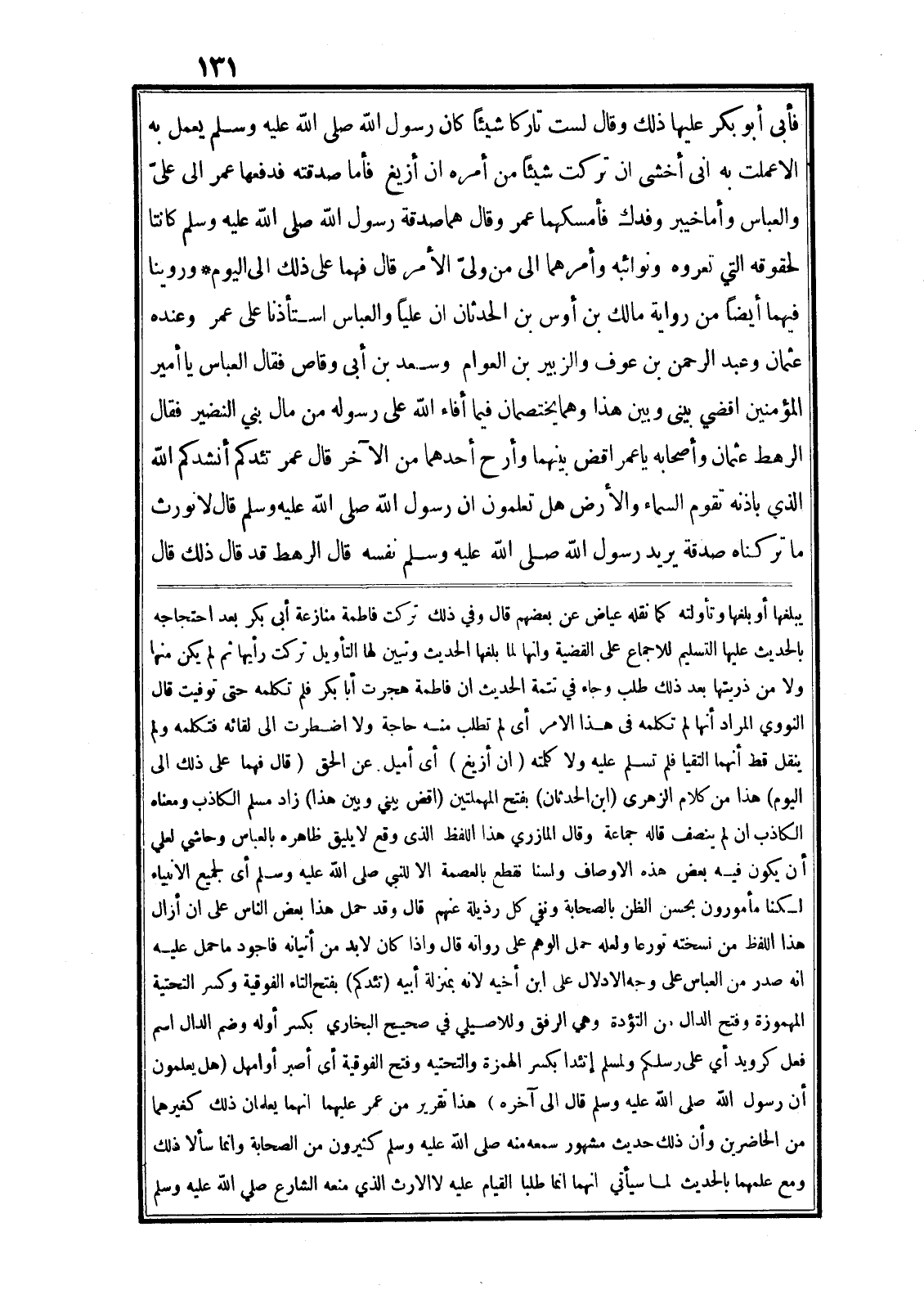 فأبى أبو بكر عليها ذلك وقال لست تاركا شيئا كان رسول الله صلى الله عليه وسلم يعمل به الاعملت به انى أخشى ان تركت شيئا من أمره ان أزيغ فأما صدقته فدفعها عمر الى علىّ والعباس وأما خيبر وفدك فأمسكهما عمر وقال هما صدقة رسول الله صلى الله عليه وسلم كانتا لحقوقه التي تعروه ونوائبه وأمرهما الى من ولىّ الأمر قال فهما على ذلك الى اليوم* وروينا فيهما أيضا من رواية مالك بن أوس بن الحدثان ان عليا والعباس استأذنا على عمر وعنده عثمان وعبد الرحمن بن عوف والزبير بن العوام وسعد بن أبى وقاص فقال العباس يا أمير المؤمنين اقضي بينى وبين هذا وهما يختصمان فيما أفاء الله على رسوله من مال بني النضير فقال الرهط عثمان وأصحابه يا عمر اقض بينهما وأرح أحدهما من الآخر قال عمر تئدكم أنشدكم الله الذي باذنه تقوم السماء والأرض هل تعلمون ان رسول الله صلى الله عليه وسلم قال لا نورث ما تركناه صدقة يريد رسول الله صلى الله عليه وسلم نفسه قال الرهط قد قال ذلك قال يبلغها أو بلغها وتأولته كما نقله عياض عن بعضهم قال وفي ذلك تركت فاطمة منازعة أبى بكر بعد احتجاجه بالحديث عليها التسليم للاجماع على القضية وانها لما بلغها الحديث وتبين لها التأويل تركت رأيها ثم لم يكن منها ولا من ذريتها بعد ذلك طلب وجاء في تتمة الحديث ان فاطمة هجرت أبا بكر فلم تكلمه حتى توفيت قال النووي المراد أنها لم تكلمه في هذا الامر أى لم تطلب منه حاجة ولا اضطرت الى لقائه فتكلمه ولم ينقل قط أنهما التقيا فلم تسلم عليه ولا كلمته (ان أزيغ) أى أميل عن الحق (قال فهما على ذلك الى اليوم) هذا من كلام الزهرى (ابن الحدثان) بفتح المهملتين (اقض بيني وبين هذا) زاد مسلم الكاذب ومعناه الكاذب ان لم ينصف قاله جماعة وقال المازري هذا اللفظ الذى وقع لا يليق ظاهره بالعباس وحاشي لعلي أن يكون فيه بعض هذه الاوصاف ولسنا نقطع بالعصمة الا للنبى صلى الله عليه وسلم أى لجميع الانبياء اسكنا مأمورون بحسن الظن بالصحابة ونفي كل رذيلة عنهم قال وقد حمل هذا بعض الناس على ان أزال هذا اللفظ من نسخته تورعا ولعله حمل الوهم على رواته قال واذا كان لا بد من أتيانه فاجود ما حمل عليه انه صدر من العباس على وجه الادلال على ابن أخيه لانه بمنزلة أبيه (تئدكم) بفتح التاء الفوقية وكسر التحتية المهموزة وفتح الدال من التؤدة وهي الرفق وللاصيلي في صحيح البخاري بكسر أوله وضم الدال اسم فعل كرويد أي على رسلكم ولمسلم إتئدا بكسر الهمزة والتحتية وفتح الفوقية أى أصبر أو امهل (هل يعلمون أن رسول الله صلى الله عليه وسلم قال الى آخره) هذا تقرير من عمر عليهما انهما يعلمان ذلك كغيرهما من الحاضرين وأن ذلك حديث مشهور سمعه منه صلى الله عليه وسلم كثيرون من الصحابة وانما سألا ذلك ومع علمهما بالحديث لما سيأتي انهما انما طلبا القيام عليه لا الارث الذي منعه الشارع صلى الله عليه وسلم