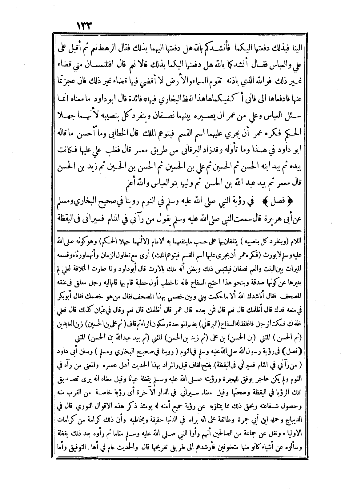 (فصل) في رؤية النبي صلى الله عليه وسلم في النوم روينا في صحيح البخاري ومسلم عن أبى هريرة قال سمعت النبى صلى الله عليه وسلم يقول من رآنى في المنام فسيرانى في اليقظة اللام (وينفرد كل بنصيبه) يتفقان بها على حسب ما ينفعهما به الامام (لا أنهما جهلا الحكم) وهو كونه صلى الله عليه وسلم لا يورث (فكره عمر أن يجرى عليها اسم القسم فيتوهم الملك) أرى مع تطاول الزمان وأنهما ورثاه وقسمه الميراث بين البنت والعم نصفان فيلتبس ذلك ويظن أنه ملك بالارث قال أبو داود ولما صارت الخلافة لعلي لم يغيرها عن كونها صدقة وبنحو هذا احتج السفاح فانه لما خطب أول خطبة قام بها قام اليه رجل معلق في عنقه المصحف فقال أنا شدك الله ألا ما حكمت بيني وبين خصمي بهذا المصحف فقال من هو خصمك فقال أبو بكر في منعه فدك قال أظلمك قال نعم قال فمن بعده قال عمر قال أظلمك قال نعم وقال في عثمان كذلك قال فعلي ظلمك فسكت الرجل فاغلظ له السفاح (البرقاني) بضم الموحدة وسكون الراء ثم قاف (ثم على بن الحسين) زين العابدين (ثم الحسن) المثني (بن الحسن) بن على (ثم زيد بن الحسن) المثني (ثم بيد عبد الله بن الحسن) المثنى