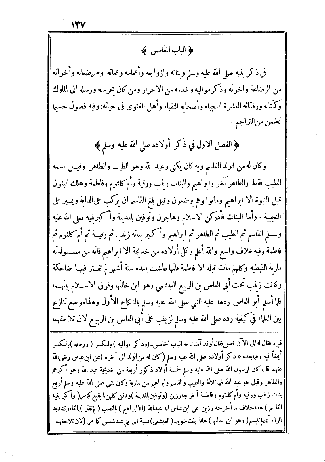 [الباب الخامس في ذكر بنيه صلى الله عليه وسلّم وأزواجه وأعمامه وعمّاته إلى آخره]