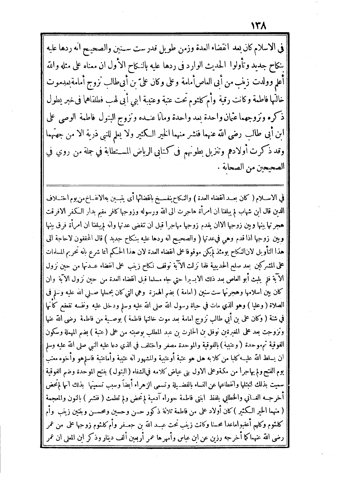 في الاسلام كان بعد انقضاء العدة وزمن طويل قدر ست سنين والصحيح انه ردها عليه بنكاح جديد وتأولوا الحديث الوارد في ردها عليه بالنكاح الأول ان معناه على مثله والله أعلم وولدت زينب من أبى العاص أمامة وعلى وكان علىّ بن أبى طالب تزوج أمامة بعد موت خالتها فاطمة وكانت رقية وأم كلثوم تحت عتبة وعتيبة ابني أبى لهب فطلقاهما في خبر يطول ذكره وتزوجهما عثمان واحدة بعد واحدة وماتا عنده وتزوج البتول فاطمة الوصى على ابن أبى طالب رضى الله عنهما فنشر منهما الخير الكثير ولا يعلم للنبى ذرية الا من جهتهما وقد ذكرت أولادهم وتنزيل بطونهم في كتابى الرياض المستطابة في جملة من روي في الصحيحين من الصحابة.