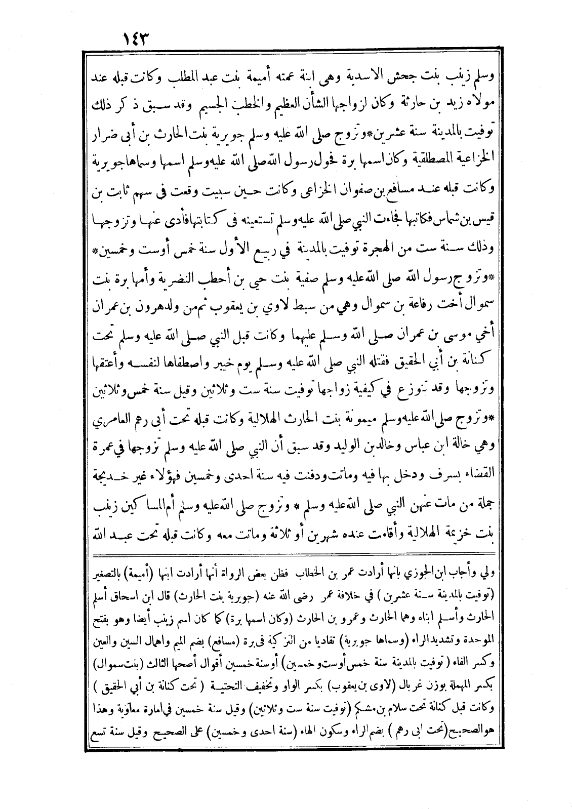 وسلم زينب بنت جحش الاسدية وهى ابنة عمته أميمة بنت عبد المطلب وكانت قبله عند مولاه زيد بن حارثة وكان لزواجها الشأن العظيم والخطب الجسيم وقد سبق ذكر ذلك توفيت بالمدينة سنة عشرين* وتزوج صلى الله عليه وسلم جويرية بنت الحارث بن أبى ضرار الخزاعية المصطلقية وكان اسمها برة فحول رسول الله صلى الله عليه وسلم اسمها وسماها جويرية وكانت قبله عند مسافع بن صفوان الخزاعى وكانت حين سبيت وقعت في سهم ثابت بن قيس بن شماس فكاتبها فجاءت النبي صلى الله عليه وسلم تستعينه في كتابتها فأدى عنها وتزوجها وذلك سنة ست من الهجرة توفيت بالمدينة في ربيع الأول سنة خمس أوست وخمسين** وتزوج رسول الله صلى الله عليه وسلم صفية بنت حي بن أحطب النضرية وأمها برة بنت سموال أخت رفاعة بن سموال وهي من سبط لاوي بن يعقوب ثم من ولد هرون بن عمران أخي موسى بن عمران صلى الله عليه وسلم عليهما وكانت قبل النبي صلى الله عليه وسلم تحت كنانة بن أبي الحقيق فقتله النبي صلى الله عليه وسلم يوم خيبر واصطفاها لنفسه وأعتقها وتزوجها وقد تنوزع في كيفية زواجها توفيت سنة ست وثلاثين وقيل سنة خمس وثلاثين* وتزوج صلى الله عليه وسلم ميمونة بنت الحارث الهلالية وكانت قبله تحت أبى رهم العامري وهي خالة ابن عباس وخالد بن الوليد وقد سبق أن النبي صلى الله عليه وسلم تزوجها في عمرة القضاء بسرف ودخل بها فيه وماتت ودفنت فيه سنة احدى وخمسين فهؤلاء غير خديجة جملة من مات عنهن النبي صلى الله عليه وسلم* وتزوج صلى الله عليه وسلم أم المساكين زينب بنت خزيمة الهلالية وأقامت عنده شهرين أو ثلاثة وماتت معه وكانت قبله تحت عبد الله ولي وأجاب ابن الجوزي بانها أرادت عمر بن الخطاب فظن بعض الرواة أنها أرادت ابنها (أميمة) بالتصغير (توفيت بالمدينة سنة عشرين) في خلافة عمر رضى الله عنه (جويرية بنت الحارث) قال ابن اسحاق أسلم الحارث وأسلم ابناه وهما الحارث وعمرو بن الحارث (وكان اسمها برة) كما كان اسم زينب أيضا وهو بفتح الموحدة وتشديد الراء (وسماها جويرية) تفاديا من التزكية في برة (مسافع) بضم الميم واهمال السين والعين وكسر الفاء (توفيت بالمدينة سنة خمس أوست وخمسين) أو سنة خمسين أقوال أصحها الثالث (بنت سموال) بكسر المهملة بوزن غربال (لاوى بن يعقوب) بكسر الواو وتخفيف التحتية (تحت كنانة بن أبي الحقيق) وكانت قبل كنانة تحت سلام بن مشكم (توفيت سنة ست وثلاثين) وقيل سنة خمسين في امارة معاوية وهذا هو الصحيح (تحت ابى رهم) بضم الراء وسكون الهاء (سنة احدى وخمسين) على الصحيح وقيل سنة تسع
