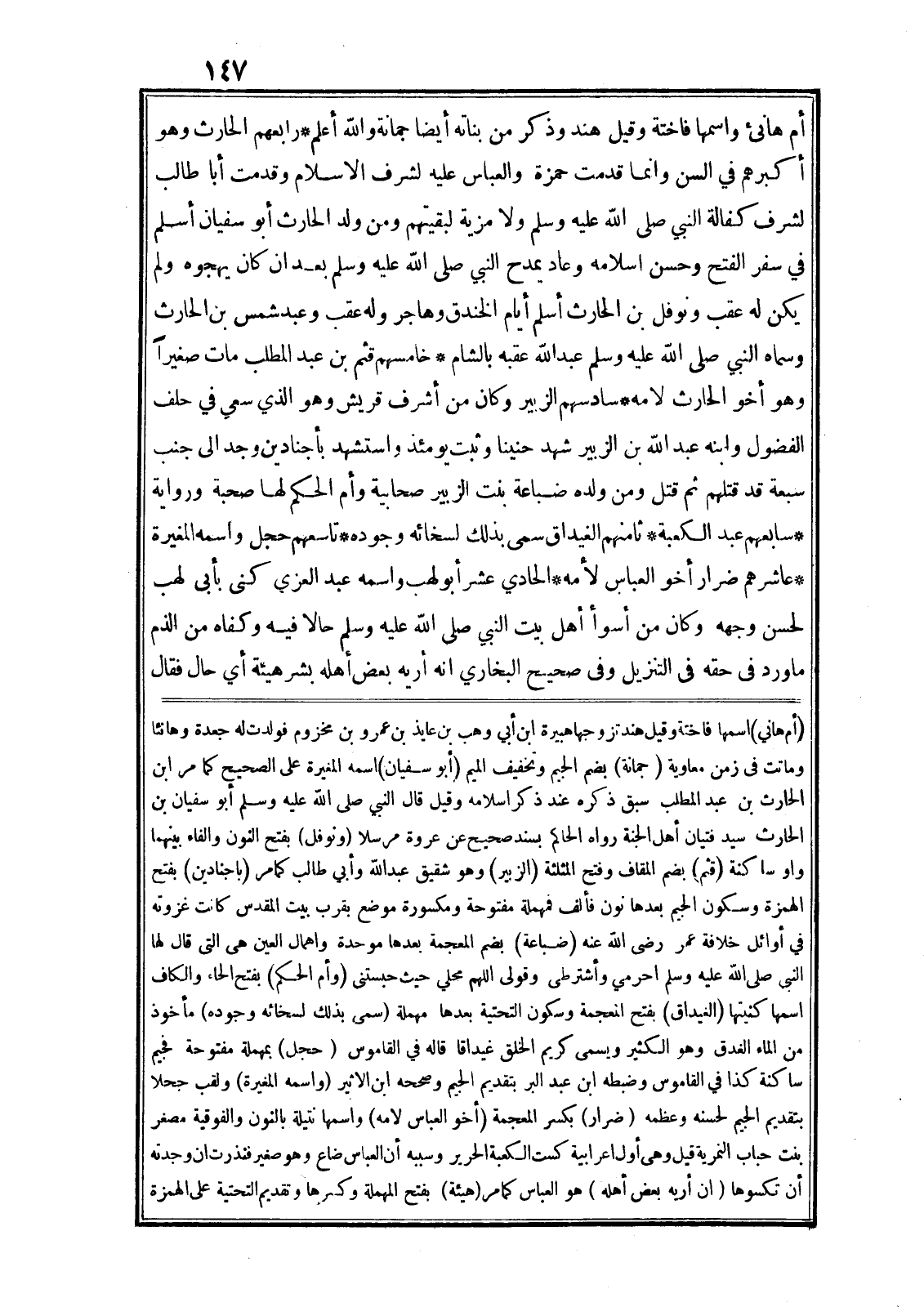 أم هانئ واسمها فاختة وقيل هند وذكر من بناته أيضا جمانة والله أعلم* رابعهم الحارث وهو أكبرهم في السن وانما قدمت حمزة والعباس عليه لشرف الاسلام وقدمت أبا طالب لشرف كفالة النبي صلى الله عليه وسلم ولا مزية لبقيتهم ومن ولد الحارث أبو سفيان أسلم في سفر الفتح وحسن اسلامه وعاد يمدح النبي صلى الله عليه وسلم بعد ان كان يهجوه ولم يكن له عقب ونوفل بن الحارث أسلم أيام الخندق وهاجر وله عقب وعبد شمس بن الحارث وسماه النبي صلى الله عليه وسلم عبد الله عقبه بالشام* خامسهم قثم بن عبد المطلب مات صغيرا وهو أخو الحارث لامه* سادسهم الزبير وكان من أشرف قريش وهو الذي سعي في حلف الفضول وابنه عبد الله بن الزبير شهد حنينا وثبت يومئذ واستشهد بأجنادين وجد الى جنب سبعة قد قتلهم ثم قتل ومن ولده ضباعة بنت الزبير صحابية وأم الحكم لها صحبة ورواية* سابعهم عبد الكعبة* ثامنهم الغيداق سمى بذلك لسخائه وجوده* تاسعهم حجل واسمه المغيرة* عاشرهم ضرار أخو العباس لأمه* الحادي عشر أبو لهب واسمه عبد العزى كنى بأبى لهب لحسن وجهه وكان من أسوأ أهل بيت النبي صلى الله عليه وسلم حالا فيه وكفاه من الذم ما ورد في حقه في التنزيل وفي صحيح البخاري انه أريه بعض أهله بشر هيئة أي حال فقال (أم هاني) اسمها فاختة وقيل هند تزوجها هبيرة ابن أبي وهب بن عايذ بن عمرو بن مخزوم فولدت له جعدة وهانئا وماتت في زمن معاوية (جمانة) بضم الجيم وتخفيف الميم (أبو سفيان) اسمه المغيرة على الصحيح كما مر ابن الحارث بن عبد المطلب سبق ذكره عند ذكر اسلامه وقيل قال النبي صلى الله عليه وسلم أبو سفيان بن الحارث سيد فتيان أهل الجنة رواه الحاكم بسند صحيح عن عروة مرسلا (ونوفل) بفتح النون والفاء بينهما واو ساكنة (قثم) بضم المقاف وفتح المثلثة (الزبير) وهو شقيق عبد الله وأبي طالب كما مر (باجنادين) بفتح الهمزة وسكون الجيم بعدها نون فألف فمهملة مفتوحة ومكسورة موضع بقرب بيت المقدس كانت غزوته في أوائل خلافة عمر رضى الله عنه (ضباعة) بضم المعجمة بعدها موحدة واهمال العين هى التى قال لها النبى صلى الله عليه وسلم احرمي وأشترطى وقولى اللهم محلي حيث حبستنى (وأم الحكم) بفتح الحاء والكاف اسمها كنيتها (الغيداق) بفتح المعجمة وسكون التحتية بعدها مهملة (سمى بذلك لسخائه وجوده) مأخوذ من الماء الغدق وهو الكثير ويسمى كريم الخلق غيداقا قاله في القاموس (حجل) بمهملة مفتوحة فجيم ساكنة كذا في القاموس وضبطه ابن عبد البر بتقديم الجيم وصححه ابن الاثير (واسمه المغيرة) ولقب جحلا بتقديم الجيم لحسنه وعظمه (ضرار) بكسر المعجمة (أخو العباس لامه) واسمها نتيلة بالنون والفوقية مصغر بنت حباب النمرية قيل وهى أول اعرابية كست الكعبة الحرير وسببه أن العباس ضاع وهو صغير فنذرت ان وجدته أن تكسوها (ان أريه بعض أهله) هو العباس كما مر (هيئة) بفتح المهملة وكسرها وتقديم التحتية على الهمزة