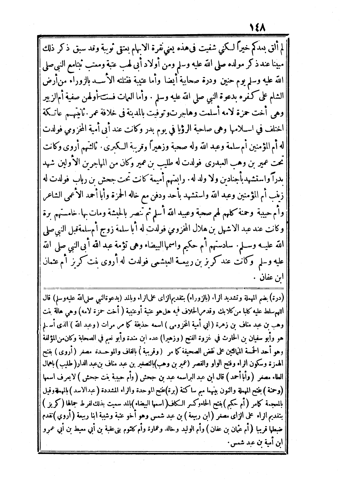 (درة) بضم المهملة وتشديد الراء (بالزوراء) بتقديم الزاى على الراء وبالمد (بدعوة النبي صلى الله عليه وسلم) قال اللهم سلط عليه كلبا من كلابك وقد مر الخلاف فيه هل هو عتبة أو عتيبة (أخت حمزة لامه) وهي هالة بنت وهب بن عبد مناف بن زهرة (ابي أمية المخزومى) اسمه حذيفة كما مر مرات (وعبد الله) الذى أسلم هو وأبو سفيان بن الحارث في غزوة الفتح (وزهيرا) عده ابن مندة وأبو نعيم في الصحابة وكان من المؤلفة وهو أحد الخمسة المتمالئين على نقض الصحيفة كما مر (وقريبة) بالقاف والموحدة مصغر (أروى) بفتح الهمزة وسكون الراء وفتح الواو والقصر (عمير بن وهب) بالتصغير بن عبد مناف بن عبد الدار (طليب) باهمال الطاء مصغر (وأبا أحمد) قال ابن عبد البر اسمه عبد بن جحش (وأم حبيبة بنت جحش) لا يعرف اسمها (وحمنة) بفتح المهملة والنون بينهما ميم ساكنة (برة) بفتح الموحدة والراء المشددة (عبد الاسد) بالمهملة وقيل بالمعجمة كما مر (أم حكيم) بفتح الحاء وكسر الكاف (اسمها البيضاء) بالمد سميت بذلك لفرط جمالها (كريز) بتقديم الراء على الزاى مصغر (ابن ربيعة) بن عبد شمس وهو أخو عتبة وشيبة ابنا ربيعة (أروي) تقدم ضبطها قريبا (أم عثمان بن عفان) وأم الوليد وخالد وعمارة وأم كلثوم بنى عقبة بن أبي معيط بن أبي عمرو ابن أمية بن عبد شمس.