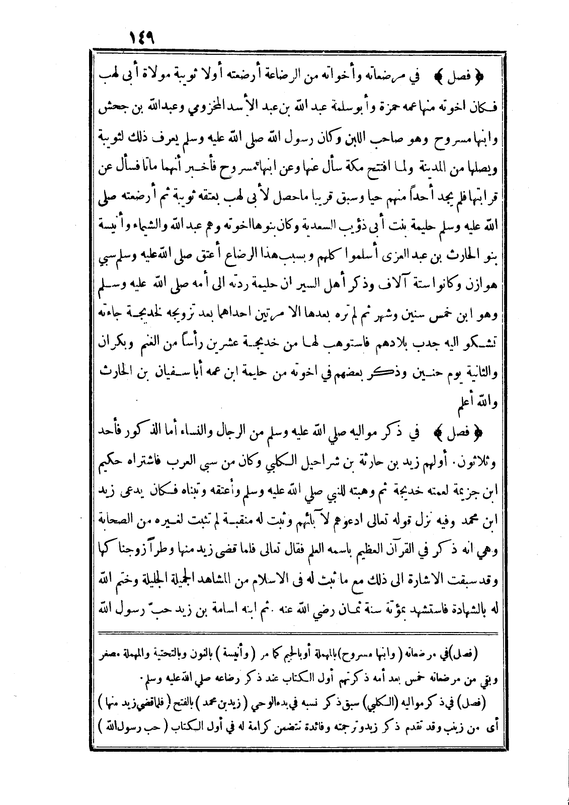 (فصل) في ذكر مواليه صلى الله عليه وسلم من الرجال والنساء أما الذكور فأحد وثلاثون. أولهم زيد بن حارثة بن شراحيل الكلبي وكان من سبى العرب فاشتراه حكيم ابن جزيمة لعمته خديجة ثم وهبته للنبي صلى الله عليه وسلم وأعتقه وتبناه فكان يدعى زيد ابن محمد وفيه نزل قوله تعالى ادْعُوهُمْ لِآبائِهِمْ وثبت له منقبة لم تثبت لغيره من الصحابة وهي انه ذكر في القرآن العظيم باسمه العلم فقال تعالى فَلَمَّا قَضى زَيْدٌ مِنْها وَطَراً زَوَّجْناكَها وقد سبقت الاشارة الى ذلك مع ما ثبت له في الاسلام من المشاهد الجميلة الجليلة وختم الله له بالشهادة فاستشهد بمؤتة سنة ثمان رضي الله عنه. ثم ابنه اسامة بن زيد حبّ رسول الله (فصل) في مرضعاته (وابنها مسروح) بالمهملة أو بالجيم كما مر (وأنيسة) بالنون وبالتحتية والمهملة مصغر وبقي من مرضعاته خمس بعد أمه ذكرتهم أول الكتاب عند ذكر رضاعه صلى الله عليه وسلم.