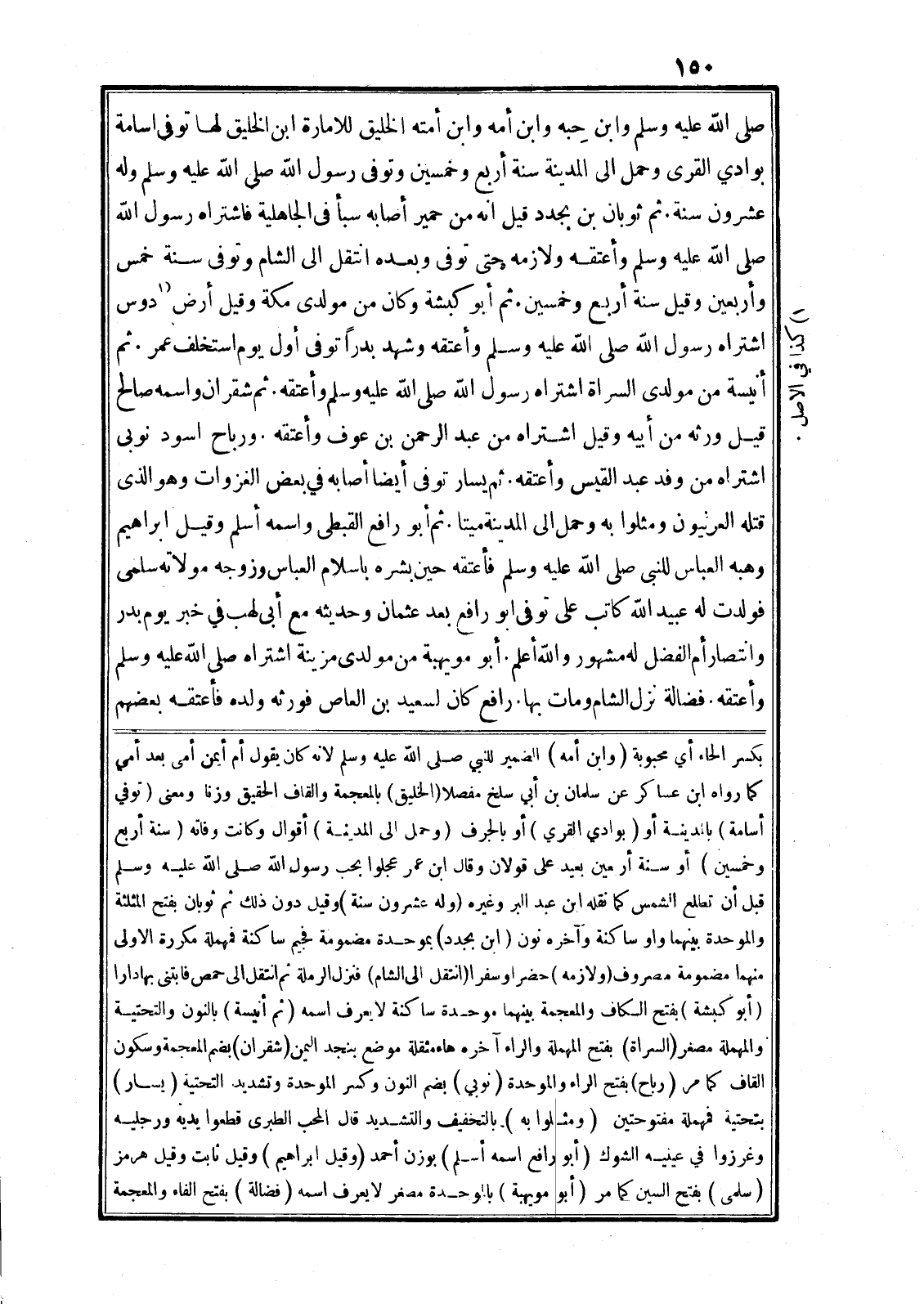 صلى الله عليه وسلم وابن حبه وابن أمه وابن أمته الخليق للامارة ابن الخليق لها توفي اسامة بوادي القرى وحمل الى المدينة سنة أربع وخمسين وتوفي رسول الله صلى الله عليه وسلم وله عشرون سنة. ثم ثوبان بن بجدد قيل انه من حمير أصابه سبأ في الجاهلية فاشتراه رسول الله صلى الله عليه وسلم وأعتقه ولازمه حتى توفي وبعده انتقل الى الشام وتوفي سنة خمس وأربعين وقيل سنة أربع وخمسين. ثم أبو كبشة وكان من مولدى مكة وقيل أرض «1» دوس اشتراه رسول الله صلى الله عليه وسلم وأعتقه وشهد بدرا توفي أول يوم استخلف عمر. ثم أنيسة من مولدى السراة اشتراه رسول الله صلى الله عليه وسلم وأعتقه. ثم شقران واسمه صالح قيل ورثه من أبيه وقيل اشتراه من عبد الرحمن بن عوف وأعتقه. ورباح اسود نوبى اشتراه من وفد عبد القيس وأعتقه. ثم يسار توفي أيضا أصابه في بعض الغزوات وهو الذى قتله العرنيون ومثلوا به وحمل الى المدينة ميتا. ثم أبو رافع القبطى واسمه أسلم وقيل ابراهيم وهبه العباس للنبى صلى الله عليه وسلم فأعتقه حين بشره باسلام العباس وزوجه مولاته سلمى فولدت له عبيد الله كاتب على توفي ابو رافع بعد عثمان وحديثه مع أبى لهب في خبر يوم بدر وانتصار أم الفضل له مشهور والله أعلم. أبو مويهبة من مولدى مزينة اشتراه صلى الله عليه وسلم وأعتقه. فضالة نزل الشام ومات بها. رافع كان لسعيد بن العاص فورثه ولده فأعتقه بعضهم بكسر الحاء أي محبوبة (وابن أمه) الضمير للنبي صلى الله عليه وسلم لانه كان يقول أم أيمن أمى بعد أمي كما رواه ابن عساكر عن سلمان بن أبي سلخ مفصلا (الخليق) بالمعجمة والقاف الحقيق وزنا ومعنى (توفي أسامة) بالمدينة أو (بوادي القري) أو بالجرف (وحمل الى المدينة) أقوال وكانت وفاته (سنة أربع وخمسين) أو سنة أربعين بعيد على قولان وقال ابن عمر عجلوا بحب رسول الله صلى الله عليه وسلم قبل أن تطلع الشمس كما نقله ابن عبد البر وغيره (وله عشرون سنة) وقيل دون ذلك ثم ثوبان بفتح المثلثة والموحدة بينهما واو ساكنة وآخره نون (ابن بجدد) بموحدة مضمومة فجيم ساكنة فمهملة مكررة الاولى منهما مضمومة مصروف (ولازمه) حضرا وسفرا (انتقل الى الشام) فنزل الرملة ثم انتقل الى حمص فابتنى بها دارا (أبو كبشة) بفتح الكاف والمعجمة بينهما موحدة ساكنة لا يعرف اسمه (ثم أنيسة) بالنون والتحتية والمهملة مصغر (السراة) بفتح المهملة والراء آخره هاء مثقلة موضع بنجد اليمن (شقران) بضم المعجمة وسكون القاف كما مر (رباح) بفتح الراء والموحدة (نوبي) بضم النون وكسر الموحدة وتشديد التحتية (يسار) بتحتية فمهملة مفتوحتين (ومثلوا به) بالتخفيف والتشديد قال المحب الطبرى قطعوا يديه ورجليه وغرزوا في عينيه الشوك (أبو رافع اسمه أسلم) بوزن أحمد (وقيل ابراهيم) وقيل ثابت وقيل هرمز (سلمى) بفتح السين كما مر (أبو مويهبة) بالموحدة مصغر لا يعرف اسمه (فضالة) بفتح الفاء والمعجمة
