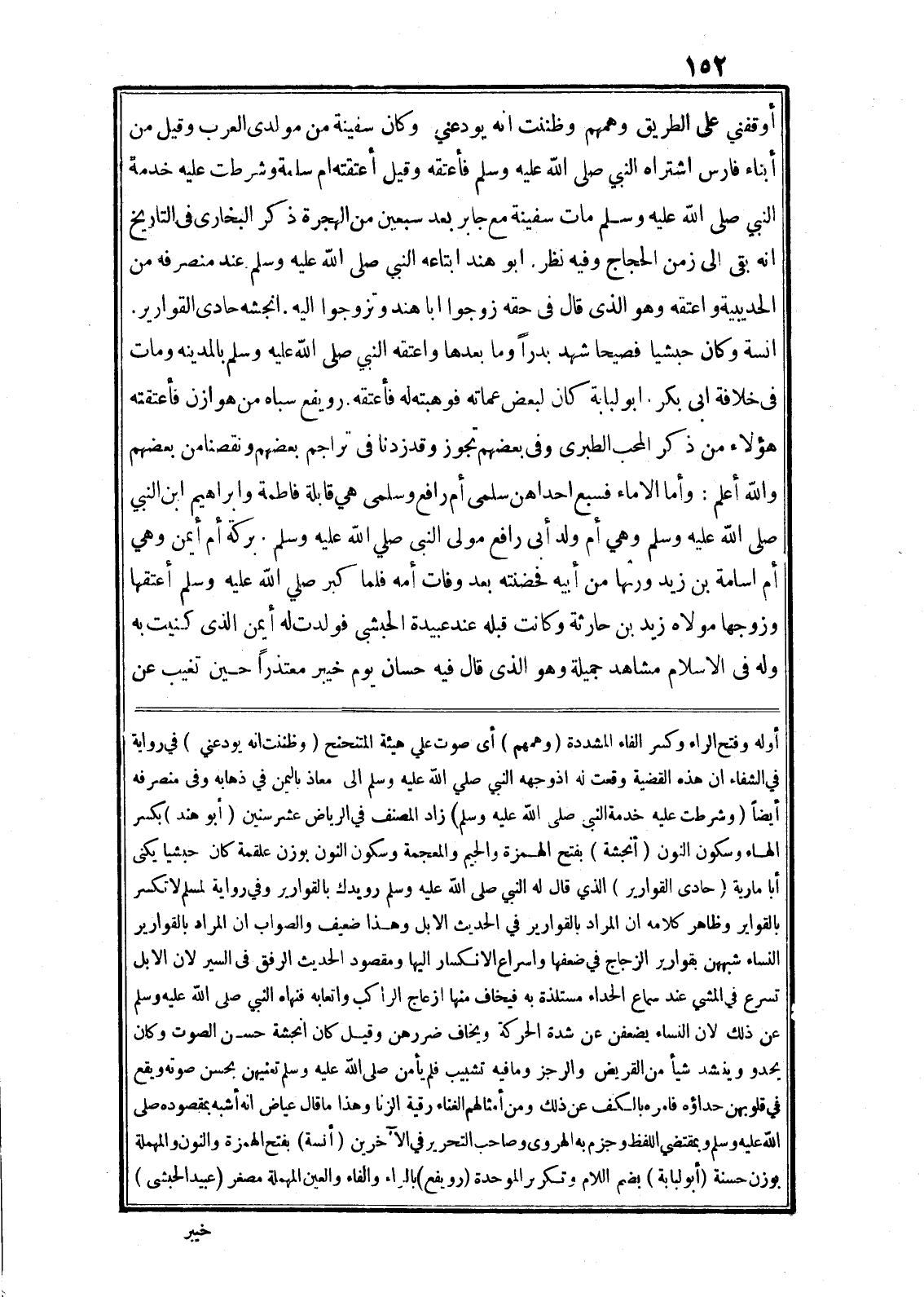 أوقفني على الطريق وهمهم وظننت انه يودعني وكان سفينة من مولدى العرب وقيل من أبناء فارس اشتراه النبي صلى الله عليه وسلم فأعتقه وقيل أعتقته ام سلمة وشرطت عليه خدمة النبي صلى الله عليه وسلم مات سفينة مع جابر بعد سبعين من الهجرة ذكر البخارى في التاريخ انه بقى الى زمن الحجاج وفيه نظر. ابو هند ابتاعه النبي صلى الله عليه وسلم عند منصرفه من الحديبية واعتقه وهو الذى قال في حقه زوجوا ابا هند وتزوجوا اليه. انجشه حادى القوارير.