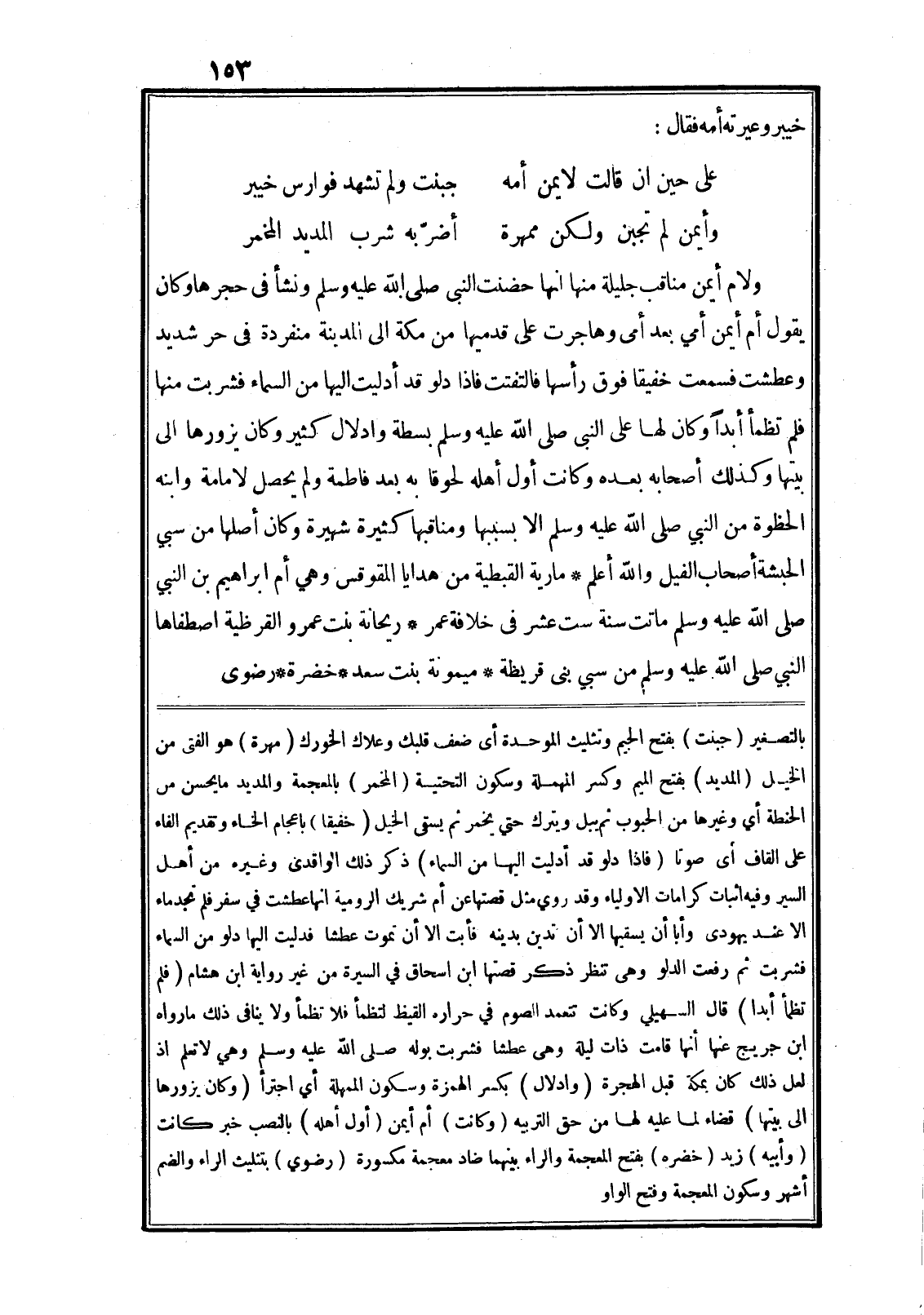 بالتصغير (جبنت) بفتح الجيم وتثليث الموحدة أى ضعف قلبك وعلاك الخورك (مهرة) هو الفتى من الخيل (المديد) بفتح الميم وكسر المهملة وسكون التحتية (المخمر) بالمعجمة والمديد ما يحسن من الحنطة أي وغيرها من الحبوب ثم يبل ويترك حتى يخمر ثم يسقى الخيل (خفيقا) باعجام الخاء وتقديم الفاء على القاف أى صوتا (فاذا دلو قد أدليت اليها من السماء) ذكر ذلك الواقدى وغيره من أهل السير وفيه اثبات كرامات الاولياء وقد روي مثل قصتها عن أم شريك الرومية انها عطشت في سفر فلم تجد ماء الا عند يهودى وأبا أن يسقيها الا أن تدين بدينه فأبت الا أن تموت عطشا فدليت اليها دلو من السماء فشربت ثم رفعت الدلو وهى تنظر ذكر قصتها ابن اسحاق في السيرة من غير رواية ابن هشام (فلم تظمأ أبدا) قال السهيلي وكانت تتعمد الصوم في حراره القيظ لتظمأ فلا تظمأ ولا ينافي ذلك ما رواه ابن جريج عنها أنها قامت ذات ليلة وهى عطشا فشربت بوله صلى الله عليه وسلم وهي لا تعلم اذ لعل ذلك كان بمكة قبل الهجرة (وادلال) بكسر الهمزة وسكون المهملة أي اجترأ (وكان يزورها الى بيتها) قضاء لما عليه لها من حق التربيه (وكانت) أم أيمن (أول أهله) بالنصب خبر كانت (وأبيه) زيد (خضره) بفتح المعجمة والراء بينهما ضاد معجمة مكسورة (رضوي) بتثليث الراء والضم أشهر وسكون المعجمة وفتح الواو
