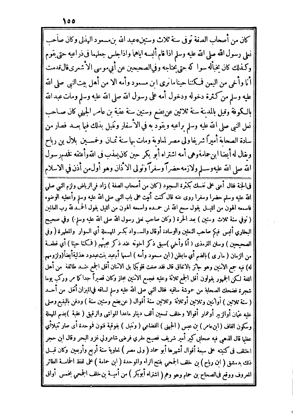 كان من أصحاب الصفة توفي سنة ثلاث وستين* عبد الله بن مسعود الهذلى وكان صاحب نعلى رسول الله صلى الله عليه وسلم اذا قام ألبسه اياهما واذا جلس جعلهما في ذراعيه حتى يقوم وكذلك كان يخبأله سواكه حتى يحتاجه وفي الصحيحين عن أبي موسى الأشعرى قال قدمت أنا وأخى من اليمن فمكثنا حينا ما نرى ابن مسعود وأمه الا من أهل بيت النبى صلى الله عليه وسلم من كثرة دخوله ودخول أمه على رسول الله صلى الله عليه وسلم ومات عبد الله بالكوفة وقيل بالمدينة سنة ثلاثين عن بضع وستين سنة عقبة بن عامر الجهني كان صاحب نعل النبى صلى الله عليه وسلم يراعيه ويقود به في الأسفار وتنبل بذلك فيما بعد فصار من سادة الصحابة أميرا شريفا ولى مصر لمعاوية ومات بها سنة ثمان وخمسين بلال بن رباح ويقال له أيضا ابن حمامة وهى أمه اشتراه أبو بكر حين كان يعذب في الله وأعتقه فخدم رسول الله صلى الله عليه وسلم ولازمه حضرا وسفرا وتولى الأذان وهو أول من أذن في الاسلام في الجنة فقال أعنى على نفسك بكثرة السجود (كان من أصحاب الصفة) زاد في الرياض ولزم النبي صلى الله عليه وسلم حضرا وسفرا روى عنه قال كنت أتيت على باب النبى صلى الله عليه وسلم وأعطيه الوضوء فاسمعه الهون من الليل يقول سمع الله لمن حمده واسمعه الهون من الليل يقول الحمد لله رب العالمين (توفي سنة ثلاث وستين) بعد الحرة (وكان صاحب نعلى رسول الله صلى الله عليه وسلم) وفي صحيح البخاري أليس فيكم صاحب النعلين والوسادة أو قال والسواد بكسر المهملة أي السوار والمطهرة (وفي الصحيحين) وسنن الترمذى (أنا وأخي) سبق ذكر اخوته عند ذكر مجيئهم (فمكنا حينا) أي قطعة من الزمان (ما نرى) بالضم أي ما يظن (ابن مسعود وأمه) اسمها أم عبد بنت عبدود هذلية أيضا (ولزومهم له) فيه جمع الاثنين وهو جائز بالاتفاق قال فقد صغت قلوبكما بل الاثنان أقل الجمع عند طائفة من أهل اللغة لكن الجمهور يقولون أقل الجمع ثلاثة وعليه فجمع الاثنين مجاز وكان قصيرا جدا كما مر وركب يوما شجرة فضحك الصحابة من حموشة ساقيه فقال النبي صلى الله عليه وسلم لساقه في الميزان أثقل من أحد (سنة ثلاثين) أو اثنين وثلاثين أو ثلاثة وثلاثين سنة أقوال (عن بضع وستين سنة) ودفن بالبقيع وصلى عليه عثمان أو الزبير أو عمار أقوالا وخلف تسعين ألف دينار ما عدا المواشى والرقيق (عقبة) بضم المهملة وسكون القاف (ابن عامر) بن عبس (الجهنى) القضاعي (وتنبل) بفوقية فنون فموحدة أى صار تنبلا أي عظيما قال الذهبى فيه صحابى كبير أمير شريف فصيح مقري فرضى شاعر ولي غزو البحر وقال ابن حجر اختلف في كنيته على سبعة أقوال أشهرها أبو حماد (ولى مصر) لمعاوية سنة أربع وأربعين وكان قبل ذلك بدمشق (ابن رباح) بن خلف الجمحي بفتح الراء والموحدة (ابن حمامة) على لفظ الحمامة الطائر المعروف ووقع في الصحاح بن حمام وهو وهم (اشتراه أبو بكر) من أمية بن خلف الجمحي بخمس أواق