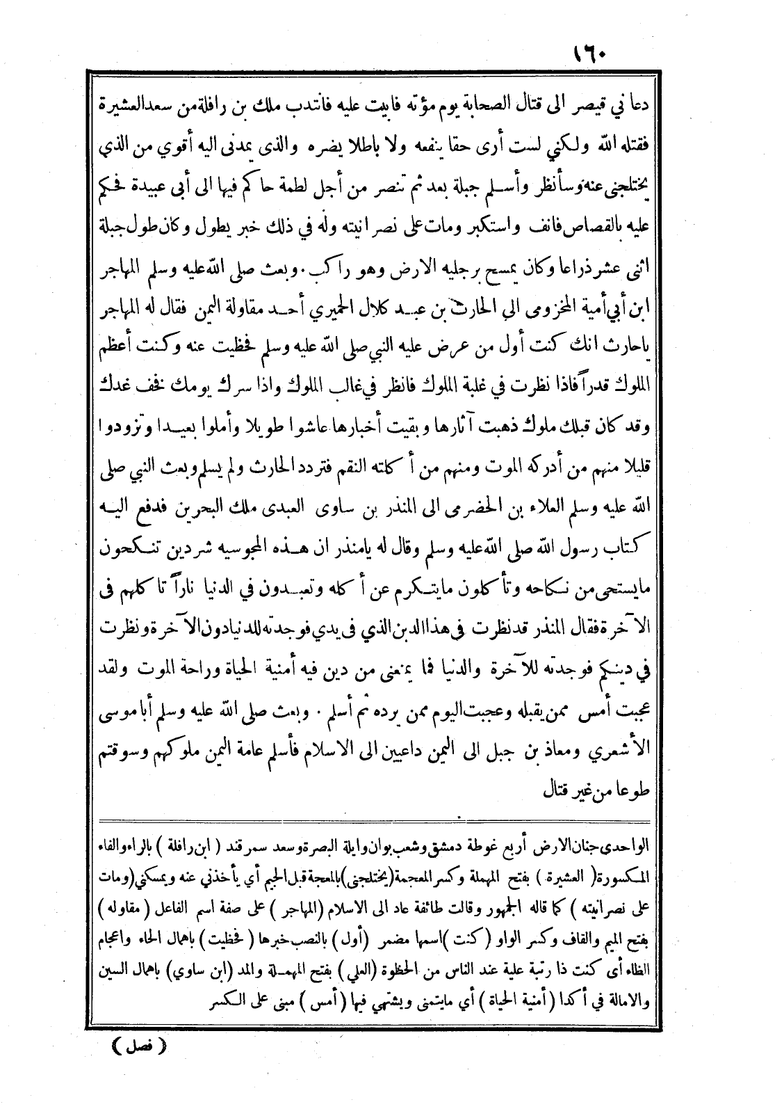 دعاني قيصر الى قتال الصحابة يوم مؤته فابيت عليه فانتدب ملك بن رافلة من سعد العشيرة فقتله الله ولكني لست أرى حقا ينفعه ولا باطلا يضره والذى يمدنى اليه أقوي من الذي يختلجنى عنه وسأنظر وأسلم جبلة بعد ثم تنصر من أجل لطمة حاكم فيها الى أبى عبيدة فحكم عليه بالقصاص فانف واستكبر ومات على نصرانيته وله في ذلك خبر يطول وكان طول جبلة اثنى عشر ذراعا وكان يمسح برجليه الارض وهو راكب. وبعث صلى الله عليه وسلم المهاجر ابن أبي أمية المخزومى الى الحارث بن عبد كلال الحميري أحد مقاولة اليمن فقال له المهاجر يا حارث انك كنت أول من عرض عليه النبي صلى الله عليه وسلم فحظيت عنه وكنت أعظم الملوك قدرا فاذا نظرت في غلبة الملوك فانظر في غالب الملوك واذا سرك يومك فخف غدك وقد كان قبلك ملوك ذهبت آثارها وبقيت أخبارها عاشوا طويلا وأملوا بعيدا وتزودوا قليلا منهم من أدركه الموت ومنهم من أكلته النقم فتردد الحارث ولم يسلم وبعث النبي صلى الله عليه وسلم العلاء بن الحضرمى الى المنذر بن ساوى العبدى ملك البحرين فدفع اليه كتاب رسول الله صلى الله عليه وسلم وقال له يا منذر ان هذه المجوسيه شر دين تنكحون ما يستحى من نكاحه وتأكلون ما يتكرم عن أكله وتعبدون في الدنيا نارا تاكلهم في الآخرة فقال المنذر قد نظرت في هذا الدين الذي في يدي فوجدته للدنيا دون الآخرة ونظرت في دينكم فوجدته للآخرة والدنيا فما يمنعنى من دين فيه أمنية الحياة وراحة الموت ولقد عجبت أمس ممن يقبله وعجبت اليوم ممن يرده ثم أسلم. وبعث صلى الله عليه وسلم أبا موسى الأشعري ومعاذ بن جبل الى اليمن داعيين الى الاسلام فأسلم عامة اليمن ملوكهم وسوقتم طوعا من غير قتال الواحدى جنان الارض أربع غوطة دمشق وشعب بوان وايلة البصرة وسعد سمرقند (ابن رافلة) بالراء والفاء المكسورة (العشيرة) بفتح المهملة وكسر المعجمة (يختلجنى) بالمعجمة قبل الجيم أي يأخذني عنه ويمسكني (ومات على نصرانيته) كما قاله الجمهور وقالت طائفة عاد الى الاسلام (المهاجر) على صفة اسم الفاعل (مقاوله) بفتح الميم والقاف وكسر الواو (كنت) اسمها مضمر (أول) بالنصب خبرها (فحظيت) باهمال الحاء واعجام الظاء أى كنت ذا رتبة علية عند الناس من الحظوة (العلي) بفتح المهملة والمد (ابن ساوي) باهمال السين والامالة في أكدا (أمنية الحياة) أي ما يتمنى ويشتهي فيها (أمس) مبنى على الكسر