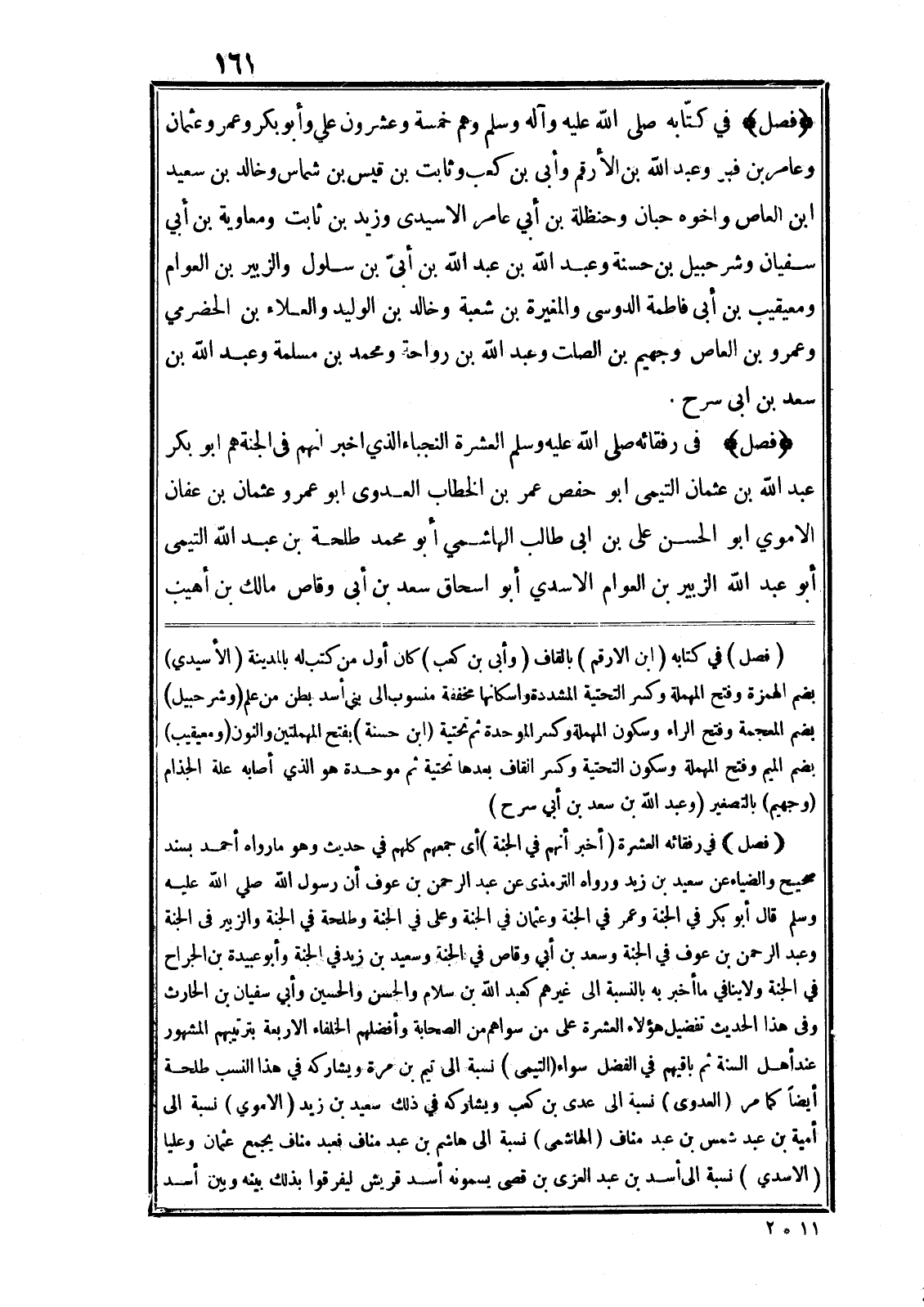 (فصل) في رفقائه العشرة (أخبر أنهم في الجنة) أى جمعهم كلهم في حديث وهو ما رواه أحمد بسند صحيح والضياء عن سعيد بن زيد ورواه الترمذى عن عبد الرحمن بن عوف أن رسول الله صلى الله عليه وسلم قال أبو بكر في الجنة وعمر في الجنة وعثمان في الجنة وعلى في الجنة وطلحة في الجنة والزبير في الجنة وعبد الرحمن بن عوف في الجنة وسعد بن أبي وقاص في الجنة وسعيد بن زيد في الجنة وأبو عبيدة بن الجراح في الجنة ولا ينافي ما أخبر به بالنسبة الى غيرهم كعبد الله بن سلام والحسن والحسين وأبي سفيان بن الحارث وفي هذا الحديث تفضيل هؤلاء العشرة على من سواهم من الصحابة وأفضلهم الخلفاء الاربعة بترتيبهم المشهور عند أهل السنة ثم باقيهم في الفضل سواء (التيمى) نسبة الى تيم بن مرة ويشاركه في هذا النسب طلحة أيضا كما مر (العدوى) نسبة الى عدى بن كعب ويشاركه في ذلك سعيد بن زيد (الاموي) نسبة الى أمية بن عبد شمس بن عبد مناف (الهاشمى) نسبة الى هاشم بن عبد مناف فعبد مناف يجمع عثمان وعليا (الاسدي) نسبة الى أسد بن عبد العزى بن قصى يسمونه أسد قريش ليفرقوا بذلك بينه وبين أسد