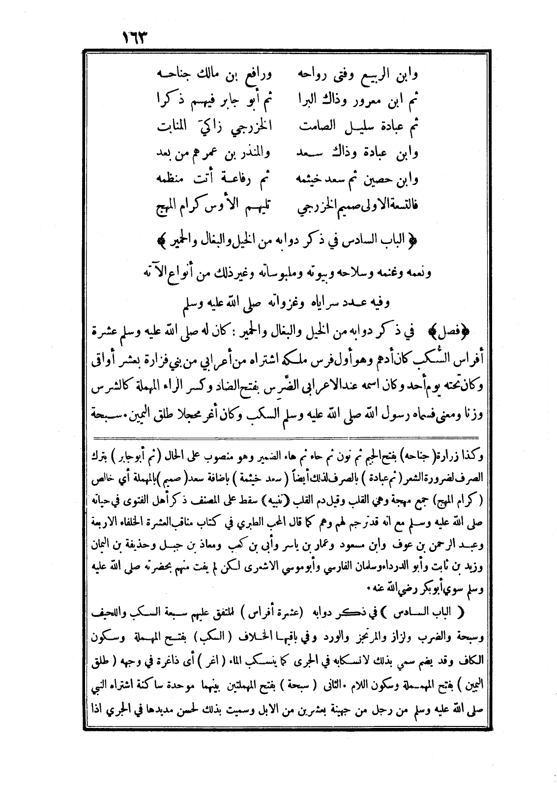 (فصل) في ذكر دوابه من الخيل والبغال والحمير: كان له صلى الله عليه وسلم عشرة أفراس السّكب كان أدهم وهو أول فرس ملكه اشتراه من أعرابي من بني فزارة بعشر أواقى وكان تحته يوم أحد وكان اسمه عند الاعرابى الضّرس بفتح الضاد وكسر الراء المهملة كالشرس وزنا ومعنى فسماه رسول الله صلى الله عليه وسلم السكب وكان أغر محجلا طلق اليمين مسبحة وكذا زرارة (جناحه) بفتح الجيم ثم نون ثم حاء ثم هاء الضمير وهو منصوب على الحال (ثم أبو جابر) بترك الصرف لضرورة الشعر (ثم عبادة) بالصرف لذلك أيضا (سعد خيثمة) باضافة سعد (صميم) بالمهملة أي خالص (كرام المهج) جمع مهجة وهي القلب وقيل دم القلب (تنبيه) سقط على المصنف ذكر أهل الفتوى في حياته صلى الله عليه وسلم مع انه قد ترجم لهم وهم كما قال المحب الطبري في كتاب مناقب العشرة الخلفاء الاربعة وعبد الرحمن بن عوف وابن مسعود وعمار بن ياسر وأبى بن كعب ومعاذ بن جبل وحذيفة بن اليمان وزيد بن ثابت وأبو الدرداء وسلمان الفارسي وأبو موسي الاشعرى لكن لم يفت منهم بحضرته صلى الله عليه وسلم سوي أبو بكر رضي الله عنه.