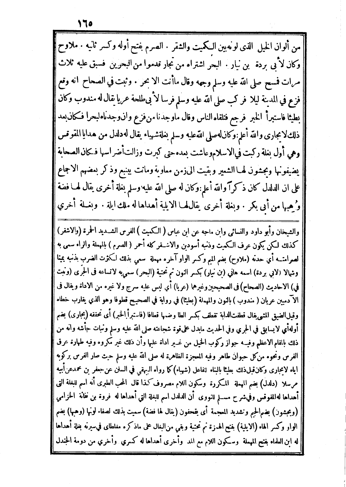 من ألوان الخيل الذى لونه بين الكميت والشقر. الصرم بفتح أوله وكسر ثانيه. ملاوح وكان لأبى بردة بن نيار. البحر اشتراه من تجار قدموا من البحرين فسبق عليه ثلاث مرات فمسح صلى الله عليه وسلم وجهه وقال ما أنت الا بحر. وثبت في الصحاح انه وقع فزع في المدينة ليلا فركب صلى الله عليه وسلم فرسا لأبى طلحة عريا يقال له مندوب وكان بطيئا فاستبرأ الخبر فرجع فتلقاه الناس وقال ما وجدنا من فزع وان وجدناه لبحرا فكان بعد ذلك لا يجارى والله أعلم: وكان له صلى الله عليه وسلم بغلة شهباء يقال له دلدل من هدايا المقوقس وهي أول بغلة ركبت في الاسلام وعاشت بعده حتى كبرت وزالت أضراسها فكان الصحابة يضيفونها ويجشون لها الشعير وبقيت الى زمن معاوية وماتت بينبع وذكر بعضهم الاجماع على ان الدلدل كان ذكرا والله أعلم: وكان له صلى الله عليه وسلم بغلة أخرى يقال لها فضة وهبها من أبى بكر. وبغلة أخرى يقال لها الايلية أهداها له ملك ايلة. وبغلة أخري والشيخان وأبو داود والنسائى وابن ماجه عن ابن عباس (الكميت) الفرس الشديد الحمرة (والاشقر) كذلك لكن يكون عرف الكميت وذنبه أسودين والاشقر كله أحمر (الصرم) بالمهملة والراء سمى به لصرامته أي حدته (ملاوح) بضم الميم وكسر الواو آخره مهملة سمي بذلك لكثرت الضرب بذنبه يمينا وشمالا (لابي بردة) اسمه هاني (بن نيار) بكسر النون ثم تحتية (البحر) سمي به لاتساعه في الجرى (وثبت في) الاحاديث (الصحاح) في الصحيحين وغيرهما (عريا) أي ليس عليه سرج ولا غيره من الاداة ويقال في الآدميين عريان (مندوب) بالنون والمهملة (يطيئا) في رواية في الصحيح قطوفا وهو الذي يقارب خطاه وقيل الضيق المشى يقال قطفت الدابة تقطف بكسر الطا وضمها قطافا (فاستبرأ الخبر) أى تحققه (يجارى) بضم أوله أي لا يسابق في الجري وفي الحديث ما يدل على قوة شجاعته صلى الله عليه وسلم وثبات جأشه وانه من ذلك بالمقام الاعظم وفيه جواز ركوب الخيل من غير اداة عليها وأن ذلك غير مكروه وفيه طهارة عرق الفرس ونحوه من كل حيوان طاهر وفيه المعجزة الظاهرة له صلى الله عليه وسلم حيث صار الفرس بركوبه اياه لا يجارى وكان قبل ذلك بطيئا بالبناء للفاعل (شهباء) كما رواه البيهقي في السنن عن جعفر بن محمد عن أبيه مرسلا (دلدل) بضم المهملة المكررة وسكون اللام مصروف كذا قال المحب الطبرى أنه اسم للبغلة التى أهداها له المقوقس وفي شرح مسلم للنووى أن الدلدل اسم للبغلة التي أهداها له فروة بن نفاثة الخزامي (ويجشون) بضم الجيم وتشديد المعجمة أى يقحفون (يقال لها فضة) سميت بذلك لصفاء لونها (وهبها) بضم الواو وكسر الهاء (الايلية) بفتح الهمزة ثم تحتية وبقي من البغال على ما ذكره مغلطاى في سيرته بغلة أهداها له ابن العلماء بفتح المهملة وسكون اللام مع المد وأخرى أهداها له كسري وأخري من دومة الجندل