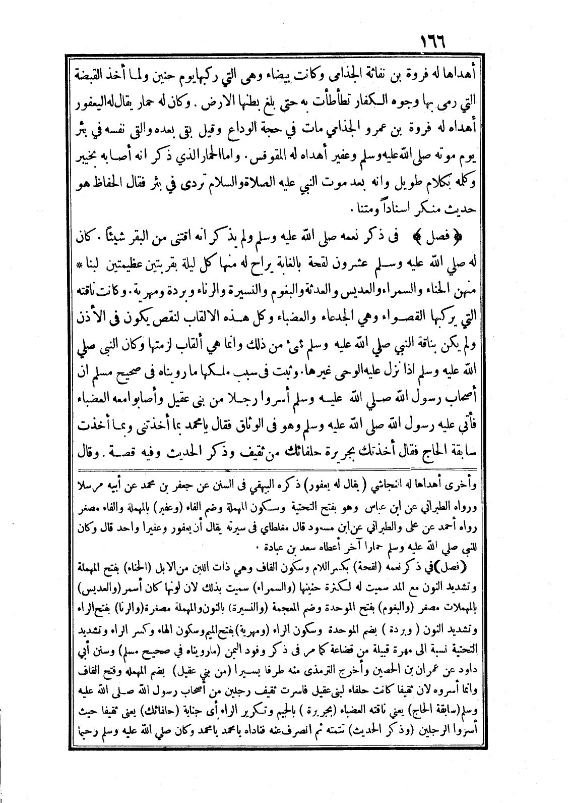 (فصل) في ذكر نعمه صلى الله عليه وسلم ولم يذكر انه اقتنى من البقر شيئا. كان له صلى الله عليه وسلم عشرون لقحة بالغابة يراح له منها كل ليلة بقربتين عظيمتين لبنا* منهن الحناء والسمراء والعديس والعدثة والبغوم والنسيرة والرناء وبردة ومهرية. وكانت ناقته التي يركبها القصواء وهي الجدعاء والعضباء وكل هذه الالقاب لنقص يكون في الأذن ولم يكن بناقة النبي صلى الله عليه وسلم شيء من ذلك وانما هي ألقاب لزمتها وكان النبى صلى الله عليه وسلم اذا نزل عليه الوحى غيرها. وثبت في سبب ملكها ما رويناه في صحيح مسلم ان أصحاب رسول الله صلى الله عليه وسلم أسروا رجلا من بنى عقيل وأصابوا معه العضباء فأتى عليه رسول الله صلى الله عليه وسلم وهو في الوثاق فقال يا محمد بما أخذتنى وبما أخذت سابقة الحاج فقال أخذتك بجريرة حلفائك من ثقيف وذكر الحديث وفيه قصة. وقال وأخرى أهداها له النجاشي (يقال له يعفور) ذكره البيهقي في السنن عن جعفر بن محمد عن أبيه مرسلا ورواه الطبراني عن ابن عباس وهو بفتح التحتية وسكون المهملة وضم الفاء (وعفير) بالمهملة والفاء مصغر رواه أحمد عن على والطبراني عن ابن مسعود قال مغلطاي في سيرته يقال أن يعفور وعفيرا واحد قال وكان للنبى صلى الله عليه وسلم حمارا آخر أعطاه سعد بن عبادة.
