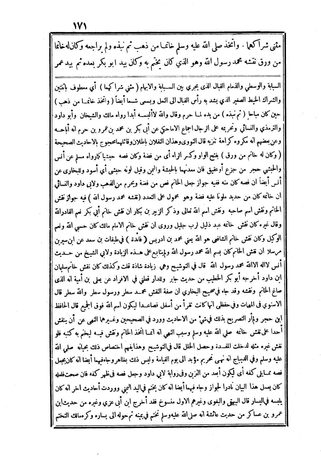 مثنى شراكهما. واتخذ صلى الله عليه وسلم خاتما من ذهب ثم نبذه ولم يراجعه وكان له خاتما من ورق نقشه محمد رسول الله وهو الذي كان يختم به وكان بيد ابو بكر بعده ثم بيد عمر السبابة والوسطي والذمام القبال الذى يجري بين السبابة والابهام (مثني شراكهما) أي معطوف باثنتين والشراك الخيط الصغير الذي يشد به رأس القبال الى النعل ويسمى شسعا أيضا (واتخذ خاتما من ذهب) حين كان مباحا (ثم نبذه) من يده لما حرم وقال والله لا ألبسه أبدا رواه مالك والشيخان وأبو داود والترمذي والنسائي وتحريمه على الرجال اجماع الا ما حكي عن أبى بكر بن محمد بن عمرو بن حرم انه أباحه وعن بعضهم انه مكروه كراهة تنزيه قال النووى وهذان النقلان باطلان وقائلهما محجوج بالاحاديث الصحيحة (وكان له خاتم من ورق) بفتح الواو وكسر الراء أى من فضة وكان فصه حبشيا كما رواه مسلم عن أنس والحبشي حجر من جزع أو عقيق فان معدنهما بالحبشة واليمن وقيل لونه حبشى أي أسود وللبخارى عن أنس أيضا ان فصه كان منه ففيه جواز جعل الخاتم فص من فضة ويحرم من الذهب ولابى داود والنسائي ان خاتمه كان من حديد ملونا عليه فضة وهو محمول على التعدد (نقشه محمد رسول الله) فيه جواز نقش الخاتم ونقش اسم صاحبه ونقش اسم الله تعالى وذكر الزبير بن بكار ان نقش خاتم أبي بكر نعم القادر الله وقال غيره كان نقش خاتمه عبد ذليل لرب جليل وروى ان نقش خاتم الامام مالك كان حسبي الله ونعم الوكيل وكان نقش خاتم الشافعى هو الله يعني محمد بن ادريس (فائدة) في طبقات بن سعد عن ابن سيرين مرسلا ان نقش الخاتم كان بسم الله محمد رسول الله ولم يتابع على هذه الزيادة ولابي الشيخ من حديث أنس لا اله الا الله محمد رسول الله قال في التوشيح وهي زيادة شاذة قلت وكذلك كان نقش خاتم سليمان ابن داود أخرجه أبو بكر الخطيب من حديث جابر وللدار قطني في الافراد عن يعلى بن أمية انه الذى صاغ الخاتم ونقشه وقد جاء في صحيح البخاري ان صفة النقش محمد سطر ورسول سطر والله سطر قال الاسنوي في المهمات وفي حفظى انها كانت تقرأ من أسفل فصاعدا ليكون اسم الله فوق الجميع قال الحافظ ابن حجر ولم أر التصريح بذلك في شيء من الاحاديث وورد في الصحيحين وغيرهما النهى عن أن ينقش أحدا على نقش خاتمه صلى الله عليه وسلم وسبب النهي انه انما اتخذ الخاتم ونقش فيه ليختم به كتبه فلو نقش غيره مثله لدخلت المفسدة وحصل الخلل قال في التوشيح وهذا يفهم اختصاص ذلك بحياته صلى الله عليه وسلم وفي الديباج انه نهى تحريم مؤبد الى يوم القيامة وليس ذلك بظاهر وجاء فيهما أيضا انه كان يجعل فصه مما يلى كفه أى ليكون أبعد من التزين وفي رواية لابي داود وجعل فصه في ظهر كفه فان صحت فلعله كان يعمل هذا البيان نادرا لجواز وجاء فيهما أيضا انه كان يختم في اليد اليمني ووردت أحاديث اخر انه كان يلبسه في اليسار قال البيهقي والبغوى وغيرهم الاول منسوخ فقد أخرج ابن أبى عزي وغيره من حديث ابن عمرو بن عساكر من حديث عائشة انه صلى الله عليه وسلم تختم في يمينه ثم حوله الى يساره وكره مالك التختم