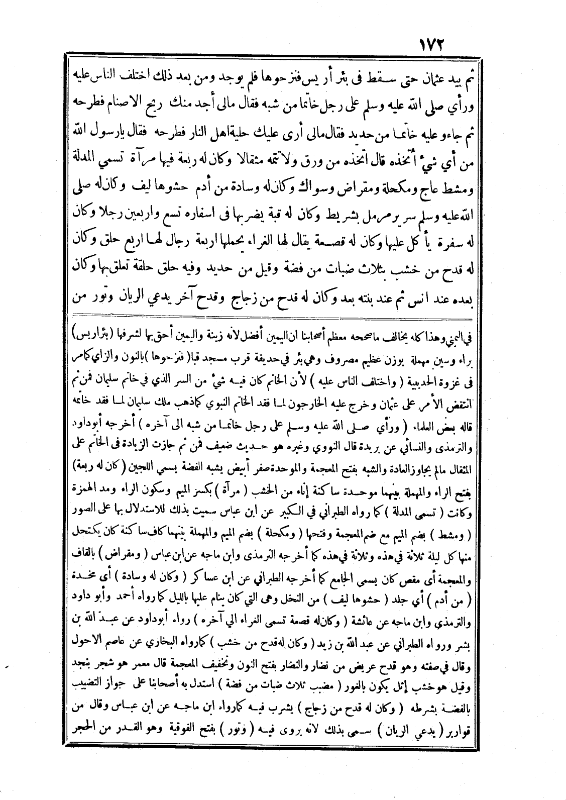 ثم بيد عثمان حتى سقط في بئر أريس فنز حوها فلم يوجد ومن بعد ذلك اختلف الناس عليه ورأي صلى الله عليه وسلم على رجل خاتما من شبه فقال مالى أجد منك ريح الاصنام فطرحه ثم جاء وعليه خاتما من حديد فقال مالى أرى عليك حلية اهل النار فطرحه فقال يا رسول الله من أي شيء أتخذه قال اتخذه من ورق ولا تتمه مثقالا وكان له ربعة فيها مرآة تسمي المدلة ومشط عاج ومكحلة ومقراض وسواك وكان له وسادة من أدم حشوها ليف وكان له صلى الله عليه وسلم سرير مرمل بشريط وكان له قبة يضربها في اسفاره تسع واربعين رجلا وكان له سفرة يأكل عليها وكان له قصعة يقال لها الغراء يحملها اربعة رجال لها اربع حلق وكان له قدح من خشب بثلاث ضبات من فضة وقيل من حديد وفيه حلق حلقة تعلق بها وكان بعده عند انس ثم عند بنته بعد وكان له قدح من زجاج وقدح آخر يدعي الريان وتور من في اليمني وهذا كله يخالف ما صححه معظم أصحابنا ان اليمين أفضل لانه زينة واليمين أحق بها لشرفها (بئر اريس) براء وسين مهملة بوزن عظيم مصروف وهي بئر في حديقة قرب مسجد قبا (فنزحوها) بالنون والزاي كما مر في غزوة الحديبية (واختلف الناس عليه) لأن الخاتم كان فيه شيء من السر الذي في خاتم سليمان فمن ثم انتقض الأمر على عثمان وخرج عليه الخارجون لما فقد الخاتم النبوي كما ذهب ملك سليمان لما فقد خاتمه قاله بعض العلماء (ورأي صلى الله عليه وسلم على رجل خاتما من شبه الى آخره) أخرجه أبو داود والترمذى والنسائي عن بريدة قال النووي وغيره هو حديث ضعيف فمن ثم جازت الزيادة في الخاتم على المثقال ما لم يجاوز العادة والشبه بفتح المعجمة والموحدة صفر أبيض يشبه الفضة يسمي اللجين (كان له ربعة) بفتح الراء والمهملة بينهما موحدة ساكنة إناء من الخشب (مرآة) بكسر الميم وسكون الراء ومد الهمزة وكانت (تسمى المدلة) كما رواه الطبراني في الكبير عن ابن عباس سميت بذلك للاستدلال بها على الصور (ومشط) بضم الميم مع ضم المعجمة وفتحها (ومكحلة) بضم الميم والمهملة بينهما كاف ساكنة كان يكتحل منها كل ليلة ثلاثة في هذه وثلاثة في هذه كما أخرجه الترمذى وابن ماجه عن ابن عباس (ومقراض) بالقاف والمعجمة أى مقص كان يسمى الجامع كما أخرجه الطبراني عن ابن عساكر (وكان له وسادة) أى مخدة (من أدم) أي جلد (حشوها ليف) من النخل وهى التي كان ينام عليها بالليل كما رواه أحمد وأبو داود والترمذي وابن ماجه عن عائشة (وكان له قصعة تسمى الغراء الي آخره) رواه أبو داود عن عبد الله بن بشر ورواه الطبراني عن عبد الله بن زيد (وكان له قدح من خشب) كما رواه البخاري عن عاصم الاحول وقال في صفته وهو قدح عريض من نضار والنضار بفتح النون وتخفيف المعجمة قال معمر هو شجر بنجد وقيل هو خشب إثل يكون بالغور (مضيب ثلاث ضبات من فضة) استدل به أصحابنا على جواز التضبيب بالفضة بشرطه (وكان له قدح من زجاج) يشرب فيه كما رواه ابن ماجه عن ابن عباس وقال من قوارير (يدعي الريان) سمى بذلك لانه يروى فيه (وتور) بفتح الفوقية وهو القدر من الحجر