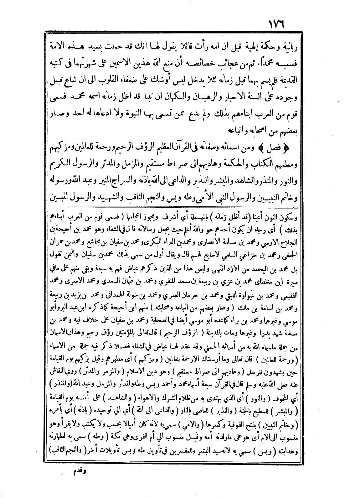 (فصل) ومن اسمائه وصفاته في القرآن العظيم الرؤف الرحيم ورحمة للعالمين ومزكيهم ومعلمهم الكتاب والحكمة وهاديهم الى صراط مستقيم والمزمل والمدثر والرسول الكريم والنور والمنذر والشاهد والمبشر والنذير والداعى الى الله باذنه والسراج المنير وعبد الله ورسوله وخاتم النبيين والرسول النبى الأمى وطه ويس والنجم الثاقب والشهيد والرسول المبين وسكون النون أعينا (قد أظل زمانه) بالمهملة أي أشرف ويجوز اعجامها (فسمى قوم من العرب أبناءهم بذلك) أى رجاء ان يكون أحدهم هو والله أعلم حيث يجعل رسالاته قال في الشفاء وهو محمد بن أحيحة بن الجلاح الاوسي ومحمد بن مسلمة الانصارى ومحمد بن البراء البكرى ومحمد بن سفيان بن مجاشع ومحمد بن حمران الجعفي ومحمد بن خزاعي السلمي لا سابع لهم قال ويقال أول من سمى بذلك محمد بن سفيان واليمن تقول بل محمد بن اليحمد من الازد انتهى وليس هذا من الذين ذكرهم عياض فهم به سبعة وبقى منهم على ما في سيرة ابن مغلطاى محمد بن عزي بن ربيعة بن مسعد المنقري ومحمد بن عثمان السعدي ومحمد الاسرى ومحمد الفقيمى ومحمد بن عيّوارة الليثي ومحمد بن حرمان العمري ومحمد بن خولة الهمداني ومحمد بن يزيد بن ربيعة ومحمد بن اسامة بن مالك (وصار بعضهم من اتباعه وصحابته) منهم ابن أحيحة كما ذكره ابن عبد البر وأبو موسي وغيرهما ومحمد بن براء كما عده أبو موسي أيضا في الصحابة ومحمد بن سفيان على خلاف فيه ومحمد بن مسلمة شهد بدرا وغيرها ومات بالمدينة (الرؤف الرحيم) قال تعالى بِالْمُؤْمِنِينَ رَؤُفٌ رَحِيمٌ وهذان الاسمان من جملة ما سماه الله به من أسمائه الحسني وقد عقد لها عياض في الشفاء فصلا ذكر فيه جملة من الاسماء (ورحمة للعالمين) قال تعالى وَما أَرْسَلْناكَ إِلَّا رَحْمَةً لِلْعالَمِينَ (ومزكيهم) أى مطهرهم وقيل يزكيهم يوم القيامة حين يشهدون للرسل (وهاديهم الى صراط مستقيم) وهو دين الاسلام (والمزمر والمدثر) روي النقاش عنه صلى الله عليه وسلم قال في القرآن سبعة أسماء محمد وأحمد ويس وطه والمدثر والمزمل وعبد الله (والمنذر) أي المخوف (والنور) أي الذي يهتدى به من ظلام الشرك والاهواء (والشاهد) على أمته يوم القيامة (والمبشر) للمطيع بالجنة (والنذير) للعاصى بالنار (والداعى الى الله) أي الي توحيده (باذنه) أي بأمره (وخاتم النبيين) بفتح الفوقية وكسرها (والامي) سمي به لانه كان أميالا يحسب ولا يكتب ولا يقرأ وهو منسوب الى الام أى هو على ما ولدته أمه وقيل منسوب الي أم القرى وهي مكة (وطه) سمى به لطهارته وهدايته (ويس) سمي به لانه سيد البشر وللمفسرين في تأويل طه ويس تأويلات أخر (والنجم الثاقب)