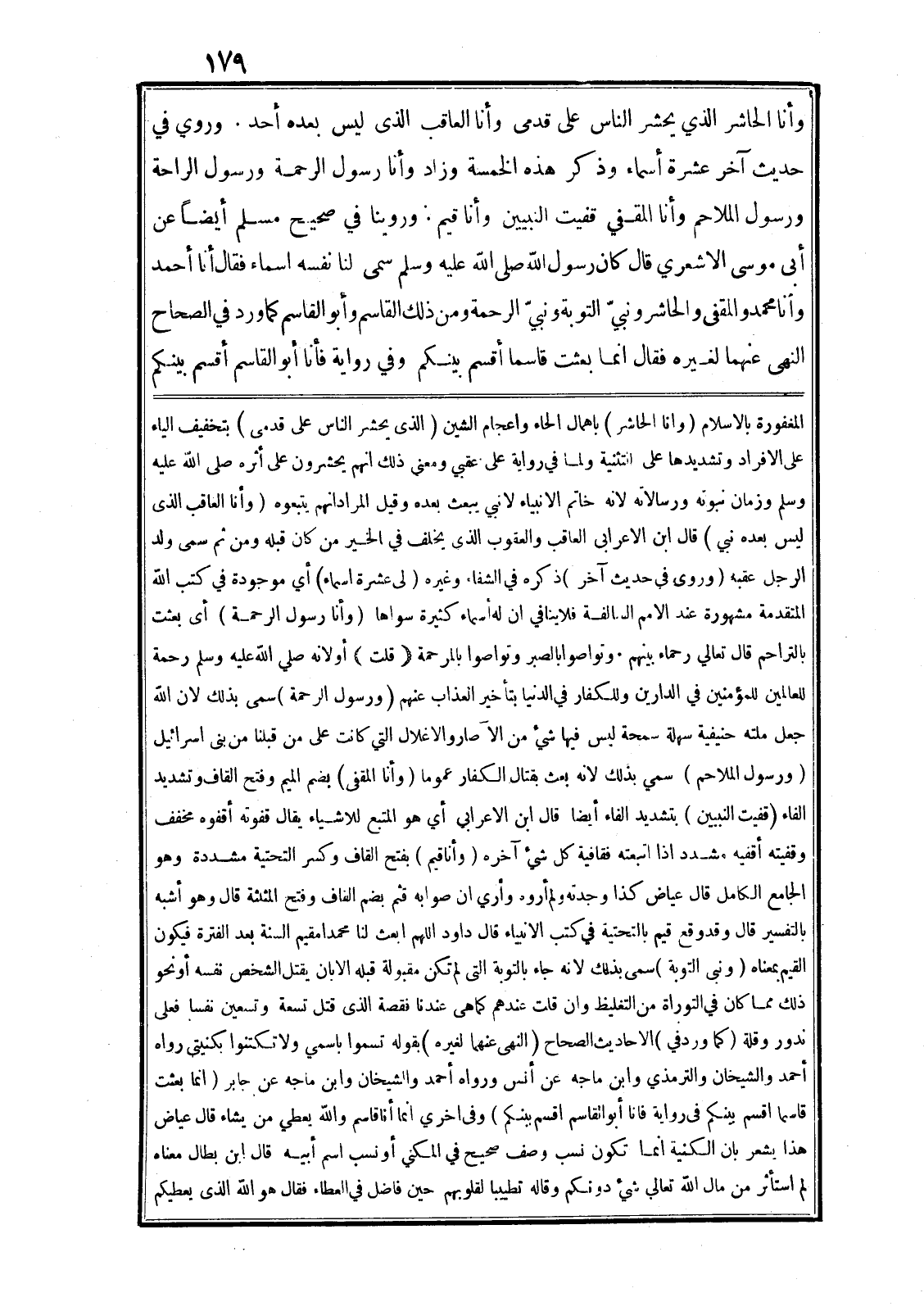 وأنا الحاشر الذي يحشر الناس على قدمى وأنا العاقب الذى ليس بعده أحد. وروي في حديث آخر عشرة أسماء وذكر هذه الخمسة وزاد وأنا رسول الرحمة ورسول الراحة ورسول الملاحم وأنا المقفي قفيت النبيين وأنا قيم. وروينا في صحيح مسلم أيضا عن أبى موسى الاشعري قال كان رسول الله صلى الله عليه وسلم سمى لنا نفسه اسماء فقال أنا أحمد وأنا محمد والمقفي والحاشر ونبيّ التوبة ونبيّ الرحمة ومن ذلك القاسم وأبو القاسم كما ورد في الصحاح النهى عنهما لغيره فقال انما بعثت قاسما أقسم بينكم وفي رواية فأنا أبو القاسم أقسم بينكم المغفورة بالاسلام (وانا الحاشر) باهمال الحاء واعجام الشين (الذى يحشر الناس على قدمى) بتخفيف الياء على الافراد وتشديدها على التثنية ولما في رواية على عقبي ومعنى ذلك انهم يحشرون على أثره صلى الله عليه وسلم وزمان نبوته ورسالاته لانه خاتم الانبياء لا نبي يبعث بعده وقيل المراد انهم يتبعوه (وأنا العاقب الذى ليس بعده نبي) قال ابن الاعرابى العاقب والعقوب الذى يخلف في الخير من كان قبله ومن ثم سمى ولد الرجل عقبه (وروى في حديث آخر) ذكره في الشفاء وغيره (لى عشرة اسماء) أي موجودة في كتب الله المتقدمة مشهورة عند الامم السالفة فلا ينافي ان له أسماء كثيرة سواها (وأنا رسول الرحمة) أى بعثت بالتراحم قال تعالي رحماء بينهم. وتواصوا بالصبر وتواصوا بالمرحمة (قلت) أو لانه صلى الله عليه وسلم رحمة للعالمين للمؤمنين في الدارين وللكفار في الدنيا بتأخير العذاب عنهم (ورسول الرحمة) سمى بذلك لان الله جعل ملته حنيفية سهلة سمحة ليس فيها شيء من الآصار والاغلال التي كانت على من قبلنا من بنى اسرائيل (ورسول الملاحم) سمي بذلك لانه بعث بقتال الكفار عموما (وأنا المقفي) بضم الميم وفتح القاف وتشديد الفاء (قفيت النبيين) بتشديد الفاء أيضا قال ابن الاعرابي أي هو المتبع للاشياء يقال قفوته أقفوه مخفف وقفيته أقفيه مشدد اذا اتبعته فقافية كل شيء آخره (وأناقيم) بفتح القاف وكسر التحتية مشددة وهو الجامع الكامل قال عياض كذا وجدته ولم أروه وأري ان صوابه قثم بضم القاف وفتح المثلثة قال وهو أشبه بالتفسير قال وقد وقع قيم بالتحتية في كتب الانبياء قال داود اللهم ابعث لنا محمدا مقيم السنة بعد الفترة فيكون القيم بمعناه (ونبى التوبة) سمى بذلك لانه جاء بالتوبة التى لم تكن مقبولة قبله الابان يقتل الشخص نفسه أو نحو ذلك مما كان في التوراة من التغليظ وان قلت عندهم كما هى عندنا فقصة الذى قتل تسعة وتسعين نفسا فعلى ندور وقلة (كما ورد في) الاحاديث الصحاح (النهى عنهما لغيره) بقوله تسموا باسمي ولا تكتنوا بكنيتي رواه أحمد والشيخان والترمذي وابن ماجه عن أنس ورواه أحمد والشيخان وابن ماجه عن جابر (انما بعثت قاسما اقسم بينكم في رواية فانا أبو القاسم اقسم بينكم) وفي اخرى انما أنا قاسم والله يعطي من يشاء قال عياض هذا يشعر بان الكنية انما تكون نسب وصف صحيح في المكني أو نسب اسم أبيه قال ابن بطال معناه لم استأثر من مال الله تعالى شيء دونكم وقاله تطييبا لقلوبهم حين فاضل في العطاء فقال هو الله الذى يعطيكم