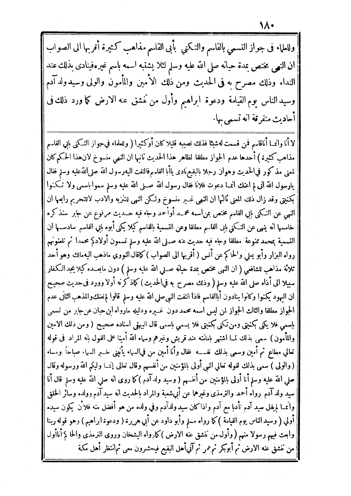 وللعلماء في جواز التسمي بالقاسم والتكني بأبى القاسم مذاهب كثيرة أقربها الى الصواب ان النهى مختص بمدة حياته صلى الله عليه وسلم لئلا يشتبه اسمه باسم غيره فينادى بذلك عند النداء وذلك مصرح به في الحديث ومن ذلك الأمين والمأمون والولى وسيد ولد آدم وسيد الناس يوم القيامة ودعوة ابراهيم وأول من تنشق عنه الارض كما ورد ذلك في أحاديث متفرقة انه تسمى بها.