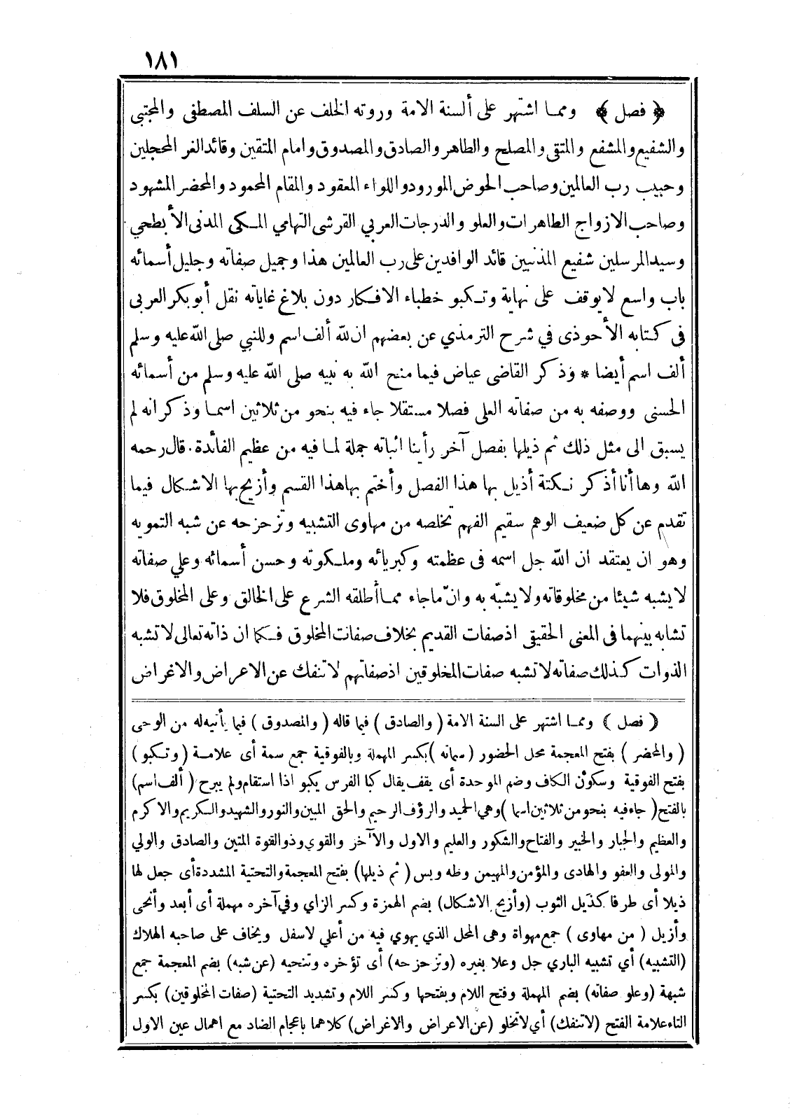 (فصل) ومما اشتهر على ألسنة الامة وروته الخلف عن السلف المصطفي والمجتبى والشفيع والمشفع والمتقى والمصلح والطاهر والصادق والمصدوق وامام المتقين وقائد الغر المحجلين وحبيب رب العالمين وصاحب الحوض المورود واللواء المعقود والمقام المحمود والمحضر المشهود وصاحب الازواج الطاهرات والعلو والدرجات العربي القرشى التهامي المكى المدنى الأبطحي وسيد المرسلين شفيع المذنبين قائد الوافدين على رب العالمين هذا وجميل صفاته وجليل أسمائه باب واسع لا يوقف على نهاية وتكبو خطباء الافكار دون بلاغ غاياته نقل أبو بكر العربى في كتابه الأحوذى في شرح الترمذي عن بعضهم ان لله ألف اسم وللنبي صلى الله عليه وسلم ألف اسم أيضا* وذكر القاضى عياض فيما منح الله به نبيه صلى الله عليه وسلم من أسمائه الحسنى ووصفه به من صفاته العلى فصلا مستقلا جاء فيه بنحو من ثلاثين اسما وذكر انه لم يسبق الى مثل ذلك ثم ذيلها بفصل آخر رأينا اثباته جملة لما فيه من عظيم الفائدة. قال رحمه الله وها أنا أذكر نكتة أذيل بها هذا الفصل وأختم بها هذا القسم وأزيح بها الاشكال فيما تقدم عن كل ضعيف الوهم سقيم الفهم تخلصه من مهاوى التشبيه وتزحزحه عن شبه التمويه وهو ان يعتقد ان الله جل اسمه في عظمته وكبريائه وملكوته وحسن أسمائه وعلي صفاته لا يشبه شيئا من مخلوقاته ولا يشبّه به وانّ ما جاء مما أطلقه الشرع على الخالق وعلى المخلوق فلا تشابه بينهما في المعنى الحقيقى اذ صفات القديم بخلاف صفات المخلوق فكما ان ذاته تعالى لا تشبه الذوات كذلك صفاته لا تشبه صفات المخلوقين اذ صفاتهم لا تنفك عن الاعراض والاغراض (فصل) ومما اشتهر على السنة الامة (والصادق) فيما قاله (والمصدوق) فيما يأتيه له من الوحى (والمحضر) بفتح المعجمة محل الحضور (سماته) بكسر المهملة وبالفوقية جمع سمة أى علامة (وتكبو) بفتح الفوقية وسكون الكاف وضم الموحدة أى يقف يقال كبا الفرس يكبو اذا استقام ولم يبرح (ألف اسم) بالفتح (جاء فيه بنحو من ثلاثين اسما) وهي الحميد والرؤف الرحيم والحق المبين والنور والشهيد والكريم والاكرم والعظيم والجبار والخبير والفتاح والشكور والعليم والاول والآخر والقوي وذو القوة المتين والصادق والولي والمولى والعفو والهادى والمؤمن والمهيمن وطه ويس (ثم ذيلها) بفتح المعجمة والتحتية المشددة أى جعل لها ذيلا أى طرفا كذيل الثوب (وأزيح الاشكال) بضم الهمزة وكسر الزاي وفي آخره مهملة أى أبعد وأنحى وأزيل (من مهاوى) جمع مهواة وهى المحل الذي يهوي فيه من أعلي لاسفل ويخاف على صاحبه الهلاك (التشبيه) أي تشبيه الباري جل وعلا بغيره (وتزحزحه) أى تؤخره وتنحيه (عن شبه) بضم المعجمة جمع شبهة (وعلو صفاته) بضم المهملة وفتح اللام وبفتحها وكسر اللام وتشديد التحتية (صفات المخلوقين) بكسر التاء علامة الفتح (لا تنفك) أي لا تخلو (عن الاعراض والاغراض) كلاهما باعجام الضاد مع اهمال عين الاول