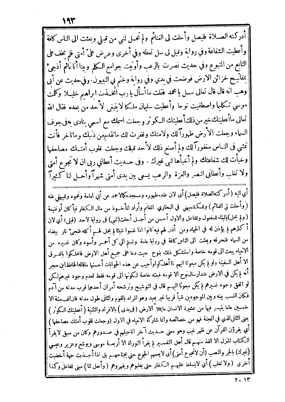 أدركته الصلاة فليصل وأحلت لى الغنائم ولم تحل لنبي من قبلي وبعثت الى الناس كافة وأعطيت الشفاعة وفي رواية وقيل لى سل تعطه وفي أخرى وعرض علىّ أمتى فلم يخف على التابع من المتبوع وفي حديث نصرت بالرعب وأوتيت جوامع الكلم وبينا أنا نائم أذجئ بمفاتيح خزائن الارض فوضعت في يدي وفي رواية وختم بي النبيون. وفي حديث عن أبى وهب انه قال قال تعالى سل يا محمد فقلت ما أسأل يا رب اتخذت ابراهيم خليلا وكلمت موسي تكليما واصطفيت نوحا وأعطيت سليمان ملكا لا ينبغى لأحد من بعده فقال الله تعالى ما أعطيتك خير من ذلك أعطيتك الكوثر وجعلت اسمك مع اسمي ينادى به في جوف السماء وجعلت الأرض طهورا لك ولامتك وغفرت لك ما تقدم من ذنبك وما تاخر فأنت تمشي في الناس مغفورا لك ولم أصنع ذلك لأحد قبلك وجعلت قلوب أمتك مصاحفها وخبأت لك شفاعتك ولم أخبأها لنبى غيرك. وفي حديث أعطاني ربى ان لا تجوع أمتى ولا تغلب وأعطانى النصر والعزة والرعب يسعى بين يدى أمتى شهرا وأحل لنا كثيرا أي اليه (أدركته الصلاة فليصل) أى لان عنده طهوره ومسجده كما لاحمد عن أبي امامة ونحوه وللبيهقي عنه (وأحلت لي الغنائم) وللكشميهني في البخاري المغانم وأراد المأخوذ من مال الكفار فيأ كان أو غنيمة (ولم يحل) بالبناء للمفعول وللفاعل والاول أحسن من أجل أحلت (لنبى) في رواية لاحد (قبلى) أي لان أكثرهم لم يؤذن له في الجهاد ومن أذن لهم فيه كانوا اذا غنموا شيئا لم يحل لهم أكله فتجئ نار بيضاء من السماء فتحرقه وبعثت الى الناس كافة في رواية عامة ولمسلم الي كل أحمر وأسود وكان غيره من الانبياء يبعث الى قومه خاصة واستشكل ذلك بنوح حيث دعا على جميع أهل الارض فاهلكوا بالغرق الا أهل السفينة ولو لم يكن مبعوثا اليهم لما أهلكوا وأجيب عن هذه الجوابات أحسنها ما قاله الحافظ ابن حجر أنه لم يكن في الارض عند ارسال نوح الا قومه فبعثه خاصة لكونها الى قومه فقط لعدم وجود غيرهم لكن لو اتفق وجود غيرهم لم يكن مبعوثا اليهم قال في التوشيح وترشحه أمران أحدهما قرب مدته من آدم فكان النسب بينه وبين الموجودين شيأ قريبا غير بعيد وهو المراد بالقوم والثانى طول مدته فان الف سنة الا خمسين عاما يتيسر فيها من عشيرة الانسان ما يملأ الارض (في يدى) بالافراد والتثنية (أعطيتك الكوثر) يعنى الثانى الذي في الجنة فهو من خصائصه وانما شاركه الانبياء في الاول (وجعلت قلوب أمتك مصاحفها) أي يقرؤن القرآن عن ظهر غيب وهو معني حديث آخر اناجيلهم في صدورهم وكان من سبق لا يقرأ الكتاب المنزل الا الفذ منهم قال أهل التفسير لم يقرأ التوراة الا أربعة موسى ويوشع وعزير وعيسي (غيرك) بالجر والنصب (أن لا تجوع أمتى) أى لا يعمهم الجوع حتى يجتاحهم بل اذا أجذبت جهة أخضبت أخري (ولا تغلب) أي لا يسلط عليهم الكفار حتى يغلبوهم ويقهروهم (وأحل لنا) مبنى للفاعل وكذا