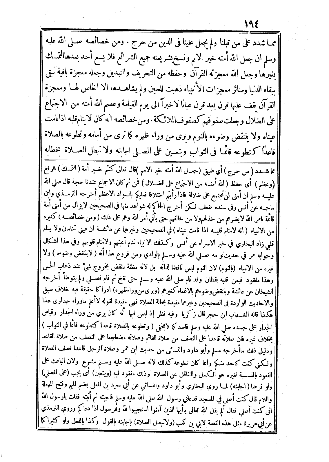 مما شدد على من قبلنا ولم يجعل علينا في الدين من حرج. ومن خصائصه صلى الله عليه وسلم ان جعل الله أمته خير الامم ونسخ بشريعته جميع الشرائع فلا يسع أحد بعدها التمسك بغيرها وجعل الله معجزته القرآن وحفظه من التحريف والتبديل وجعله معجزة باقية تبقى ببقاء الدنيا وسائر معجزات الأنبياء ذهبت للحين ولم يشاهدها الا الخاص لها ومعجزة القرآن يقف عليها قرن بعد قرن عيانا لا خبرا الى يوم القيامة وعصم الله أمته من الاجتماع على الضلال وجعلت صفوفهم كصفوف الملائكة. ومن خصائصه انه كان لا ينام قلبه اذا نامت عيناه ولا ينتقض وضوءه بالنوم ويرى من وراء ظهره كما ترى من أمامه وتطوعه بالصلاة قاعدا كتطوعه قائما في الثواب ويتعين على المصلى اجابته ولا تبطل الصلاة بخطابه مما شدد (من حرج) أي ضيق (جعل الله أمته خير الامم) قال تعالى كُنْتُمْ خَيْرَ أُمَّةٍ (التمسك) بالرفع (وعظم) أى حفظ (الله أمته من الاجتماع على الضلال) فمن ثم كان الاجماع عندنا حجة قال صلى الله عليه وسلم ان أمتى لن تجتمع على ضلالة فاذا رأيتم اختلافا فعليكم بالسواد الاعظم أخرجه الترمذي وابن ماجه عن أنس وفي سنده ضعف لكن أخرج الحاكم له شواهد منها في الصحيحين لا يزال من أمتى أمة قائمة بامر الله لا يضرهم من خذلهم ولا من خالفهم حتى يأتي أمر الله وهم على ذلك (ومن خصائصه) كغيره من الانبياء (انه لا ينام قلبه اذا نامت عيناه) في الصحيحين وغيرهما عن عائشة ان عيني تنامان ولا ينام قلبي زاد البخاري في خبر الاسراء عن أنس وكذلك الانبياء تنام أعينهم ولا تنام قلوبهم وفي هذا اشكال وجوابه مر في حديث نومه صلى الله عليه وسلم بالوادي ومن فروع هذا أنه (لا ينتقض وضوءه) ولا غيره من الانبياء (بالنوم) لان النوم ليس ناقضا لذاته بل لانه مظنة للنقض بخروج شيء عند ذهاب الحس وهذا مفقود فيمن قلبه يقظان وقد نام صلى الله عليه وسلم حتى نفخ ثم قام فصلي ولم يتوضأ أخرجه الشيخان عن عائشة وينتقض وضوءهم بالاغماء كغيرهم (ويرى من وراء ظهره) ادراكا حقيقة فيه خلاف سبق والاحاديث الواردة في الصحيحين وغيرهما مقيدة بحالة الصلاة فهى مقيدة لقوله لا أعلم ما وراء جدارى هذا هكذا قاله الشهاب ابن حجر قال زكريا وفيه نظر إذ ليس فيها أنه كان يري من وراء الجدار وقياس الجدار على جسده صلى الله عليه وسلم فاسد كما لا يخفي (وتطوعه بالصلاة قاعدا كتطوعه قائما في الثواب) بخلاف غيره فان صلاته قاعدا على النصف من صلاة القائم وصلاته مضطجعا على النصف من صلاة القاعد ودليل ذلك ما أخرجه مسلم وأبو داود والنسائى من حديث ابن عمر وصلاة الرجل قاعدا نصف الصلاة ولكني كنت كاحد منكم وانما كان تطوعه كذلك لانه صلى الله عليه وسلم مشرع ولان الباعث على القعود بالنسبة لغيره هو الكسل والتثاقل عن الصلاة وذلك مفقود فيه (ويتعين) أى يجب (على المصلي) ولو فرضا (اجابته) لما روي البخاري وأبو داود والنسائي عن أبي سعيد بن المعلى بضم الميم وفتح المهملة واللام قال كنت أصلى في المسجد فدعاني رسول الله صلى الله عليه وسلم فاجبته ثم أتيته فقلت يا رسول الله انى كنت أصلي فقال ألم يقل الله تعالى يا أَيُّهَا الَّذِينَ آمَنُوا اسْتَجِيبُوا لِلَّهِ وَلِلرَّسُولِ إِذا دَعاكُمْ وروي الترمذي عن أبي هريرة مثل هذه القصة لابي بن كعب (ولا تبطل الصلاة) باجابته بالقول وكذا بالفعل ولو كثيرا كما
