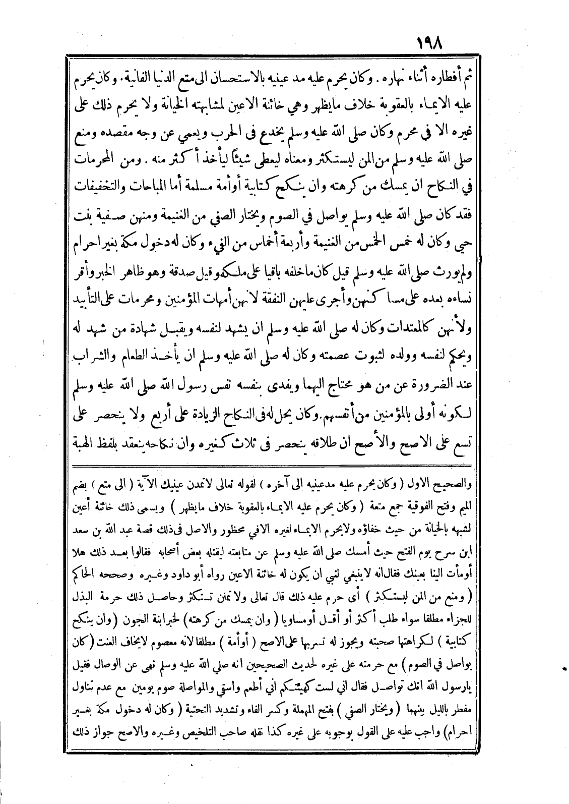 ثم أفطاره أثناء نهاره. وكان يحرم عليه مد عينيه بالاستحسان الى متع الدنيا الفانية. وكان يحرم عليه الايماء بالعقوبة خلاف ما يظهر وهي خائنة الاعين لمشابهته الخيانة ولا يحرم ذلك على غيره الا في محرم وكان صلى الله عليه وسلم يخدع في الحرب ويعمي عن وجه مقصده ومنع صلى الله عليه وسلم من المن ليستكثر ومعناه ليعطى شيئا ليأخذ أكثر منه. ومن المحرمات في النكاح ان يمسك من كرهته وان ينكح كتابية أو أمة مسلمة أما المباحات والتخفيفات فقد كان صلى الله عليه وسلم يواصل في الصوم ويختار الصفي من الغنيمة ومنهن صفية بنت حي وكان له خمس الخمس من الغنيمة وأربعة أخماس من الفيء وكان له دخول مكة بغير احرام ولم يورث صلى الله عليه وسلم قيل كان ما خلفه باقيا على ملكه وقيل صدقة وهو ظاهر الخبر وأقر نساءه بعده على مساكنهن وأجرى عليهن النفقة لانهن أمهات المؤمنين ومحرمات على التأبيد ولأنهن كالمعتدات وكان له صلى الله عليه وسلم ان يشهد لنفسه ويقبل شهادة من شهد له ويحكم لنفسه وولده لثبوت عصمته وكان له صلى الله عليه وسلم ان يأخذ الطعام والشراب عند الضرورة عن من هو محتاج اليهما ويفدى بنفسه نفس رسول الله صلى الله عليه وسلم لكونه أولى بالمؤمنين من أنفسهم. وكان يحل له في النكاح الزيادة على أربع ولا ينحصر على تسع على الاصح والأصح ان طلاقه ينحصر في ثلاث كغيره وان نكاحه ينعقد بلفظ الهبة والصحيح الاول (وكان يحرم عليه مدعينيه الى آخره) لقوله تعالى لا تَمُدَّنَّ عَيْنَيْكَ الآية (الى متع) بضم الميم وفتح الفوقية جمع متعة (وكان يحرم عليه الايماء بالعقوبة خلاف ما يظهر) ويسمى ذلك خائنة أعين لشبهه بالخيانة من حيث خفاؤه ولا يحرم الايماء لغيره الافي محظور والاصل في ذلك قصة عبد الله بن سعد ابن سرح يوم الفتح حيث أمسك صلى الله عليه وسلم عن متابعته ليقتله بعض أصحابه فقالوا بعد ذلك هلا أو مأت الينا بعينك فقال انه لا ينبغي لنبي ان يكون له خائنة الاعين رواه أبو داود وغيره وصححه الحاكم (ومنع من المن ليستكثر) أى حرم عليه ذلك قال تعالى وَلا تَمْنُنْ تَسْتَكْثِرُ وحاصل ذلك حرمة البذل للجزاء مطلقا سواء طلب أكثر أو أقل أو مساويا (وان يمسك من كرهته) لخبر ابنة الجون (وان ينكح كتابية) لكراهتها صحبته ويجوز له تسريها على الاصح (أو أمة) مطلقا لانه معصوم لا يخاف العنت (كان يواصل في الصوم) مع حرمته على غيره لحديث الصحيحين انه صلى الله عليه وسلم نهى عن الوصال فقيل يا رسول الله انك تواصل فقال اني لست كهيئتكم اني أطعم واسقي والمواصلة صوم يومين مع عدم تناول مفطر بالليل بينهما (ويختار الصفي) بفتح المهملة وكسر الفاء وتشديد التحتية (وكان له دخول مكة بغير احرام) واجب عليه على القول بوجوبه على غيره كذا نقله صاحب التلخيص وغيره والاصح جواز ذلك