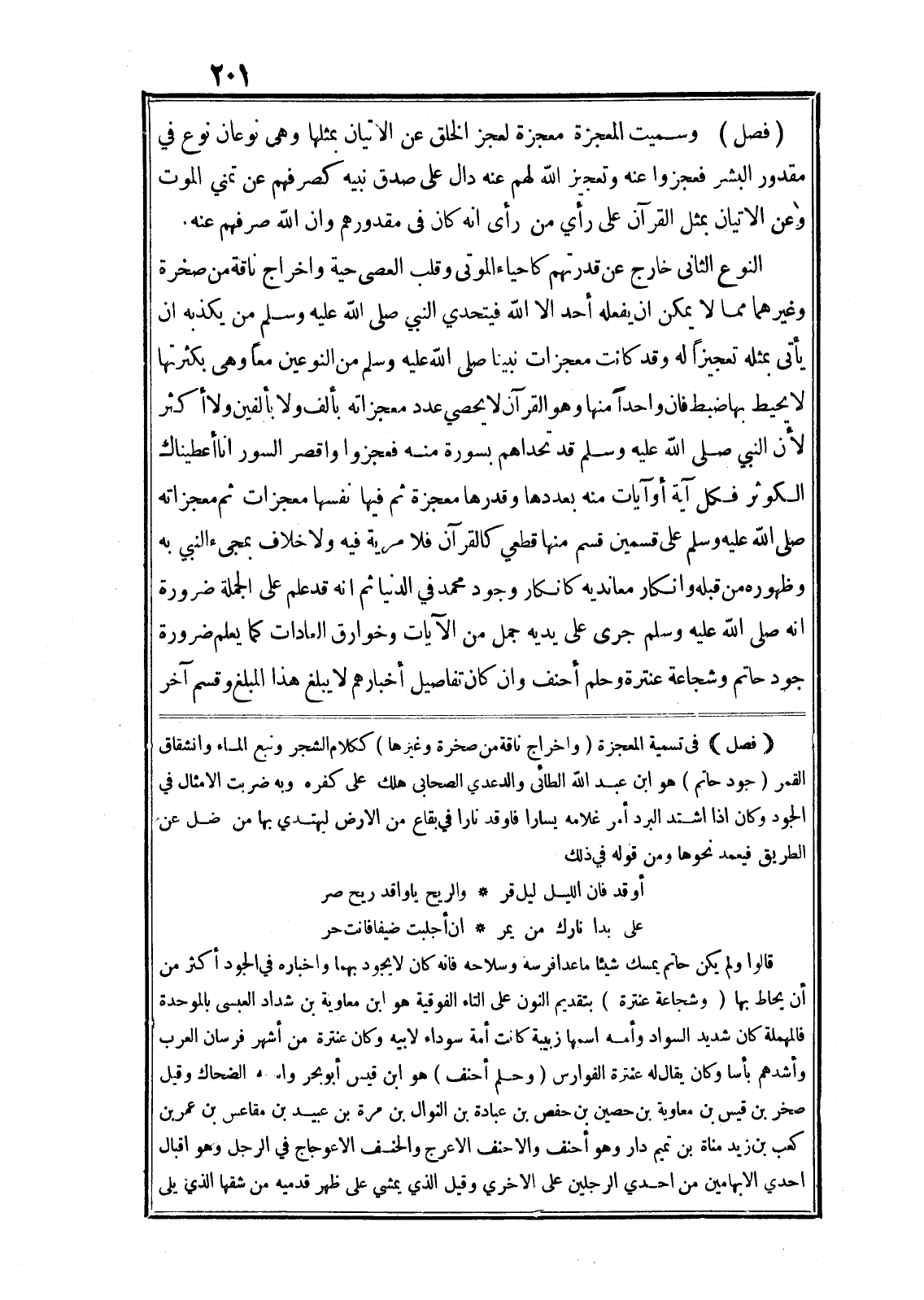 النوع الثانى خارج عن قدرتهم كاحياء الموتى وقلب العصى حية واخراج ناقة من صخرة وغيرهما مما لا يمكن ان يفعله أحد الا الله فيتحدي النبي صلى الله عليه وسلم من يكذبه ان يأتى بمثله تعجيزا له وقد كانت معجزات نبينا صلى الله عليه وسلم من النوعين معا وهى بكثرتها لا يحيط بها ضبط فان واحدا منها وهو القرآن لا يحصي عدد معجزاته بألف ولا بألفين ولا أكثر لأن النبي صلى الله عليه وسلم قد تحداهم بسورة منه فعجزوا واقصر السور انا أعطيناك الكوثر فكل آية أو آيات منه بعددها وقدرها معجزة ثم فيها نفسها معجزات ثم معجزاته صلى الله عليه وسلم على قسمين قسم منها قطعي كالقرآن فلا مرية فيه ولا خلاف بمجىء النبي به وظهوره من قبله وانكار معانديه كانكار وجود محمد في الدنيا ثم انه قد علم على الجملة ضرورة انه صلى الله عليه وسلم جرى على يديه جمل من الآيات وخوارق العادات كما يعلم ضرورة جود حاتم وشجاعة عنترة وحلم أحنف وان كان تفاصيل أخبارهم لا يبلغ هذا المبلغ وقسم آخر (فصل) في تسمية المعجزة (واخراج ناقة من صخرة وغيرها) ككلام الشجر ونبع الماء وانشقاق القمر (جود حاتم) هو ابن عبد الله الطائى والدعدي الصحابى هلك على كفره وبه ضربت الامثال في الجود وكان اذا اشتد البرد أمر غلامه يسارا فاوقد نارا في بقاع من الارض ليهتدي بها من ضل عن الطريق فيعمد نحوها ومن قوله في ذلك