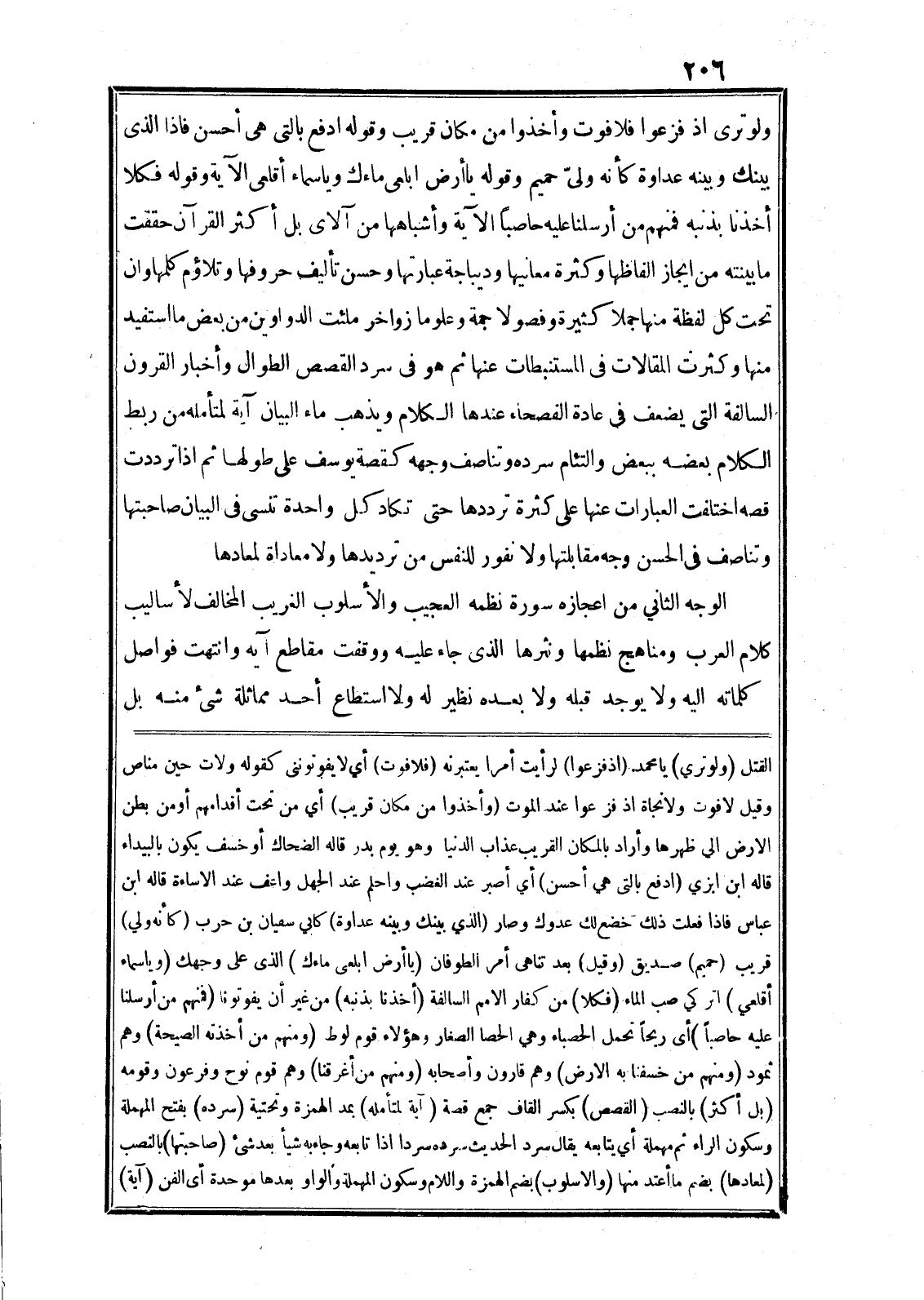 الوجه الثاني من اعجازه سورة نظمه العجيب والأسلوب الغريب المخالف لأساليب كلام العرب ومناهج نظمها ونثرها الذى جاء عليه ووقفت مقاطع آيه وانتهت فواصل كلماته اليه ولا يوجد قبله ولا بعده نظير له ولا استطاع أحد مماثلة شيء منه بل القتل (وَلَوْ تَرى) يا محمد (إِذْ فَزِعُوا) لرأيت أمرا يعتبرنه (فَلا فَوْتَ) أي لا يفوتوننى كقوله وَلاتَ حِينَ مَناصٍ وقيل لا فوت ولا نجاة اذ فزعوا عند الموت (وَأُخِذُوا مِنْ مَكانٍ قَرِيبٍ) أي من تحت أقدامهم أو من بطن الارض الى ظهرها وأراد بالمكان القريب عذاب الدنيا وهو يوم بدر قاله الضحاك أو خسف يكون بالبيداء قاله ابن ابزي (ادْفَعْ بِالَّتِي هِيَ أَحْسَنُ) أي أصبر عند الغضب واحلم عند الجهل واعف عند الاساءة قاله ابن عباس فاذا فعلت ذلك خضع لك عدوك وصار (الَّذِي بَيْنَكَ وَبَيْنَهُ عَداوَةٌ) كابي سفيان بن حرب (كَأَنَّهُ وَلِيٌّ) قريب (حَمِيمٌ) صديق (وقيل) بعد تناهى أمر الطوفان (يا أَرْضُ ابْلَعِي ماءَكِ) الذى على وجهك (وَيا سَماءُ أَقْلِعِي) اتركي صب الماء (فَكُلًّا) من كفار الامم السالفة (أَخَذْنا بِذَنْبِهِ) من غير أن يفوتونا (فَمِنْهُمْ مَنْ أَرْسَلْنا عَلَيْهِ حاصِباً) أى ريحا تحمل الحصباء وهي الحصا الصغار وهؤلاء قوم لوط (وَمِنْهُمْ مَنْ أَخَذَتْهُ الصَّيْحَةُ) وهم ثمود (وَمِنْهُمْ مَنْ خَسَفْنا بِهِ الْأَرْضَ) وهم قارون وأصحابه (وَمِنْهُمْ مَنْ أَغْرَقْنا) وهم قوم نوح وفرعون وقومه (بل أكثر) بالنصب (القصص) بكسر القاف جمع قصة (آية لمتأمله) بمد الهمزة وتحتية (سرده) بفتح المهملة وسكون الراء ثم مهملة أي يتابعه يقال سرد الحديث سرده سردا اذا تابعه وجاء به شيأ بعد شيء (صاحبتها) بالنصب (لمعادها) بضم ما أعتد منها (والاسلوب) بضم الهمزة واللام وسكون المهملة والواو بعدها موحدة أى الفن (آية)
