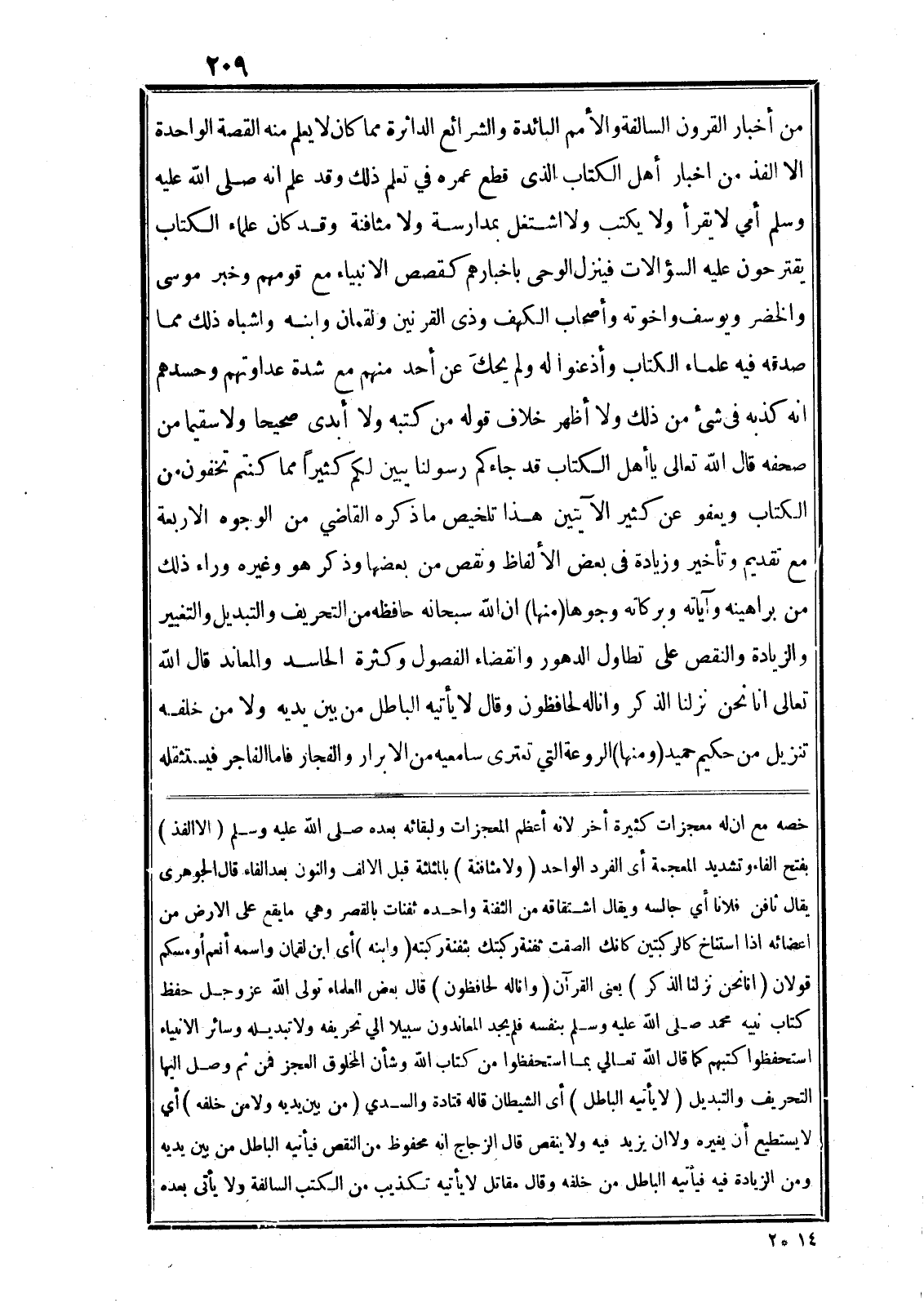 من أخبار القرون السالفة والأمم البائدة والشرائع الدائرة مما كان لا يعلم منه القصة الواحدة الا الفذ من اخبار أهل الكتاب الذى قطع عمره في تعلم ذلك وقد علم انه صلى الله عليه وسلم أمي لا يقرأ ولا يكتب ولا اشتغل بمدارسة ولا مثافنة وقد كان علماء الكتاب يقترحون عليه السؤالات فينزل الوحى باخبارهم كقصص الانبياء مع قومهم وخبر موسى والخضر ويوسف واخوته وأصحاب الكهف وذى القرنين ولقمان وابنه واشباه ذلك مما صدقه فيه علماء الكتاب وأذعنوا له ولم يحك عن أحد منهم مع شدة عداوتهم وحسدهم انه كذبه في شيء من ذلك ولا أظهر خلاف قوله من كتبه ولا أبدى صحيحا ولا سقيما من صحفه قال الله تعالى يا أَهْلَ الْكِتابِ قَدْ جاءَكُمْ رَسُولُنا يُبَيِّنُ لَكُمْ كَثِيراً مِمَّا كُنْتُمْ تُخْفُونَ مِنَ الْكِتابِ وَيَعْفُوا عَنْ كَثِيرٍ الآيتين هذا تلخيص ما ذكره القاضي من الوجوه الاربعة مع تقديم وتأخير وزيادة في بعض الألفاظ ونقص من بعضها وذكر هو وغيره وراء ذلك من براهينه وآياته وبركاته وجوها (منها) ان الله سبحانه حافظه من التحريف والتبديل والتغيير والزيادة والنقص على تطاول الدهور وانقضاء الفصول وكثرة الحاسد والمعاند قال الله تعالى إِنَّا نَحْنُ نَزَّلْنَا الذِّكْرَ وَإِنَّا لَهُ لَحافِظُونَ وقال لا يَأْتِيهِ الْباطِلُ مِنْ بَيْنِ يَدَيْهِ وَلا مِنْ خَلْفِهِ تَنْزِيلٌ مِنْ حَكِيمٍ حَمِيدٍ (ومنها) الروعة التي تعترى سامعيه من الابرار والفجار فاما الفاجر فيستثقله خصه مع ان له معجزات كثيرة أخر لانه أعظم المعجزات ولبقائه بعده صلى الله عليه وسلم (الا الفذ) بفتح الفاء وتشديد المعجمة أى الفرد الواحد (ولا مثافنة) بالمثلثة قبل الالف والنون بعد الفاء قال الجوهرى يقال ثافن فلانا أي جالسه ويقال اشتقاقه من الثفنة واحده ثفنات بالقصر وهي ما يقع على الارض من اعضائه اذا استناخ كالركبتين كانك الصقت ثفنة ركبتك بثفنة ركبته (وابنه) أى ابن لقمان واسمه أنعم أو مسكم قولان (إِنَّا نَحْنُ نَزَّلْنَا الذِّكْرَ) يعنى القرآن (وَإِنَّا لَهُ لَحافِظُونَ) قال بعض العلماء تولى الله عز وجل حفظ كتاب نبيه محمد صلى الله عليه وسلم بنفسه فلم يجد المعاندون سبيلا الي تحريفه ولا تبديله وسائر الانبياء استحفظوا كتبهم كما قال الله تعالي بِمَا اسْتُحْفِظُوا مِنْ كِتابِ اللَّهِ وشأن المخلوق العجز فمن ثم وصل اليها التحريف والتبديل (لا يَأْتِيهِ الْباطِلُ) أى الشيطان قاله قتادة والسدي (مِنْ بَيْنِ يَدَيْهِ وَلا مِنْ خَلْفِهِ) أي لا يستطيع أن يغيره ولا ان يزيد فيه ولا ينقص قال الزجاج انه محفوظ من النقص فيأتيه الباطل من بين يديه ومن الزيادة فيه فيأتيه الباطل من خلفه وقال مقاتل لا يأتيه تكذيب من الكتب السالفة ولا يأتى بعده