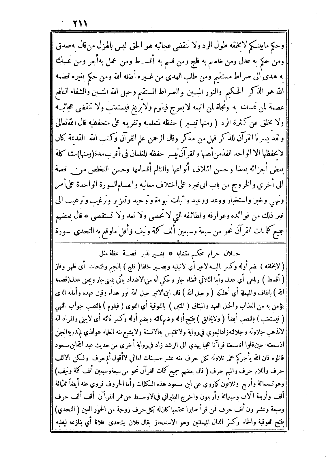 وحكم ما بينكم لا يخلقه طول الرد ولا تنقضى عجائبه هو الحق ليس بالهزل من قال به صدق ومن حكم به عدل ومن خاصم به فلج ومن قسم به أقسط ومن عمل به أجر ومن تمسك به هدى الى صراط مستقيم ومن طلب الهدى من غيره أضله الله ومن حكم بغيره قصمه الله هو الذكر الحكيم والنور المبين والصراط المستقيم وحبل الله المتين والشفاء النافع عصمة لمن تمسك به ونجاة لمن اتبعه لا يعوج فيقوم ولا يزيغ فيستعتب ولا تنقضى عجائبه ولا يخلق عن كثرة الرد (ومنها تيسير) حفظه لمتعلميه وتقريبه على متحفظيه قال الله تعالى وَلَقَدْ يَسَّرْنَا الْقُرْآنَ لِلذِّكْرِ فَهَلْ مِنْ مُدَّكِرٍ وقال الرَّحْمنُ عَلَّمَ الْقُرْآنَ وكتب الله القديمة كان لا يحفظها الا الواحد الفذ من أهلها والقرآن تيسر حفظه للغلمان في أقرب مدة (ومنها) مشاكلة بعض أجزائه بعضا وحسن ائتلاف أنواعها والتئام أقسامها وحسن التخلص من قصة الى أخري والخروج من باب الى غيره على اختلاف معانيه وانقسام السورة الواحدة على أمر ونهي وخبر واستخبار ووعد ووعيد واثبات نبوءة وتوحيد وتعزير وترغيب وترهيب الى غير ذلك من فوائده وعوارفه ولطائفه التي لا تحصى ولا تعد ولا تستقصى* قال بعضهم جميع كلمات القرآن نحو من سبعة وسبعين ألف كلمة ونيف وأقل ما وقع به التحدى سورة