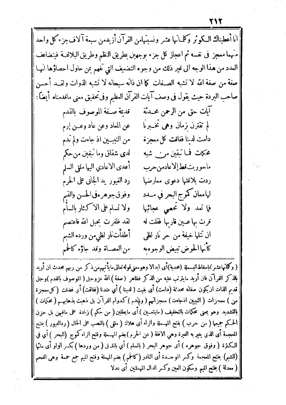إِنَّا أَعْطَيْناكَ الْكَوْثَرَ وكلماتها عشر ونسبتها من القرآن أزيد من سبعة آلاف جزء كل واحد منهما معجز في نفسه ثم اعجاز كل جزء بوجهين بطريق النظم وطريق البلاغة فيتضاعف العدد من هذا الوجه الى غير ذلك من وجوه التضعيف التي تفهم بمن حاول احصاؤها انها صفة من صفة الله لا تشبه الصفات كما ان ذاته سبحانه لا تشبه الذوات ولقد أحسن صاحب البردة حيث يقول في وصف آيات القرآن العظيم وفي تحقيق معنى ما قدمناه أيضا: