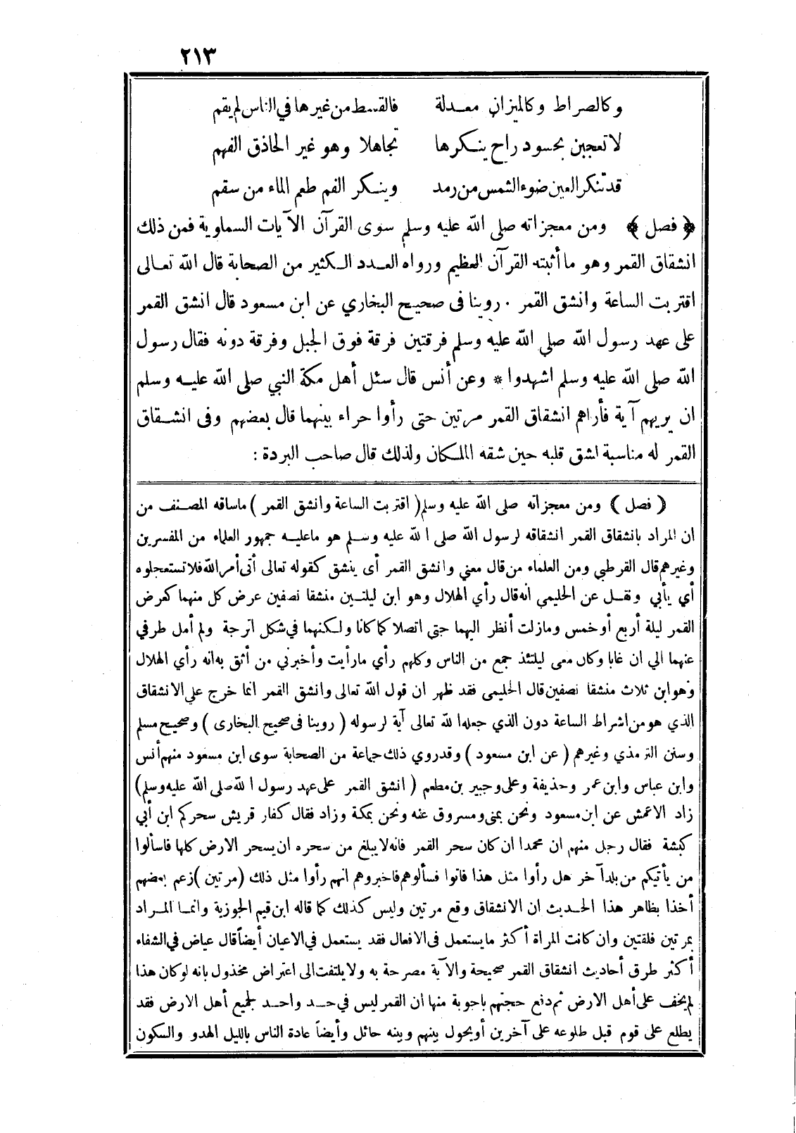 فمن ذلك انشقاق القمر وهو ما أثبته القرآن العظيم ورواه العدد الكثير من الصحابة قال الله تعالى اقْتَرَبَتِ السَّاعَةُ وَانْشَقَّ الْقَمَرُ. روينا في صحيح البخاري عن ابن مسعود قال انشق القمر على عهد رسول الله صلى الله عليه وسلم فرقتين فرقة فوق الجبل وفرقة دونه فقال رسول الله صلى الله عليه وسلم اشهدوا* وعن أنس قال سئل أهل مكة النبي صلى الله عليه وسلم ان يريهم آية فأراهم انشقاق القمر مرتين حتى رأوا حراء بينهما قال بعضهم وفي انشقاق القمر له مناسبة لشق قلبه حين شقه الملكان ولذلك قال صاحب البردة:
