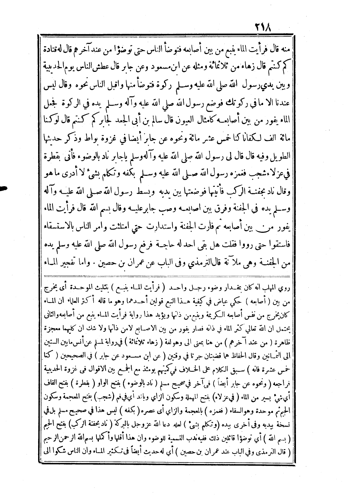 منه قال فرأيت الماء ينبع من بين أصابعه فتوضأ الناس حتى توضؤا من عند آخرهم قال له قتادة كم كنتم قال زهاء من ثلاثمائة ومثله عن ابن مسعود وعن جابر قال عطش الناس يوم الحديبية وبين يدي رسول الله صلى الله عليه وسلم ركوة فتوضأ منها واقبل الناس نحوه وقال ليس عندنا الا ما في ركوتك فوضع رسول الله صلى الله عليه وآله وسلم يده في الركوة فجعل الماء يفور من بين أصابعه كامثال العيون قال سالم بن أبى الجعد لجابركم كنتم قال لو كنا مائة الف لكفانا كنا خمس عشر مائة ونحوه عن جابر أيضا في غزوة بواط وذكر حديثها الطويل وفيه قال قال لى رسول الله صلى الله عليه وآله وسلم يا جابر ناد بالوضوء فأتى بقطرة في عزلاء شجب فغمزه رسول الله صلى الله عليه وسلم بكفه وتكلم بشيء لا أدرى ما هو وقال ناد بجفنة الركب فأتيتها فوضعتها بين يديه وبسط رسول الله صلى الله عليه وآله وسلم يده في الجفنة وفرق بين اصابعه وصب جابر عليه وقال بسم الله قال فرأيت الماء يفور من بين أصابعه ثم فارت الجفنة واستدارت حتى امتلئت وامر الناس بالاستسقاء فاستقوا حتى رووا فقلت هل بقى احد له حاجة فرفع رسول الله صلى الله عليه وسلم يده من الجفنة وهى ملآنة قال الترمذي وفي الباب عن عمران بن حصين. واما تفجير الماء روي المهلب انه كان بمقدار وضوء رجل واحد (فرأيت الماء ينبع) بتثليث الموحدة أى يخرج من بين (أصابعه) حكي عياض في كيفية هذا النبع قولين أحدهما وهو ما قاله أكثر العلماء ان الماء كان يخرج من نفس أصابعه الكريمة وينبع من ذاتها ويؤيد هذا رواية فرأيت الماء ينبع من أصابعه والثانى يحتمل ان الله تعالي كثر الماء في ذاته فصار يفور من بين الاصابع لا من ذاتها ولا شك ان كليهما معجزة ظاهرة (من عند آخرهم) من هنا بمعنى الى وهو لغة (زهاء ثلاثمائة) في رواية لمسلم عن أنس ما بين الستين الى الثمانين وقال الحفاظ هما قضيتان جرتا في وقتين (عن ابن مسعود عن جابر) في الصحيحين (كنا خمس عشرة فانه) سبق الكلام على الخلاف في كميتهم يومئذ مع الجمع بين الاقوال في غزوة الحديبية فراجعه (ونحوه عن جابر أيضا) في آخر في صحيح مسلم (ناد بالوضوء) بفتح الواو (بقطرة) بفتح القاف أي شيء يسير من الماء (في عزلاء) بفتح المهملة وسكون الزاي وبالمد أي في فم (شجب) بفتح المعجمة وسكون الجيم ثم موحدة وهو السقاء (فغمزه) بالمعجمة والزاي أى عصره (بكفه) ليس هذا في صحيح مسلم بل في نسخة بيديه وفي أخرى بيده (وتكلم بشيء) لعله دعا الله عز وجل بالبركة (ناد بحفنة الركب) بفتح الجيم (بسم الله) أي توضؤا قائلين ذلك ففيه ندب التسمية للوضوء وان هذا أقلها وأكملها بسم الله الرحمن الرحيم (قال الترمذى وفي الباب عند عمران بن حصين) أي له حديث أيضا في تكثير الماء وان الناس شكوا الى