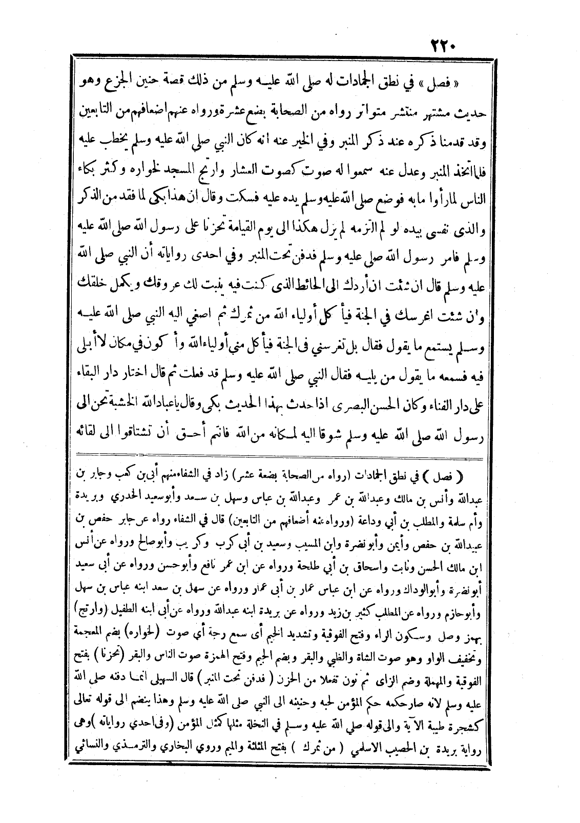 من ذلك قصة حنين الجزع وهو حديث مشتهر منتشر متواتر رواه من الصحابة بضع عشرة ورواه عنهم اضعافهم من التابعين وقد قدمنا ذكره عند ذكر المنبر وفي الخبر عنه انه كان النبي صلى الله عليه وسلم يخطب عليه فلما اتخذ المنبر وعدل عنه سمعوا له صوت كصوت العشار وارتج المسجد لخواره وكثر بكاء الناس لما رأوا ما به فوضع صلى الله عليه وسلم يده عليه فسكت وقال ان هذا بكى لما فقد من الذكر والذى نفسى بيده لو لم التزمه لم يزل هكذا الى يوم القيامة تحزنا على رسول الله صلى الله عليه وسلم فامر رسول الله صلى الله عليه وسلم فدفن تحت المنبر وفي احدى رواياته أن النبي صلى الله عليه وسلم قال ان شئت ان أردك الى الحائط الذى كنت فيه ينبت لك عروقك ويكمل خلقك وان شئت اغرسك في الجنة فيأكل أولياء الله من ثمرك ثم اصغي اليه النبي صلى الله عليه وسلم يستمع ما يقول فقال بل تغرسني في الجنة فيأكل منى أولياء الله وأكون في مكان لا أبلى فيه فسمعه ما يقول من يليه فقال النبي صلى الله عليه وسلم قد فعلت ثم قال اختار دار البقاء على دار الفناء وكان الحسن البصرى اذا حدث بهذا الحديث بكى وقال يا عباد الله الخشبة تحن الى رسول الله صلى الله عليه وسلم شوقا اليه لمكانه من الله فانتم أحق أن تشتاقوا الى لقائه (فصل) في نطق الجمادات (رواه من الصحابة بضعة عشر) زاد في الشفاء منهم أبى بن كعب وجابر بن عبد الله وأنس بن مالك وعبد الله بن عمر وعبد الله بن عباس وسهل بن سعد وأبو سعيد الخدري وبريدة وأم سلمة والمطلب بن أبي وداعة (ورواه عنه أضعافهم من التابعين) قال في الشفاء رواه عن جابر حفص بن عبيد الله بن حفص وأيمن وأبو نضرة وابن المسيب وسعيد بن أبى كرب وكريب وأبو صالح ورواه عن أنس ابن مالك الحسن وثابت واسحاق بن أبي طلحة ورواه عن ابن عمر نافع وأبو حسن ورواه عن أبى سعيد أبو نضرة وأبو الوداك ورواه عن ابن عباس عمار بن أبى عمار ورواه عن سهل بن سعد ابنه عباس بن سهل وأبو حازم ورواه عن المطلب كثير بن زيد ورواه عن بريدة ابنه عبد الله ورواه عن أبى ابنه الطفيل (وارتج) بهمز وصل وسكون الراء وفتح الفوقية وتشديد الجيم أى سمع رجة أي صوت (لخواره) يضم المعجمة وتخفيف الواو وهو صوت الشاة والظبي والبقر وبضم الجيم وفتح الهمزة صوت الناس والبقر (تحزنا) بفتح الفوقية والمهملة وضم الزاى ثم نون تفعلا من الحزن (فدفن تحت المنبر) قال السهيلى انما دفنه صلى الله عليه وسلم لانه صار حكمه حكم المؤمن لحبه وحنينه الى النبي صلى الله عليه وسلم وهذا ينضم الى قوله تعالى كَشَجَرَةٍ طَيِّبَةٍ الآية والى قوله صلى الله عليه وسلم في النخلة مثلها كمثل المؤمن (وفي احدي رواياته) وهى رواية بريدة بن الحصيب الاسلمي (من ثمرك) بفتح المثلثة والميم وروي البخاري والترمذي والنسائي