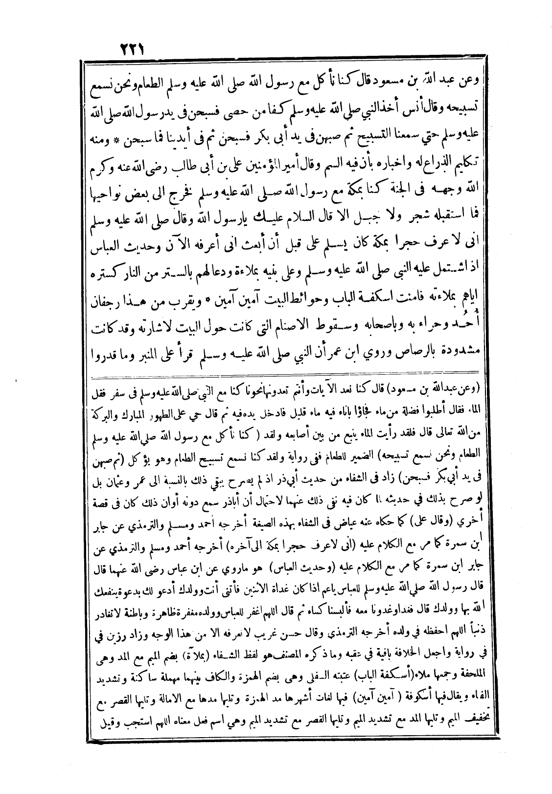 (وعن عبد الله بن مسعود) قال كنا نعد الآيات وأنتم تعدونها نحونا كنا مع النبى صلى الله عليه وسلم في سفر فقل الماء فقال أطلبوا فضلة من ماء فجاؤا باناء فيه ماء قليل فادخل يده فيه ثم قال حي على الطهور المبارك والبركة من الله تعالى قال فلقد رأيت الماء ينبع من بين أصابعه ولقد (كنا نأكل مع رسول الله صلى الله عليه وسلم الطعام ونحن نسمع تسبيحه) الضمير للطعام ففي رواية ولقد كنا نسمع تسبيح الطعام وهو يؤكل (ثم صبهن في يد أبي بكر فسبحن) زاد في الشفاء من حديث أبي ذر اذ لم يصرح يبقي ذلك بالنسبة الى عمر وعثمان بل لو صرح بذلك في حديثه لما كان فيه نفي ذلك عنهما لاحتمال أن أبا ذر سمع دونه أوان ذلك كان في قصة أخري (وقال على) كما حكاه عنه عياض في الشفاء بهذه الصيغة أخرجه أحمد ومسلم والترمذي عن جابر ابن سمرة كما مر مع الكلام عليه (انى لاعرف حجرا بمكة الى آخره) أخرجه أحمد ومسلم والترمذي عن جابر ابن سمرة كما مر مع الكلام عليه (وحديث العباس) هو ما روي عن ابن عباس رضى الله عنهما قال قال رسول الله صلى الله عليه وسلم للعباس يا عم اذا كان غداة الاثنين فأتنى أنت وولدك أدعو لك بدعوة ينفعك الله بها وولدك قال فغد او غدونا معه فألبسنا كساء ثم قال اللهم اغفر للعباس وولده مغفرة ظاهرة وباطنة لا تغادر ذنبا اللهم احفظه في ولده أخرجه الترمذي وقال حسن غريب لا نعرفه الا من هذا الوجه وزاد رزين في في رواية واجعل الخلافة باقية في عقبه وما ذكره المصنف هو لفظ الشفاء (بملآة) بضم الميم مع المد وهى الملحفة وجمعها ملاء (أسكفة الباب) عتبته السفلى وهى بضم الهمزة والكاف بينهما مهملة ساكنة وتشديد الفاء ويقال فيها أسكوفة (آمين آمين) فيها لغات أشهرها مد الهمزة وتليها مدها مع الامالة وتليها القصر مع تخفيف الميم وتليها المد مع تشديد الميم وتليها القصر مع تشديد الميم وهي اسم فعل معناه اللهم استجب وقيل