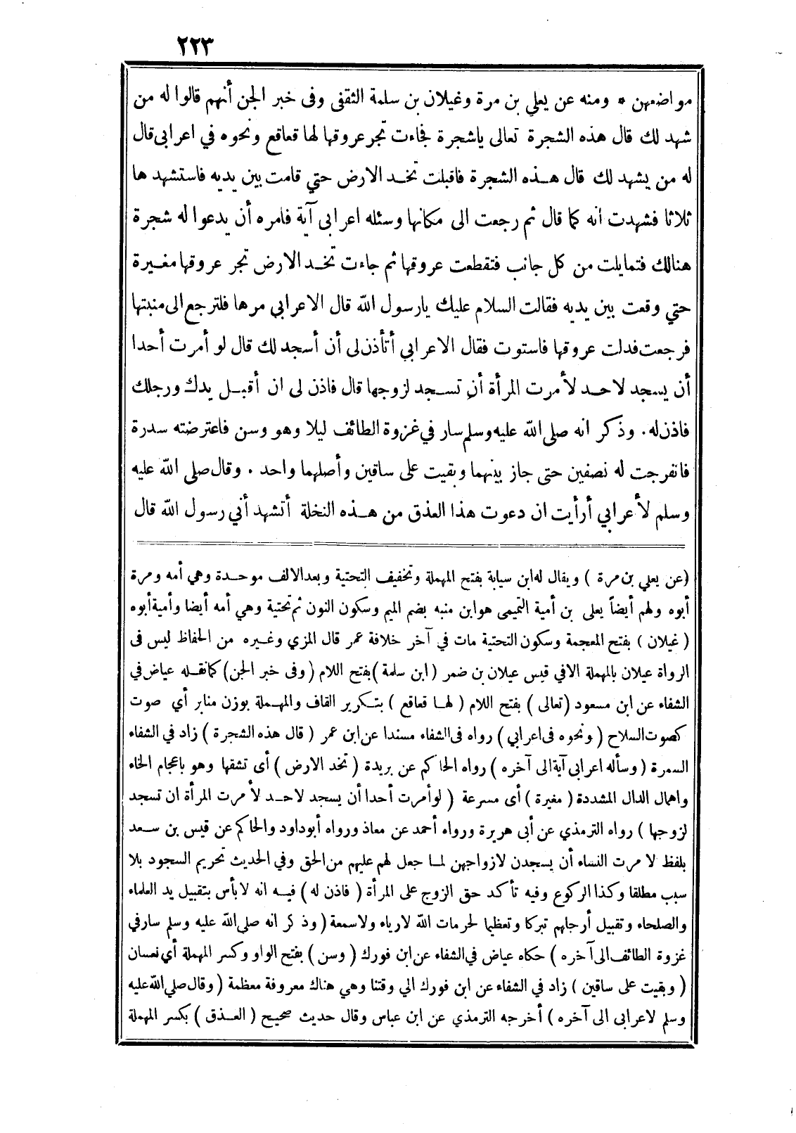 مواضعهن* ومنه عن يعلي بن مرة وغيلان بن سلمة الثقفي وفي خبر الجن أنهم قالوا له من شهد لك قال هذه الشجرة تعالى يا شجرة فجاءت تجر عروقها لها قعاقع ونحوه في اعرابي قال له من يشهد لك قال هذه الشجرة فاقبلت تخد الارض حتى قامت بين يديه فاستشهدها ثلاثا فشهدت انه كما قال ثم رجعت الى مكانها وسئله اعرابى آية فامره أن يدعوا له شجرة هنالك فتمايلت من كل جانب فتقطعت عروقها ثم جاءت تخد الارض تجر عروقها مغيرة حتي وقعت بين يديه فقالت السلام عليك يا رسول الله قال الاعرابي مرها فلترجع الى منبتها فرجعت فدلت عروقها فاستوت فقال الاعرابي أتأذن لى أن أسجد لك قال لو أمرت أحدا أن يسجد لاحد لأمرت المرأة أن تسجد لزوجها قال فاذن لى ان أقبل يدك ورجلك فاذن له. وذكر انه صلى الله عليه وسلم سار في غزوة الطائف ليلا وهو وسن فاعترضته سدرة فانفرجت له نصفين حتى جاز بينهما وبقيت على ساقين وأصلهما واحد. وقال صلى الله عليه وسلم لأعرابي أرأيت ان دعوت هذا العذق من هذه النخلة أتشهد أني رسول الله قال (عن يعلي بن مرة) ويقال له ابن سيابة بفتح المهملة وتخفيف التحتية وبعد الالف موحدة وهي أمه ومرة أبوه ولهم أيضا يعلى بن أمية التميمى هو ابن منبه بضم الميم وسكون النون ثم تحتية وهي أمه أيضا وأمية أبوه (غيلان) بفتح المعجمة وسكون التحتية مات في آخر خلافة عمر قال المزي وغيره من الحفاظ ليس في الرواة عيلان بالمهملة الا في قيس عيلان بن ضمر (ابن سلمة) بفتح اللام (وفي خبر الجن) كما نقله عياض في الشفاء عن ابن مسعود (تعالى) بفتح اللام (لها قعاقع) بتكرير القاف والمهملة بوزن منابر أي صوت كصوت السلاح (ونحوه في اعرابي) رواه في الشفاء مسندا عن ابن عمر (قال هذه الشجرة) زاد في الشفاء السمرة (وسأله اعرابى آية الى آخره) رواه الحاكم عن بريدة (تخد الارض) أى تشقها وهو باعجام الخاء واهمال الدال المشددة (مغيرة) أى مسرعة (لو أمرت أحدا أن يسجد لاحد لأمرت المرأة ان تسجد لزوجها) رواه الترمذي عن أبى هريرة ورواه أحمد عن معاذ ورواه أبو داود والحاكم عن قيس بن سعد بلفظ لا مرت النساء أن يسجدن لازواجهن لما جعل لهم عليهم من الحق وفي الحديث تحريم السجود بلا سبب مطلقا وكذا الركوع وفيه تأكد حق الزوج على المرأة (فاذن له) فيه انه لا بأس بتقبيل يد العلماء والصلحاء وتقبيل أرجلهم تبركا وتعظيما لحرمات الله لا رياء ولا سمعة (وذكر انه صلى الله عليه وسلم سار في غزوة الطائف الى آخره) حكاه عياض في الشفاء عن ابن فورك (وسن) بفتح الواو وكسر المهملة أي نعسان (وبقيت على ساقين) زاد في الشفاء عن ابن فورك الي وقتنا وهي هناك معروفة معظمة (وقال صلى الله عليه وسلم لاعرابى الى آخره) أخرجه الترمذي عن ابن عباس وقال حديث صحيح (العذق) بكسر المهملة