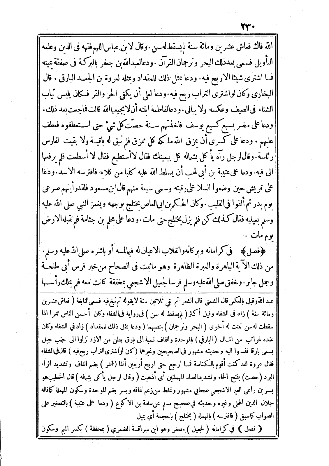 من ذلك الآية الباهرة والعبرة الظاهرة وهو ما ثبت في الصحاح من خبر فرس أبى طلحة وجمل جابر. وخفق صلى الله عليه وسلم فرسا لجعيل الاشجعي بمخفقة كانت معه فلم يملك رأسها عبد الله وقيل بالعكس قال الشمنى قال الشعر ثم بقي ثلاثين سنة لا يقوله ثم نبغ فيه فسمى النابغة (فعاش عشرين ومائة سنة) زاد في الشفاء وقيل أكثر (لم يسقط له سن) في رواية في الشفاء وكان أحسن الناس ثغرا اذا سقطت له سن نبتت له أخرى (البحر وترجمان) بنصبهما (ودعا بمثل ذلك للمقداد) زاد في الشفاء وكان عنده غرائب من المال (البارقي) بالموحدة والقاف نسبة الى بارق بطن من الازد نزلوا الى جنب جبل يسمى بارقا فنسبوا اليه وحديثه مشهور في الصحيحين وغيرهما (كان لو اشترى التراب ربح فيه) قال في الشفاء فقال عروة لقد كنت أقوم بالكناسة فما ارجع حتى اربح أربعين ألفا (القر) بضم القاف وتشديد الراء البرد (حصت) بفتح الحاء وتشديد الصاد المهملتين أي أذهبت (وقال لرجل يأكل بشماله) قال الخطيب هو بسر بن راعى العير الاشجعي صحابي مشهور وغلط من زعم نفاقه وبسر بضم الموحدة وسكون المهملة كما قاله جلال الدين المحلى وغيره وحديثه في صحيح مسلم عن سلمة بن الأكوع (ودعا على عتيبة) بالتصغير على الصواب كما سبق (فافترسه) بالمهملة (يختلج) بالمعجمة أي يميل.