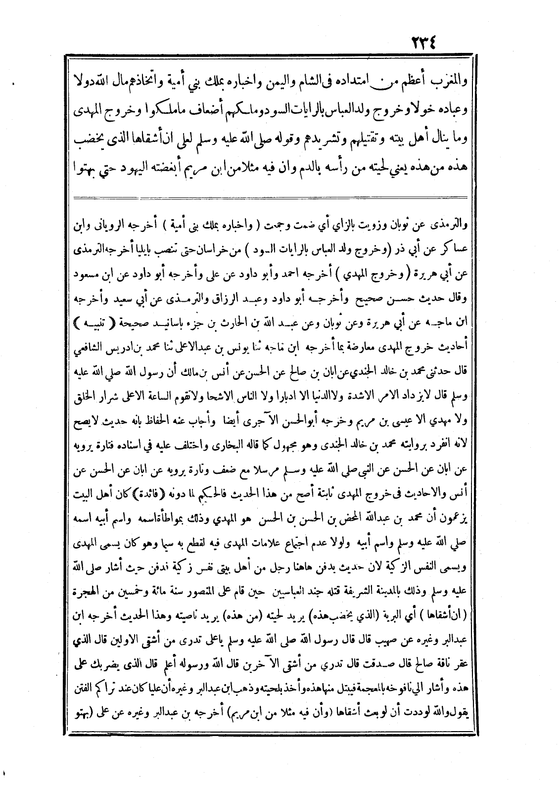 والمغرب أعظم من امتداده في الشام واليمن واخباره بملك بني أمية واتخاذهم مال الله دولا وعباده خولا وخروج ولد العباس بالرايات السود وملكهم أضعاف ما ملكوا وخروج المهدى وما ينال أهل بيته وتقتيلهم وتشريدهم وقوله صلى الله عليه وسلم لعلى ان أشقاها الذى يخضب هذه من هذه يعني لحيته من رأسه بالدم وان فيه مثلا من ابن مريم أبغضته اليهود حتى بهتوا والترمذى عن ثوبان وزويت بالزاي أي ضمت وجمعت (واخباره بملك بنى أمية) أخرجه الرويانى وابن عساكر عن أبي ذر (وخروج ولد العباس بالرايات السود) من خراسان حتى تنصب بايليا أخرجه الترمذى عن أبي هريرة (وخروج المهدي) أخرجه احمد وأبو داود عن على وأخرجه أبو داود عن ابن مسعود وقال حديث حسن صحيح وأخرجه أبو داود وعبد الرزاق والترمذى عن أبي سعيد وأخرجه ابن ماجه عن أبي هريرة وعن ثوبان وعن عبد الله بن الحارث بن جزء باسانيد صحيحة (تنبيه) أحاديث خروج المهدى معارضة بما أخرجه ابن ماجه ثنا يونس بن عبد الاعلى ثنا محمد بن ادريس الشافعي قال حدثنى محمد بن خالد الجندي عن ابان بن صالح عن الحسن عن أنس بن مالك أن رسول الله صلى الله عليه وسلم قال لا يزداد الامر الاشدة ولا الدنيا الا ادبارا ولا الناس الا شحا ولا تقوم الساعة الاعلى شرار الخلق ولا مهدي الا عيسى بن مريم وخرجه أبو الحسن الآجرى أيضا وأجاب عنه الحفاظ بانه حديث لا يصح لانه انفرد بروايته محمد بن خالد الجندى وهو مجهول كما قاله البخارى واختلف عليه في اسناده فتارة يرويه عن ابان عن الحسن عن النبي صلى الله عليه وسلم مرسلا مع ضعف وتارة برويه عن ابان عن الحسن عن أنس والاحاديث في خروج المهدى ثابتة أصح من هذا الحديث فالحكم لما دونه (فائدة) كان أهل البيت يزعمون أن محمد بن عبد الله المحض بن الحسن بن الحسن هو المهدي وذلك بمواطأة اسمه واسم أبيه اسمه صلى الله عليه وسلم واسم أبيه ولولا عدم اجتماع علامات المهدى فيه لقطع به سيما وهو كان يسمى المهدى ويسمى النفس الزكية لان حديث يدفن هاهنا رجل من أهل بيتى نفس زكية فدفن حيث أشار صلى الله عليه وسلم وذلك بالمدينة الشريفة قتله جند العباسيين حين قام على المنصور سنة مائة وخمسين من الهجرة (ان أشقاها) أي البرية (الذي يخضب هذه) يريد لحيته (من هذه) يريد ناصيته وهذا الحديث أخرجه ابن عبد البر وغيره عن صهيب قال قال رسول الله صلى الله عليه وسلم يا على تدرى من أشقى الاولين قال الذي عقر ناقة صالح قال صدقت قال تدري من أشقى الآخرين قال الله ورسوله أعلم قال الذى يضربك على هذه وأشار الي نافوخه بالمعجمة فيبتل منها هذه وأخذ بلحيته وذهب ابن عبد البر وغيره أن عليا كان عند تراكم الفتن يقول والله لوددت أن لو بعث أشقاها (وأن فيه مثلا من ابن مريم) أخرجه بن عبد البر وغيره عن على (بهتو