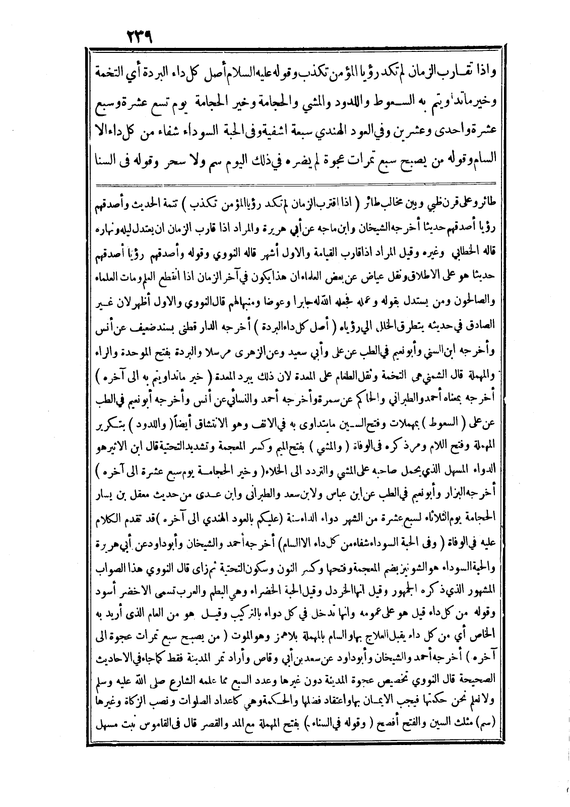 واذا تقارب الزمان لم تكد رؤيا المؤمن تكذب وقوله عليه السلام أصل كل داء البردة أي التخمة وخير ما تداويتم به السعوط واللدود والمشي والحجامة وخير الحجامة يوم تسع عشرة وسبع عشرة واحدى وعشرين وفي العود الهندي سبعة اشفية وفي الحبة السوداء شفاء من كل داء الا السام وقوله من يصبح سبع تمرات عجوة لم يضره في ذلك اليوم سم ولا سحر وقوله في السنا طائر وعلى قرن ظبي وبين مخالب طائر (اذا اقترب الزمان لم تكد رؤيا المؤمن تكذب) تتمة الحديث وأصدقهم رؤيا أصدقهم حديثا أخرجه الشيخان وابن ماجه عن أبي هريرة والمراد اذا قارب الزمان ان يعتدل ليله ونهاره قاله الخطابي وغيره وقيل المراد اذا قارب القيامة والاول أشهر قاله النووي وقوله وأصدقهم رؤيا أصدقهم حديثا هو على الاطلاق ونقل عياض عن بعض العلماء ان هذا يكون في آخر الزمان اذا انقطع العلم ومات العلماء والصالحون ومن يستدل بقوله وعمله فجعله الله له جابرا وعوضا ومنبها لهم قال النووي والاول أظهر لان غير الصادق في حديثه يتطرق الخلل الي رؤياه (أصل كل داء البردة) أخرجه الدار قطنى بسند ضعيف عن أنس وأخرجه ابن السني وأبو نعيم في الطب عن على وأبي سعيد وعن الزهرى مرسلا والبردة بفتح الموحدة والراء والمهملة قال الشمني هى التخمة وثقل الطعام على المعدة لان ذلك يبرد المعدة (خير ما تداويتم به الى آخره) أخرجه بمعناه أحمد والطبراني والحاكم عن سمرة وأخرجه أحمد والنسائي عن أنس وأخرجه أبو نعيم في الطب عن على (السعوط) بمهملات وفتح السين ما يتداوى به في الانف وهو الانتشاق أيضا (واللدود) بتكرير المهملة وفتح اللام ومر ذكره في الوفاة (والمشي) بفتح الميم وكسر المعجمة وتشديد التحتية قال ابن الاثير هو الدواء المسهل الذي يحمل صاحبه على المشي والتردد الى الخلاء (وخير الحجامة يوم سبع عشرة الى آخره) أخرجه البزار وأبو نعيم في الطب عن ابن عباس ولابن سعد والطبرانى وابن عدى من حديث معقل بن يسار الحجامة يوم الثلاثاء لسبع عشرة من الشهر دواء الداء سنة (عليكم بالعود الهندي الى آخره) قد تقدم الكلام عليه في الوفاة (وفي الحبة السوداء شفاء من كل داء الا السام) أخرجه أحمد والشيخان وأبو داود عن أبي هريرة والحبة السوداء هو الشونيز بضم المعجمة وفتحها وكسر النون وسكون التحتية ثم زاى قال النووي هذا الصواب المشهور الذي ذكره الجمهور وقيل انها الخردل وقيل الحبة الخضراء وهي البطم والعرب تسمى الاخضر أسود وقوله من كل داء قيل هو على عمومه وانها تدخل في كل دواء بالتركيب وقيل هو من العام الذى أريد به الخاص أي من كل داء يقبل العلاج بها والسام بالمهملة بلا همز وهو الموت (من يصبح سبع تمرات عجوة الى آخره) أخرجه أحمد والشيخان وأبو داود عن سعد بن أبي وقاص وأراد تمر المدينة فقط كما جاء في الاحاديث الصحيحة قال النووي تخصيص عجوة المدينة دون غيرها وعدد السبع مما علمه الشارع صلى الله عليه وسلم ولا نعلم نحن حكمتها فيجب الايمان بها واعتقاد فضلها والحكمة وهي كاعداد الصلوات ونصب الزكاة وغيرها (سم) مثلث السين والفتح أفصح (وقوله في السناء) بفتح المهملة مع المد والقصر قال في القاموس بنت مسهل
