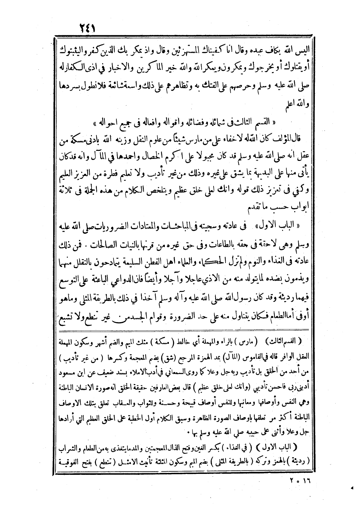 «الباب الاول» في عادته وسجيته في المباحثات والمعتادات الضروريات صلى الله عليه وسلم وهى لا حقة في حقه بالطاعات وفي حق غيره من قرنها بالنيات الصالحات. فمن ذلك عادته في الغذاء والنوم ولم تزل الحكماء والعلماء اهل الفطن السليمة يتمادحون بالتقلل منهما ويذمون بضده لما يتولد منه من الاذي عاجلا وآجلا وأيضا فان الدواعي الباعثة على التوسع فيهما رديئة وقد كان رسول الله صلى الله عليه وآله وسلم آخذا في ذلك بالطريقة المثلى وما هو أو في أما الطعام فكان يتناول منه على حد الضرورة وقوام الجسد من غير تنطع ولا تشبع (القسم الثالث) (مارس) بالراء والمهملة أي خالط (مسكة) مثلث الميم والضم أشهر وسكون المهملة العقل الوافر قاله في القاموس (المآل) بمد الهمزة المرجع (شق) بضم المعجمة وكسرها (من غير تأديب) من أحد من الخلق بل تأديب ربه جل وعلا كما روى السمعاني في أدب الاملاء بسند ضعيف عن ابن مسعود أدبنى ربى فاحسن تأديبي (وانك لعلى خلق عظيم) قال بعض العارفين حقيقة الخلق انه صورة الانسان الباطنة وهي النفس وأوصافها ومعانيها وللنفس أوصاف قبيحة وحسنة وللثواب والعقاب تعلق بتلك الاوصاف الباطنة أكثر مر تعلقها باوصاف الصورة الظاهرة وسبق الكلام أول الخطبة على الخلق العظيم التي أرادها جل وعلا وأثنى على حبيبه صلى الله عليه وسلم بها.