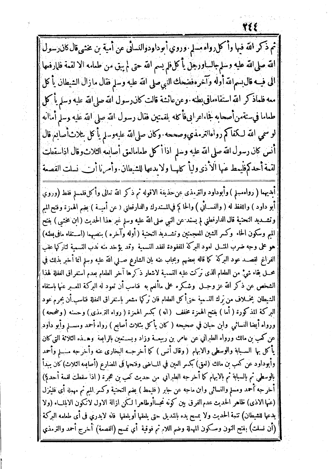 ثم ذكر الله فيها وأكل رواه مسلم. وروي أبو داود والنسائى عن أمية بن مخشى قال كان رسول الله صلى الله عليه وسلم جالسا ورجل يأكل فلم يسم الله حتى لم يبق من طعامه الا لقمة فلما رفعها الى فيه قال بسم الله أوله وآخره فضحك النبي صلى الله عليه وسلم فقال ما زال الشيطان يأكل معه فلما ذكر الله استقاء ما في بطنه. وعن عائشة قالت كان رسول الله صلى الله عليه وسلم يأكل طعاما في ستة من أصحابه فجاء اعرابى فأكله بلقمتين فقال رسول الله صلى الله عليه وسلم أما انه لو سمي الله لكفاكم رواه الترمذي وصححه. وكان صلى الله عليه وسلم يأكل بثلاث أصابع قال أنس كان رسول الله صلى الله عليه وسلم اذا أكل طعاما لعق أصابعه الثلاث وقال اذا سقطت لقمة أحدكم فليمط عنها الأذى وليأكلها ولا يدعها للشيطان. وأمرنا أن نسلت القصعة أيديهما (رواه مسلم) وأبو داود والترمذى عن حذيفة الا قوله ثم ذكر الله تعالى وأكل فلمسلم فقط (وروي أبو داود) واللفظ له (والنسائي) والحاكم في المستدرك والدارقطني (عن أمية) بضم الهمزة وفتح الميم وتشديد التحتية قال الدارقطني لم يسند عن النبي صلى الله عليه وسلم غير هذا الحديث (ابن مخشي) بفتح الميم وسكون الخاء وكسر الشين المعجمتين وتشديد التحتية (أوله وآخره) بنصبهما (استقاء ما في بطنه) هو على وجه ضرب المثل لعود البركة المفقودة لفقد التسمية وقد يؤخد منه ندب التسمية لتاركها عقب الفراغ لقصد عود البركة كما قاله بعضهم ويجاب عنه بان الشارع صلى الله عليه وسلم انما أخبر بذلك في محل بقاء شيء من الطعام الذى تركت عليه التسمية لاشعار ذكرها آخر الطعام بعدم استغراق الغفلة لهذا الشخص عن ذكر الله عز وجل وشكره على ما أنعم به فناسب أن تعود له البركة المعبر عنها باستقاء الشيطان بخلاف من ترك التسمية حتى أكل الطعام فان تركها مشعر باستغراق الغفلة فناسب أن يحرم عود البركة المذكورة (أما) بفتح الهمزة مخفف (انه) بكسر الهمزة (رواه الترمذى) وحسنه (وصححه) ورواه أيضا النسائي وابن حبان في صحيحه (كان يأكل بثلاث أصابع) رواه أحمد ومسلم وأبو داود عن كعب بن مالك ورواه الطبراني عن عامر بن ربيعة وزاد ويستعين بالرابعة وهذه الثلاثة التي كان يأكل بها السبابة والوسطى والابهام (وقال أنس) كما أخرجه البخارى عنه وأخرجه مسلم وأحمد وأبو داود عن كعب بن مالك (لعق) بكسر العين في الماضى وفتحها في المضارع (أصابعه الثلاث) كان يبدأ بالوسطي ثم بالسبابة ثم بالابهام كما أخرجه الطبراني من حديث كعب بن عجرة (اذا سقطت لقمة أحدكم) أخرجه أحمد ومسلم والنسائى وابن ماجه عن جابر (فليمط) بضم التحتية وكسر الميم ثم مهملة أى فلينزل (عنها الاذى) ظاهر الحديث عدم الفرق بين كونه نجسا أو طاهرا لكن ازالة الاول لا تكون الا بالماء (ولا يدعها للشيطان) تتمة الحديث ولا يمسح يده بالمنديل حتى يلعقها أو يلعقها فانه لا يدري في أى طعامه البركة (أن نسلت) بفتح النون وسكون المهملة وضم اللام ثم فوقية أي نمسح (القصعة) أخرج أحمد والترمذي