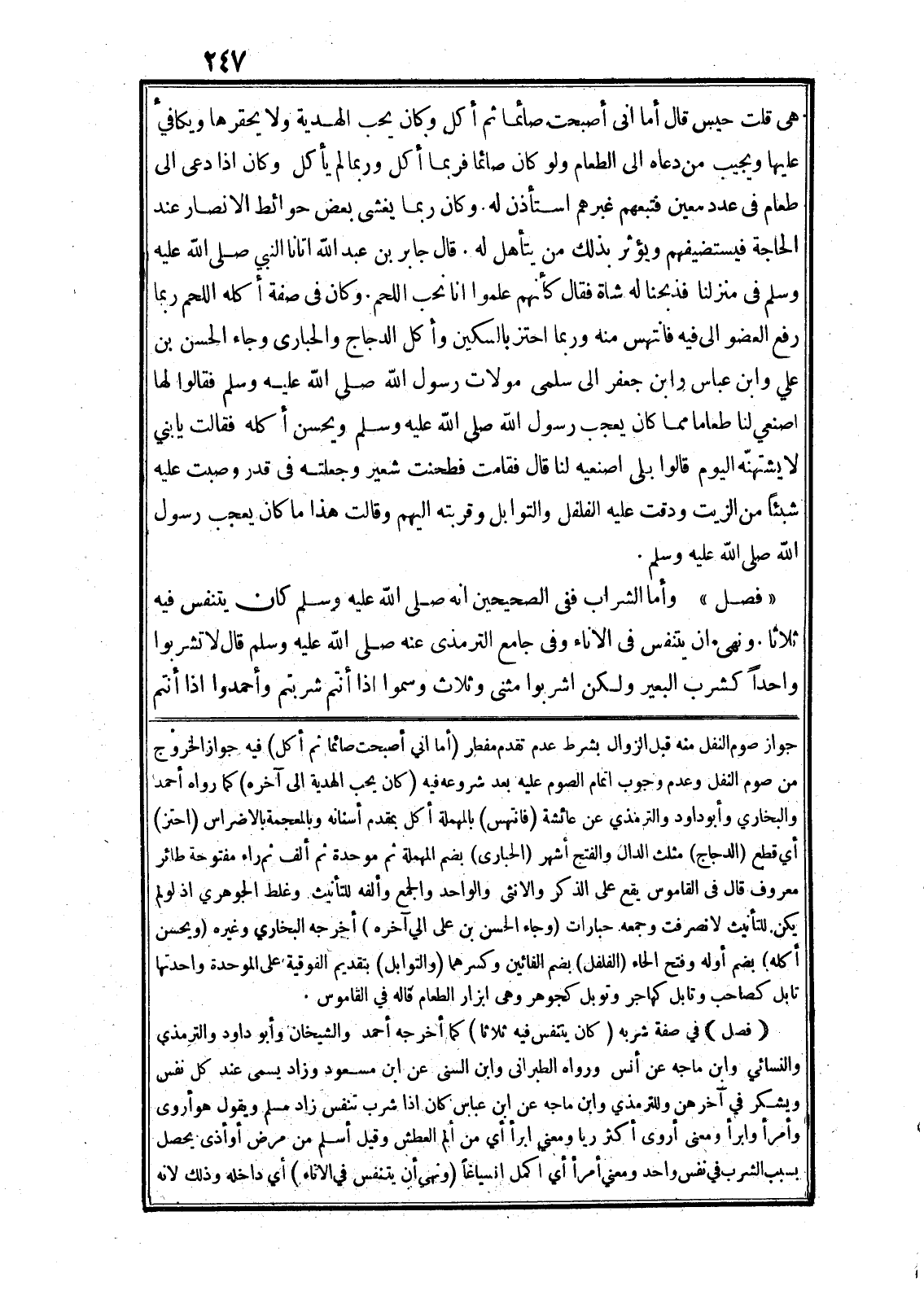 «فصل» وأما الشراب ففي الصحيحين انه صلى الله عليه وسلم كان يتنفس فيه ثلاثا. ونهى. ان يتنفس في الاناء وفي جامع الترمذى عنه صلى الله عليه وسلم قال لا تشربوا واحدا كشرب البعير ولكن اشربوا مثنى وثلاث وسموا اذا أنتم شربتم وأحمدوا اذا أنتم جواز صوم النفل منه قبل الزوال بشرط عدم تقدم مفطر (أما اني أصبحت صائما ثم أكل) فيه جواز الخروج من صوم النفل وعدم وجوب اتمام الصوم عليه بعد شروعه فيه (كان يحب الهدية الى آخره) كما رواه أحمد والبخاري وأبو داود والترمذي عن عائشة (فانتهس) بالمهملة أكل بمقدم أسنانه وبالمعجمة بالاضراس (احتز) أي قطع (الدجاج) مثلث الدال والفتح أشهر (الحبارى) بضم المهملة ثم موحدة ثم ألف ثم راء مفتوحة طائر معروف قال في القاموس يقع على الذكر والانثى والواحد والجمع وألفه للتأنيث. وغلط الجوهري اذ لو لم يكن. للتأنيث لا نصرفت وجمعه. حبارات (وجاء الحسن بن على الي آخره) أخرجه البخاري وغيره (ويحسن أكله) بضم أوله وفتح الحاء (الفلفل) بضم الفائين وكسرهما (والتوابل) بتقديم الفوقية على الموحدة واحدتها تابل كصاحب وتابل كهاجر وتوبل كجوهر وهى ابزار الطعام قاله في القاموس.