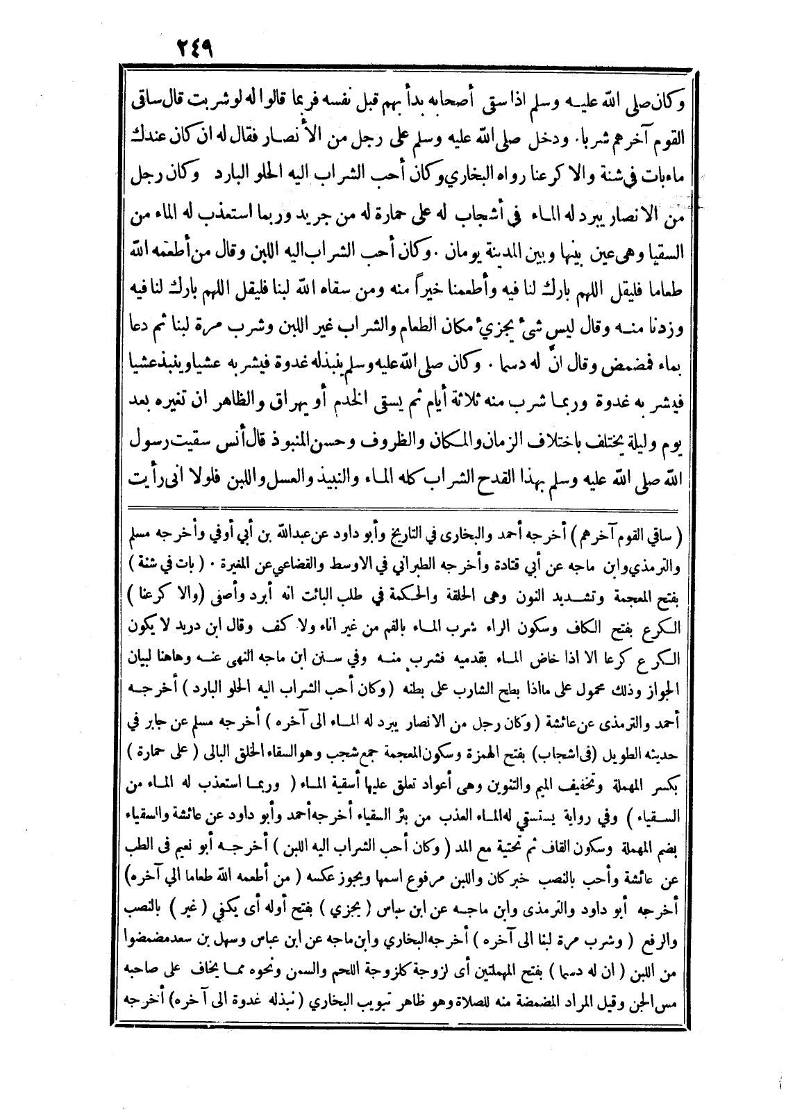 وكان صلى الله عليه وسلم اذا سقى أصحابه بدأ بهم قبل نفسه فربما قالوا له لو شربت قال ساقى القوم آخرهم شربا. ودخل صلى الله عليه وسلم على رجل من الأنصار فقال له ان كان عندك ماء بات في شنة والا كرعنا رواه البخاري وكان أحب الشراب اليه الحلو البارد وكان رجل من الانصار يبرد له الماء في أشجاب له على حمارة له من جريد وربما استعذب له الماء من السقيا وهى عين بينها وبين المدينة يومان. وكان أحب الشراب اليه اللبن وقال من أطعمه الله طعاما فليقل اللهم بارك لنا فيه وأطعمنا خيرا منه ومن سقاه الله لبنا فليقل اللهم بارك لنا فيه وزدنا منه وقال ليس شيء يجزيء مكان الطعام والشراب غير اللبن وشرب مرة لبنا ثم دعا بماء فمضمض وقال انّ له دسما. وكان صلى الله عليه وسلم ينبذله غدوة فيشربه عشيا وينبذ عشيا فيشربه غدوة وربما شرب منه ثلاثة أيام ثم يسقى الخدم أو يهراق والظاهر ان تغيره بعد يوم وليلة يختلف باختلاف الزمان والمكان والظروف وحسن المنبوذ قال أنس سقيت رسول الله صلى الله عليه وسلم بهذا القدح الشراب كله الماء والنبيذ والعسل واللبن فلولا انى رأيت (ساقي القوم آخرهم) أخرجه أحمد والبخارى في التاريخ وأبو داود عن عبد الله بن أبي أوفي وأخرجه مسلم والترمذي وابن ماجه عن أبي قتادة وأخرجه الطبراني في الاوسط والقضاعي عن المغيرة. (بات في شنة) بفتح المعجمة وتشديد النون وهى الحلقة والحكمة في طلب البائت انه أبرد وأصفي (والا كرعنا) الكرع بفتح الكاف وسكون الراء شرب الماء بالفم من غير اناء ولا كف وقال ابن دريد لا يكون الكرع كرعا الا اذا خاض الماء بقدميه فشرب منه وفي سنن ابن ماجه النهى عنه وهاهنا لبيان الجواز وذلك محمول على ما اذا بطح الشارب على بطنه (وكان أحب الشراب اليه الحلو البارد) أخرجه أحمد والترمذى عن عائشة (وكان رجل من الانصار يبرد له الماء الى آخره) أخرجه مسلم عن جابر في حديثه الطويل (في اشجاب) بفتح الهمزة وسكون المعجمة جمع شجب وهو السقاء الخلق البالى (على حمارة) بكسر المهملة وتخفيف الميم والتنوين وهى أعواد تعلق عليها أسقية الماء (وربما استعذب له الماء من السقياء) وفي رواية يستسقي له الماء العذب من بئر السقياء أخرجه أحمد وأبو داود عن عائشة والسقياء بضم المهملة وسكون القاف ثم تحتية مع المد (وكان أحب الشراب اليه اللبن) أخرجه أبو نعيم في الطب عن عائشة وأحب بالنصب خبر كان واللبن مرفوع اسمها ويجوز عكسه (من أطعمه الله طعاما الى آخره) أخرجه أبو داود والترمذى وابن ماجه عن ابن عباس (يجزي) بفتح أوله أى يكفي (غير) بالنصب والرفع (وشرب مرة لبنا الى آخره) أخرجه البخاري وابن ماجه عن ابن عباس وسهل بن سعد مضمضوا من اللبن (ان له دسما) بفتح المهملتين أى لزوجة كلزوجة اللحم والسمن ونحوه مما يخاف على صاحبه مس الجن وقيل المراد المضمضة منه للصلاة وهو ظاهر تبويب البخاري (نبذله عدوة الى آخره) أخرجه