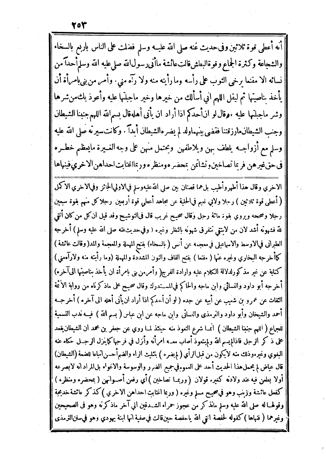 أنه أعطى قوة ثلاثين وفي حديث عنه صلى الله عليه وسلم فضلت على الناس باربع بالسخاء والشجاعة وكثرة الجماع وقوة البطش قالت عائشة ما أتى رسول الله صلى الله عليه وسلم أحدا من نسائه الا مقنعا يرخى الثوب على رأسه وما رأيته منه ولا رآه مني. وأمر من بنى بامرأة أن يأخذ بناصيتها ثم ليقل اللهم اني أسألك من خيرها وخير ماجبلتها عليه وأعوذ بك من شرها وشر ما جبلتها عليه. وقال لو ان أحدكم اذا أراد ان يأتى أهله قال بسم الله اللهم جنبنا الشيطان وجنب الشيطان ما رزقتنا فقضى بينهما ولد لم يضره الشيطان أبدا. وكانت سيرته صلى الله عليه وسلم مع أزواجه يلطف بهن ويلاطفهن ويحتمل منهن على وجه الغيرة ما يعظم خطره في حق غيرهن فربما تصاخبن وتشاتمن بمحضره ومنظره وربما اغتابت احداهن الاخري فينهاها الاخري وقال هذا أطهر وأطيب بل هما قصتان بين صلى الله عليه وسلم في الاولي الجائز وفي الاخري الاكمل (أعطى قوة ثلاثين) رجلا ولابي نعيم في الحلية عن مجاهد أعطي قوة أربعين رجلا كل منهم بقوة سبعين رجلا وصححه ويروي بقوة مائة رجل وقال صحيح غريب قال في التوشيح وقد قيل ان كل من كان أتقي لله فشهوته أشد لان من لا يتقي تتفرق شهوته بالنظر وغيره (وفي حديث عنه صلى الله عليه وسلم) أخرجه الطبرانى في الاوسط والاسماعيلى في معجمه عن أنس (بالسخاء) بفتح المهملة والمعجمة والمد (وقالت عائشة) كما أخرجه البخاري وغيره عنها (مقنعا) بفتح القاف والنون المشددة والمهملة (وما رأيته منه ولا رآه مني) كناية عن غير مذكور لدلالة الكلام عليه وارادة الفرج (وأمر من بنى بامرأة ان يأخذ بناصيتها الى آخره) أخرجه أبو داود والنسائي وابن ماجه والحاكم في المستدرك وقال صحيح على ما ذكرناه من رواية الأئمة الثقات عن عمرو بن شعيب عن أبيه عن جده (لو أن أحدكم اذا أراد ان يأتى أهله الى آخره) أخرجه أحمد والشيخان وأبو داود والترمذى والنسائى وابن ماجه عن ابن عباس (بسم الله) فيه ندب التسمية للجماع (اللهم جنبنا الشيطان) انما شرع التعوذ منه حينئذ لما روي عن جعفر بن محمد ان الشيطان يقعد على ذكر الرجل فاذا لم يسم الله ولم يتعوذ أصاب معه امرأته وأنزل في فرجها كما ينزل الرجل حكاه عنه البغوي وغيره وذلك منه لا يكون من قبل الرأي (لم يضره) بتثليث الراء والضم أحسن اتباعا للضمة (الشيطان) قال عياض لم يحمل هذا الحديث أحد على العموم في جميع الضرر والوسوسة والاغواء بل المراد انه لا يصرعه أولا يطعن فيه عند ولادته كغيره قولان (وربما تصاخبن) أي رفعن أصواتهن (بمحضره ومنظره) كفعل عائشة وزينب وهو في صحيح مسلم وغيره (وربما اغتابت احداهن الاخري) كذكر عائشة خديجة وقولها له صلى الله عليه وسلم ما تذكر من عجوز حمراء الشدقين الي آخر ما ذكرته وهو في الصحيحين وغيرهما (فنهاها) كقوله لحفصة اتقي الله يا حفصة حين قالت في صفية انها ابنة يهودي وهو في سنن الترمذى