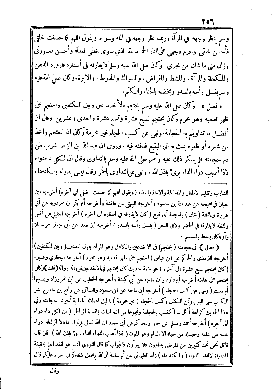 «فصل» وكان صلى الله عليه وسلم يحتجم بالأخد عين وبين الكتفين واحتجم على ظهر قدميه وهو محرم وكان يحتجم لسبع عشرة وتسع عشرة واحدى وعشرين وقال ان أفضل ما تداويتم به الحجامة. ونهى عن كسب الحجام غير محرمة وكان اذا احتجم واخذ من شعره أو ظفره بعث به الى البقيع فدفنه فيه. وروى ان عبد الله بن الزبير شرب من دم حجامته. فلم ينكر ذلك عليه وأمر صلى الله عليه وسلم بالتداوى وقال ان لكل داء دواء فاذا أصيب دواء الداء برئ باذن الله. ونهى عن التداوى بالخمر وقال ليس بدواء ولكنه داء الشارب وتقليم الاظفار والمصافحة والاخذ والعطاء (ويقول اللهم كما حسنت خلقى الي آخره) أخرجه ابن حبان في صحيحه عن عبد الله بن مسعود وأخرجه البيهقى عن عائشة وأخرجه أبو بكر بن مردويه عن أبي هريرة وعائشة (شان) بالمعجمة أى قبح (كان لا يفارقه في اسفاره الى آخره) أخرجه العقيلي عن أنس ولفظه لا يفارقه في الحضر ولا في السفر (يغسل رأسه بالسدر) أخرجه ابن سعد عن أبى جعفر مرسلا وأوله كان يسعط بالسمسم.